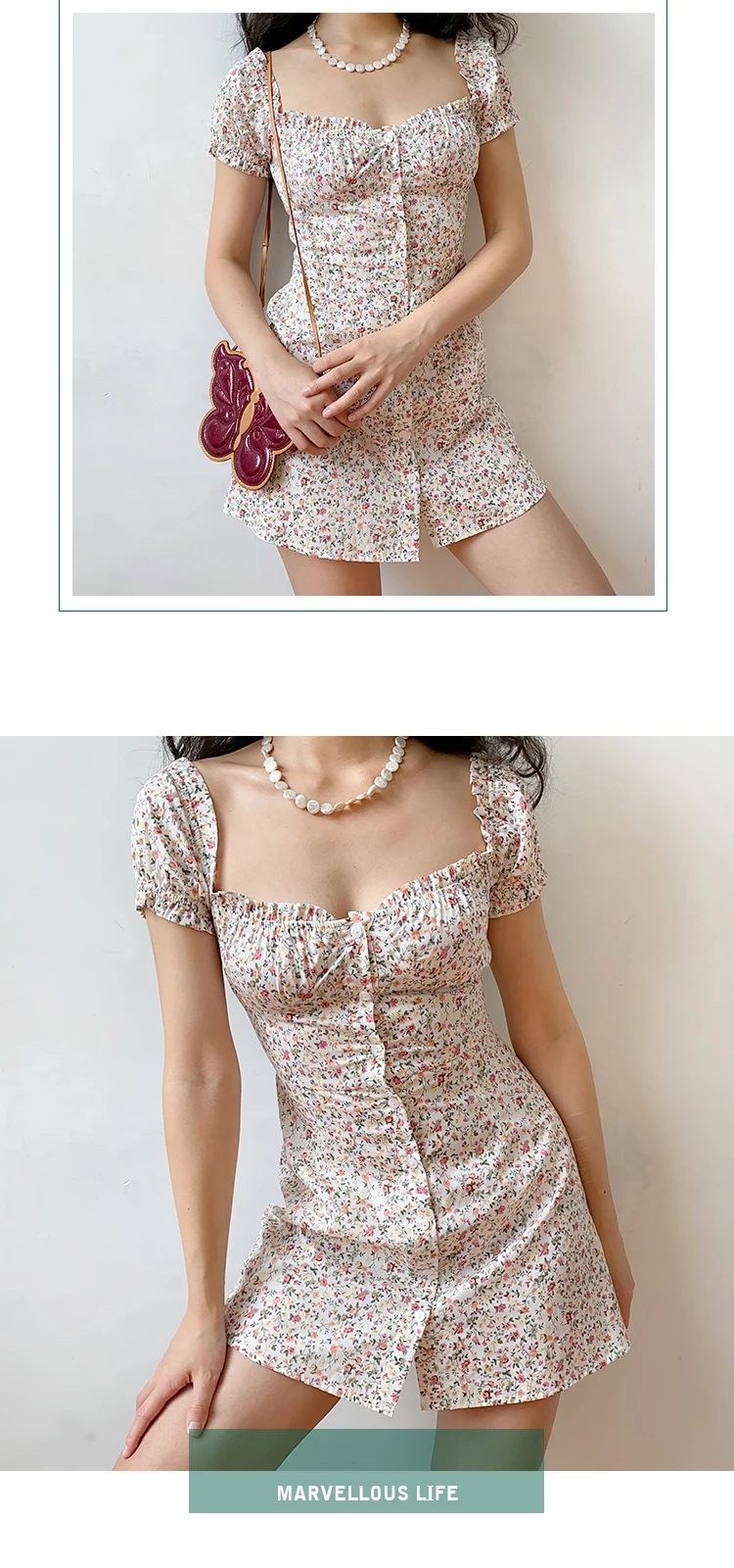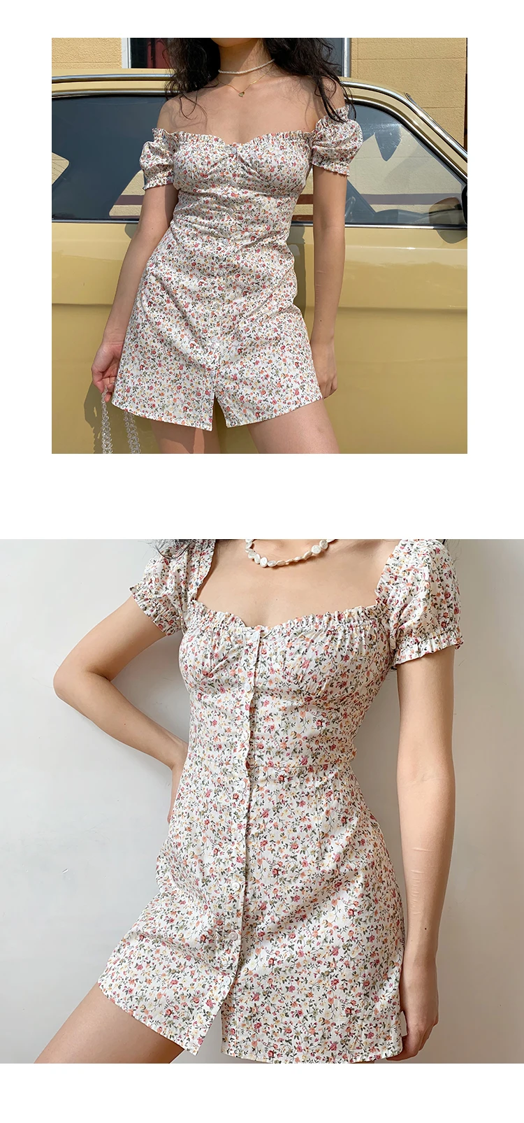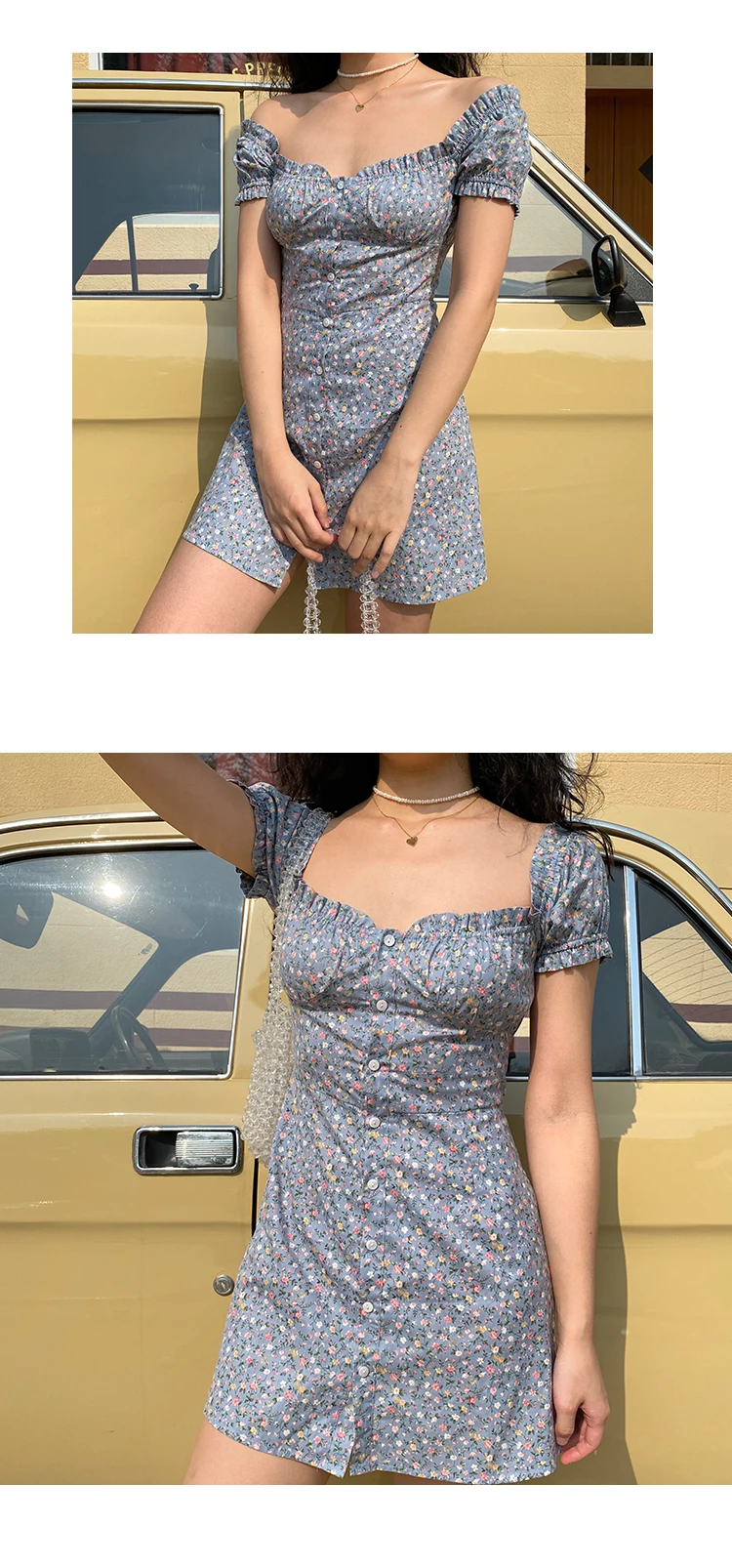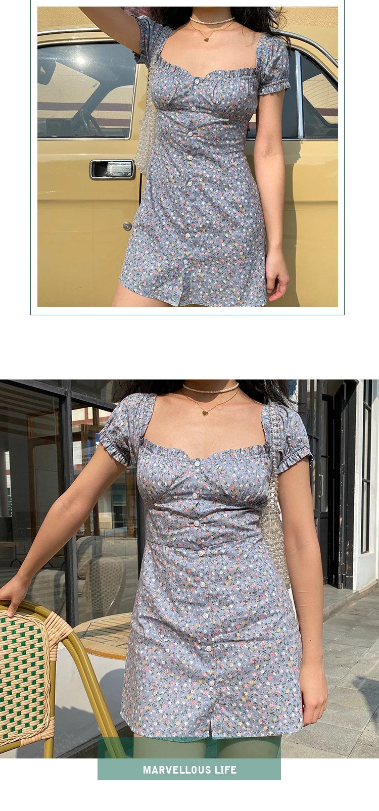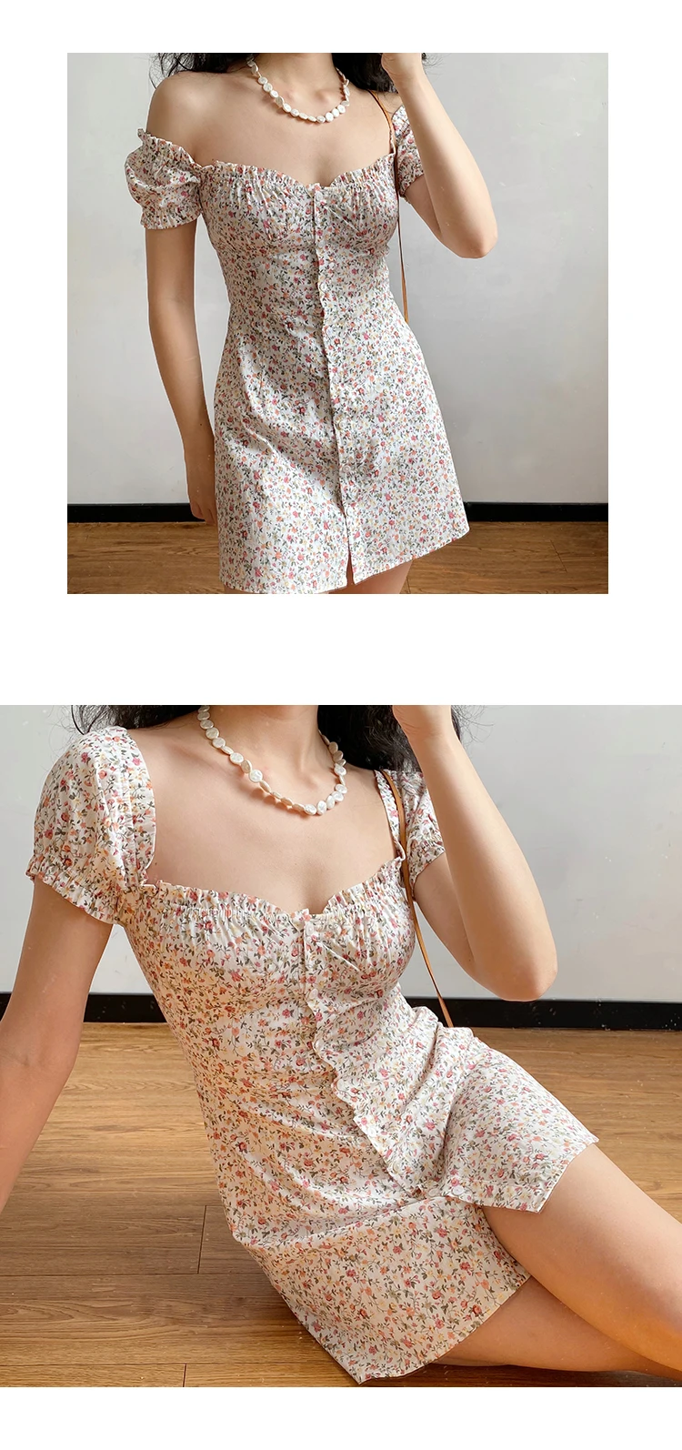 MQTIME - Fresh Floral Single-breasted Puff Sleeve Slim Dress A-line Skirt Female