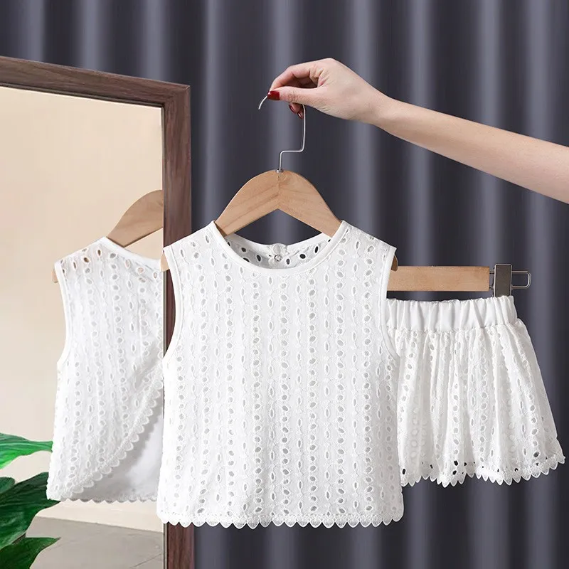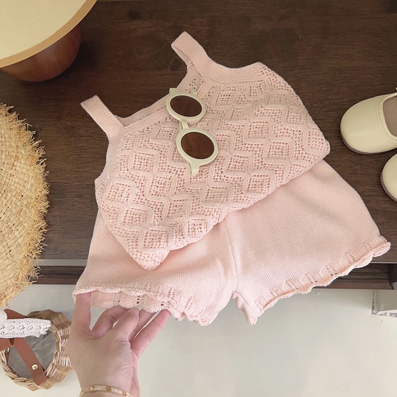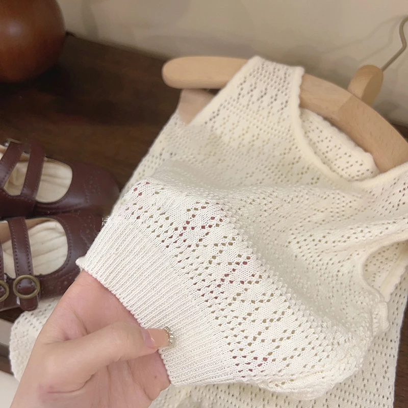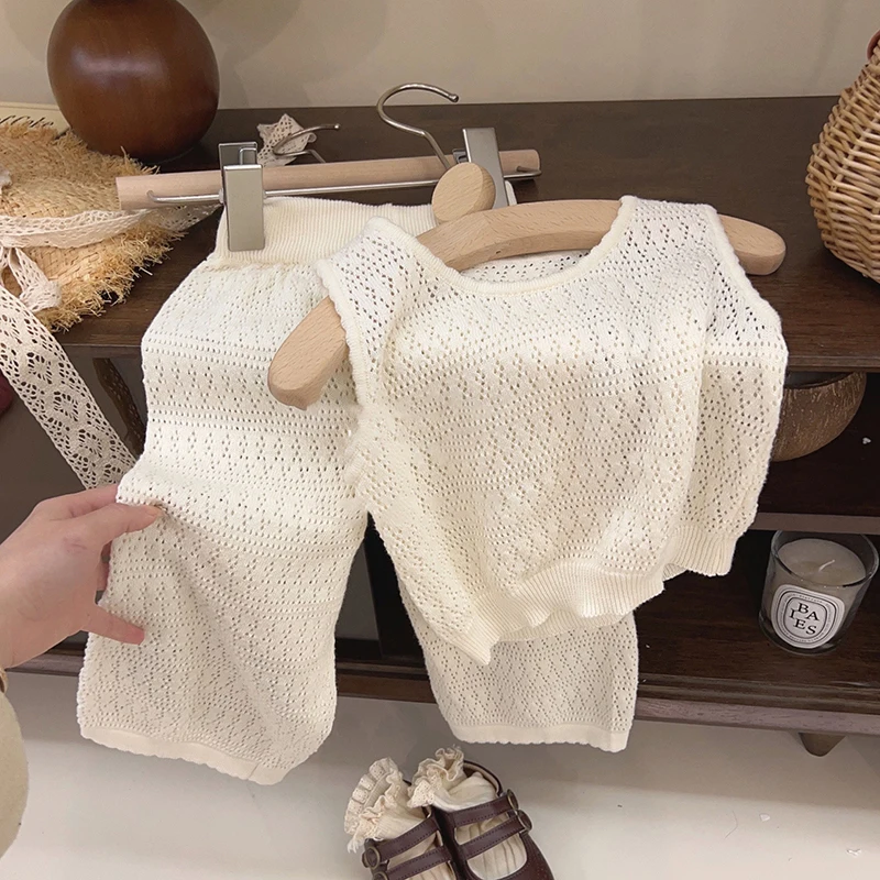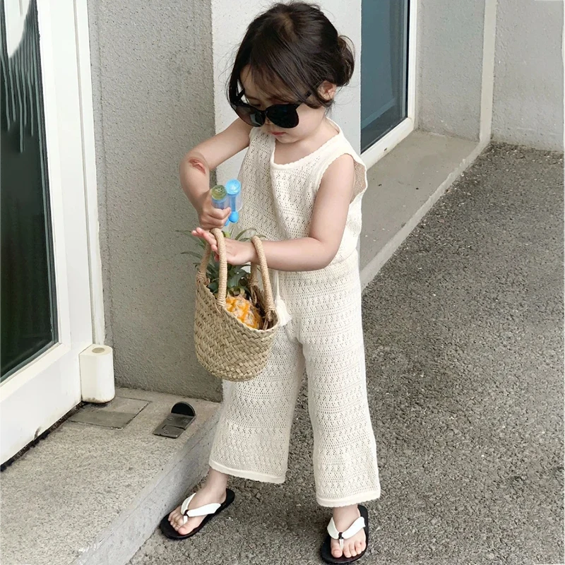 MQTIME  -  Girl's Clothing Sets Summer Korean Thin Knitted Girl Set Children Hollow Breathable Vest + Wide Leg Pants Two-piece Suit