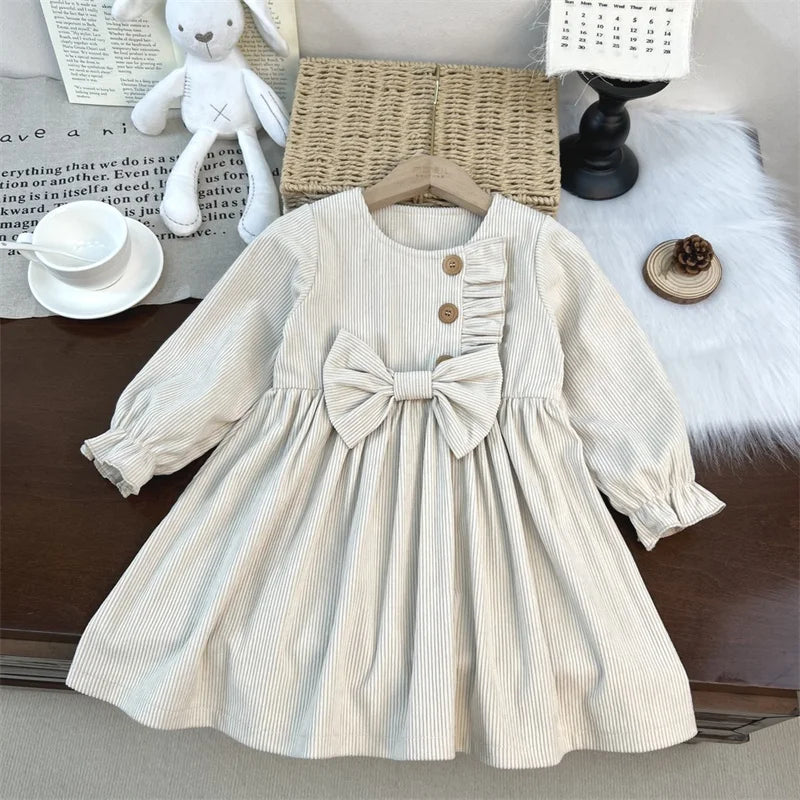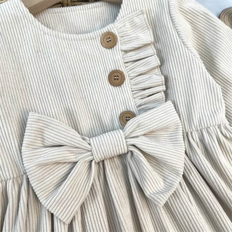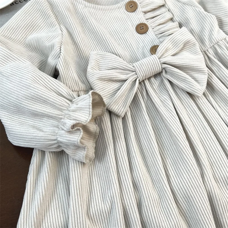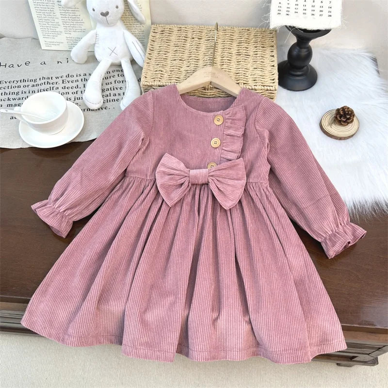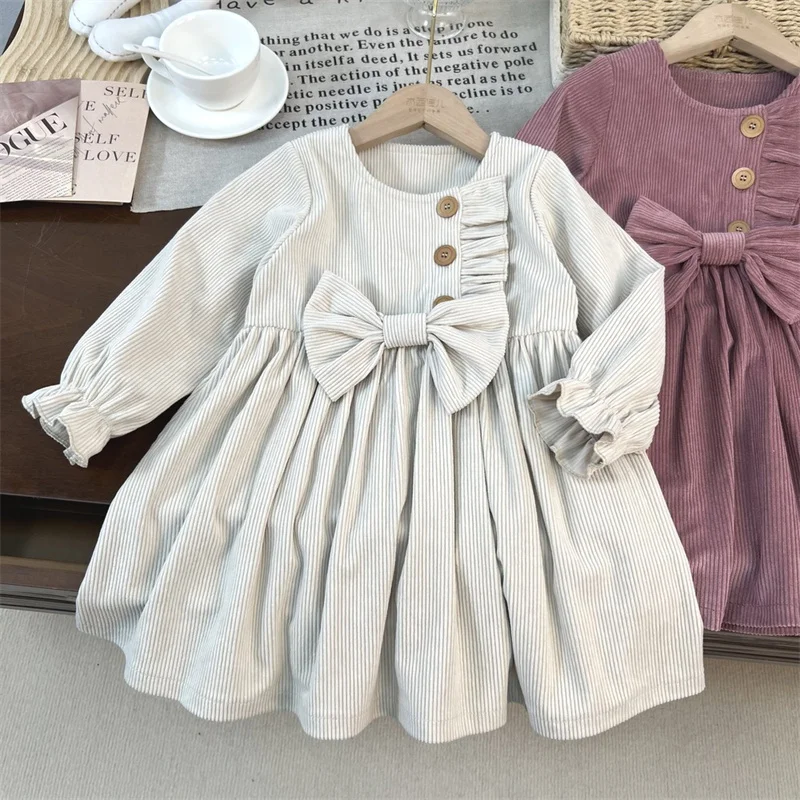 MQTIME - Girls' Corduroy Dress Autumn 2025 Fashion Princess Bow Gown Children Long-sleeve Casual Vestidos 2025 New Kids Sweet Clothing