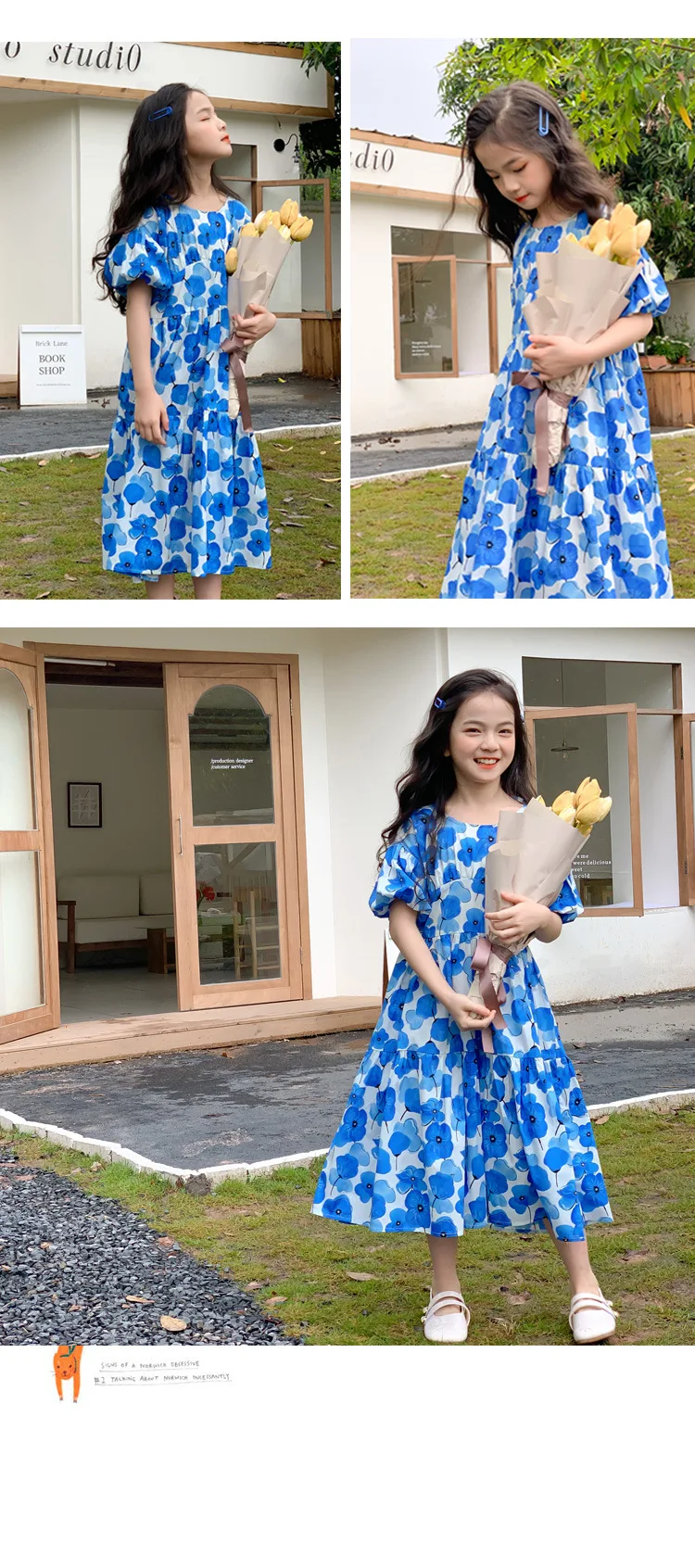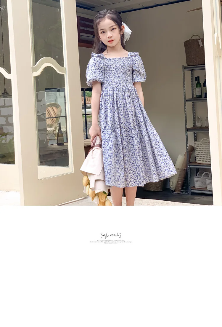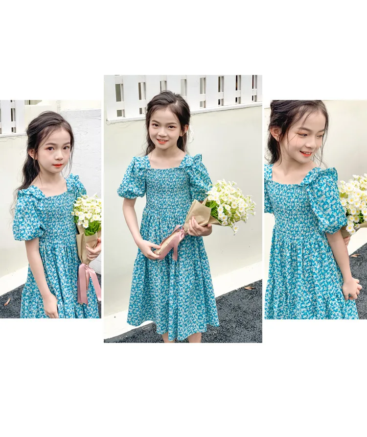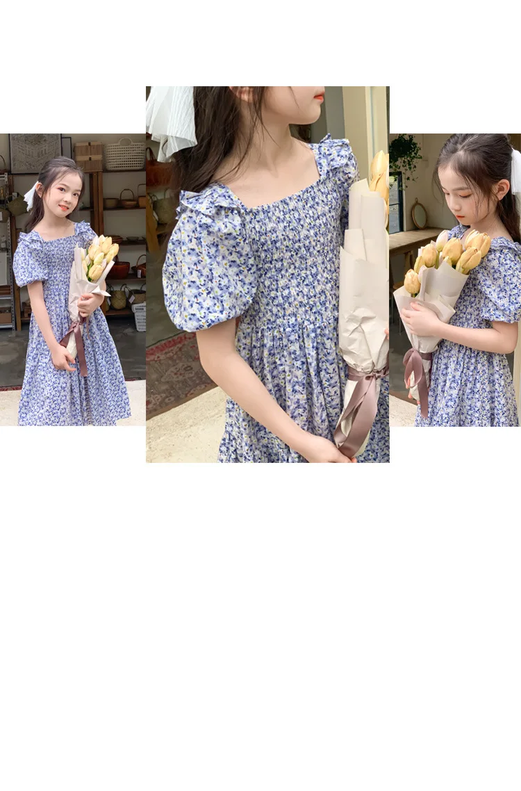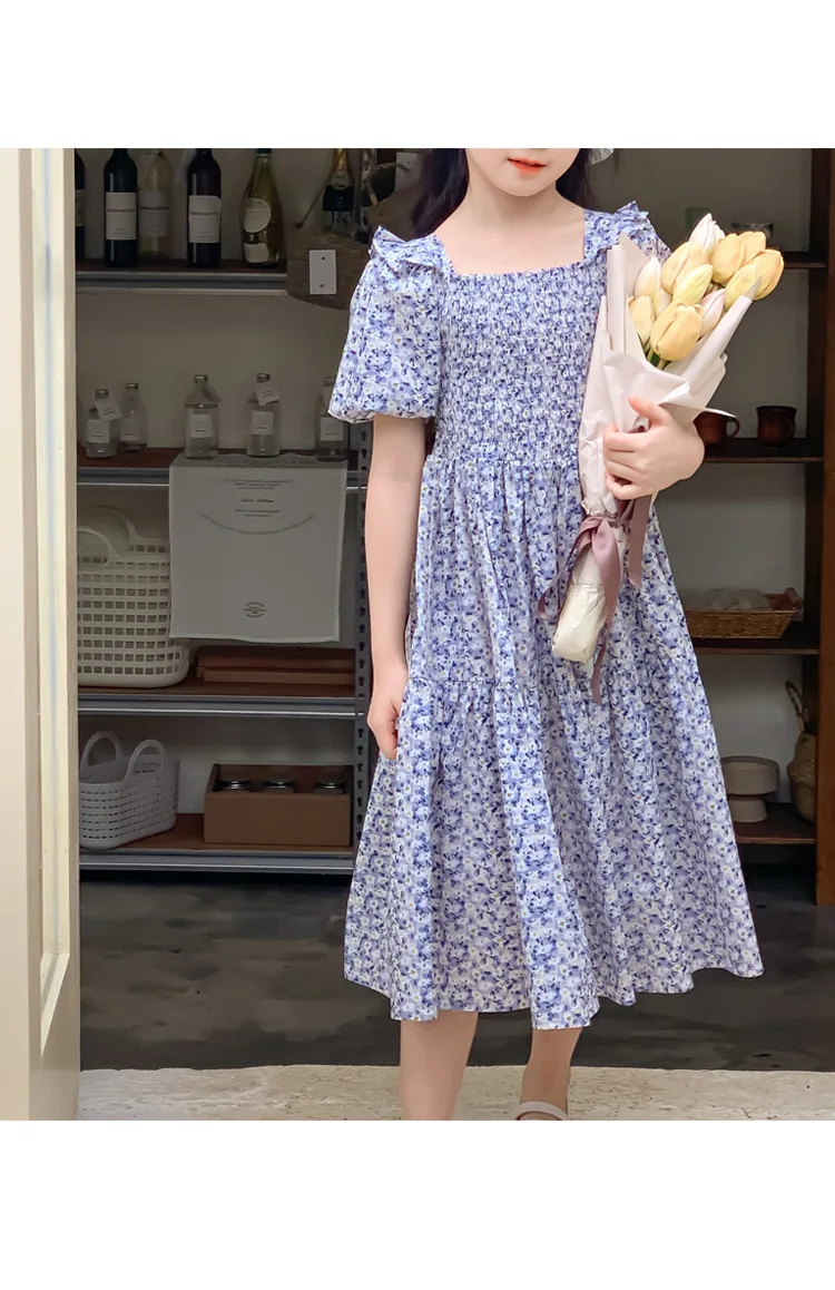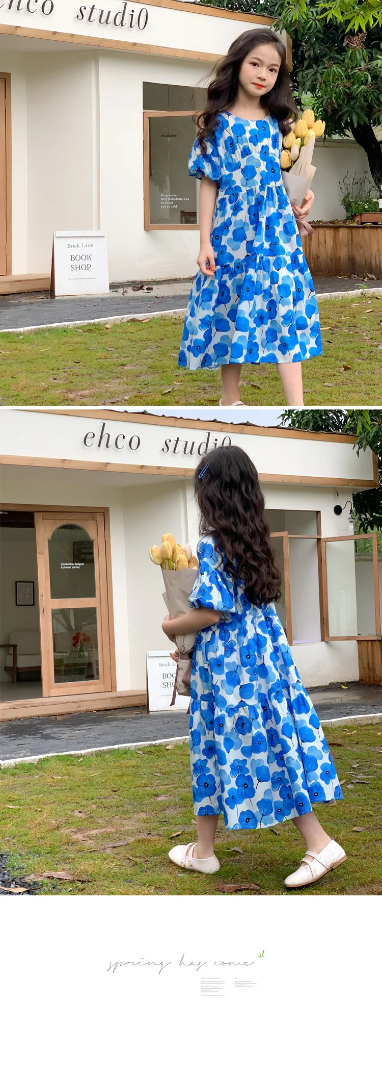 Mqtime Girls Floral Dress Summer Puff Sleeve Elegant Beach Princess Dresses for Kids Travel Casual Teen Children Clothes 13 14 15 Years