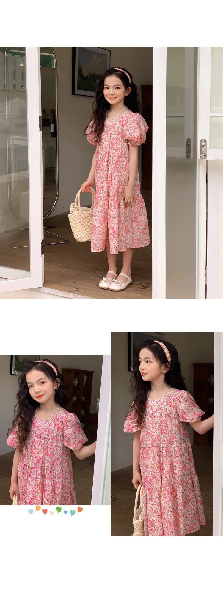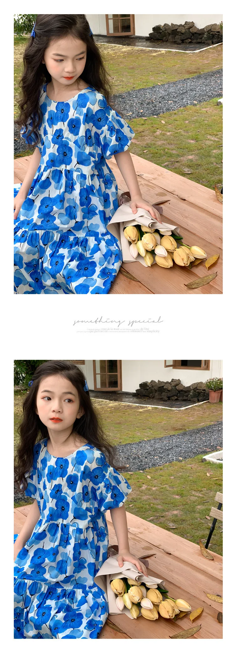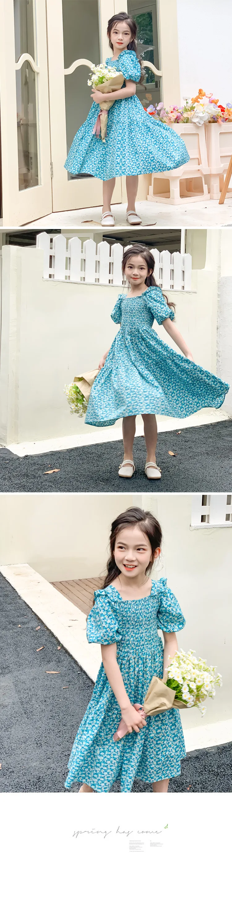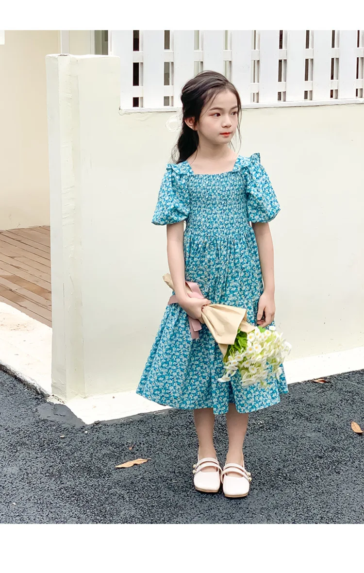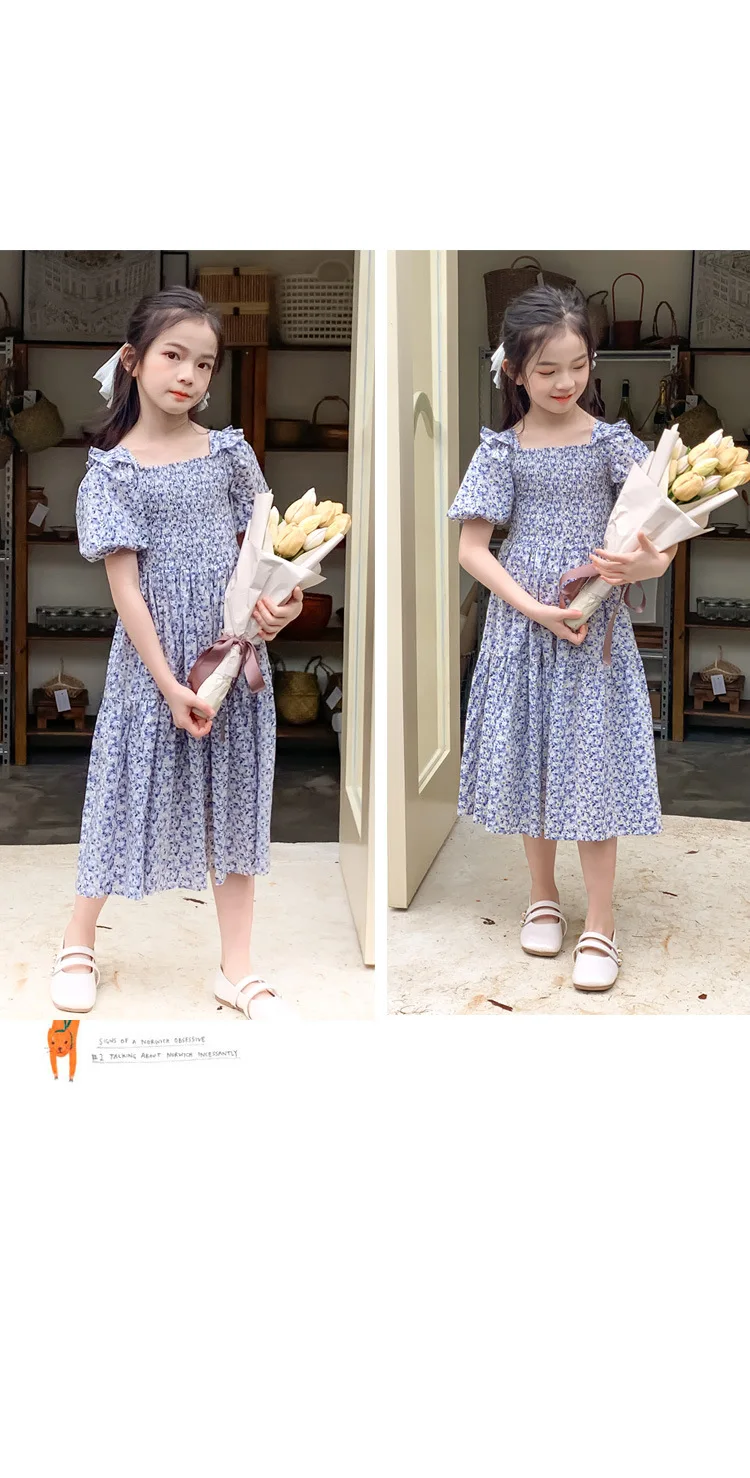 Mqtime Girls Floral Dress Summer Puff Sleeve Elegant Beach Princess Dresses for Kids Travel Casual Teen Children Clothes 13 14 15 Years