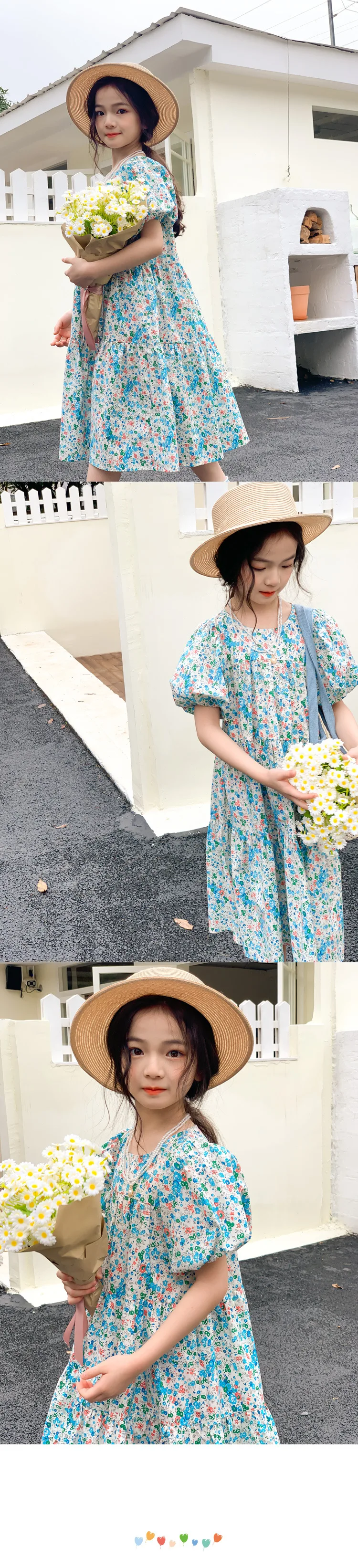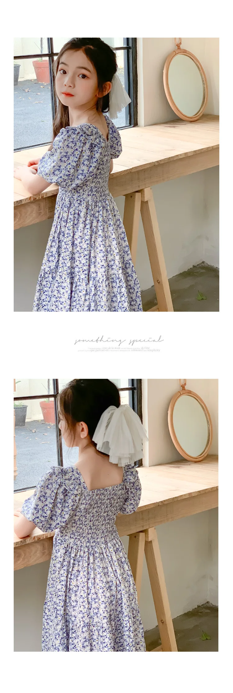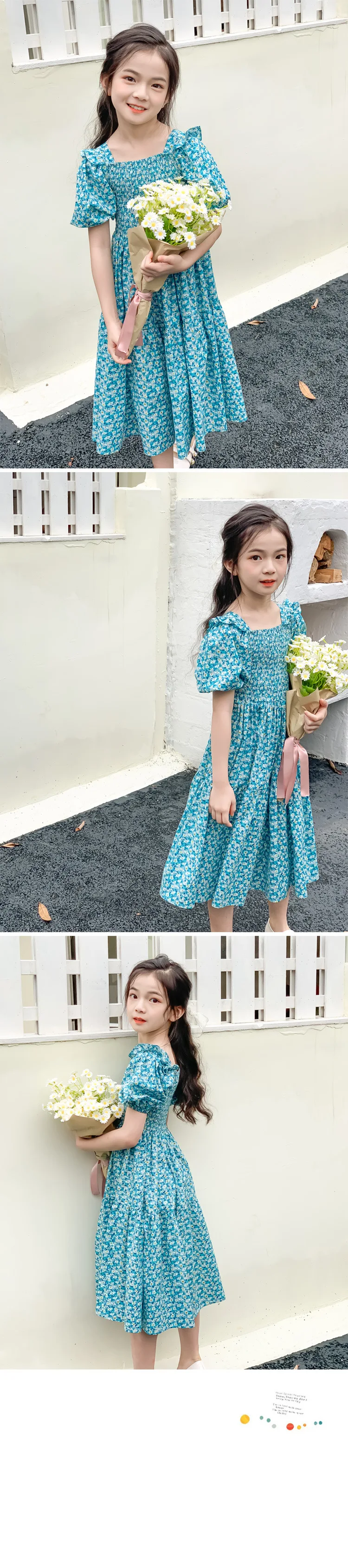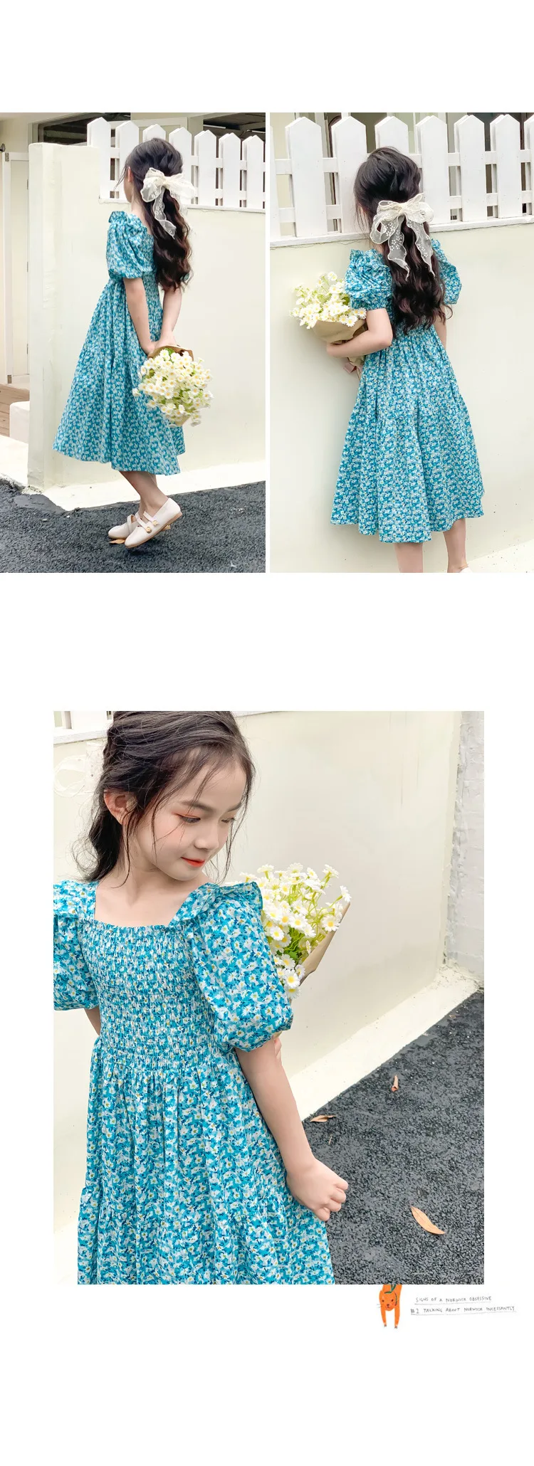 Mqtime Girls Floral Dress Summer Puff Sleeve Elegant Beach Princess Dresses for Kids Travel Casual Teen Children Clothes 13 14 15 Years