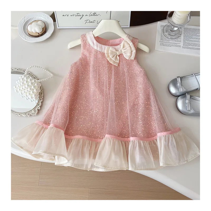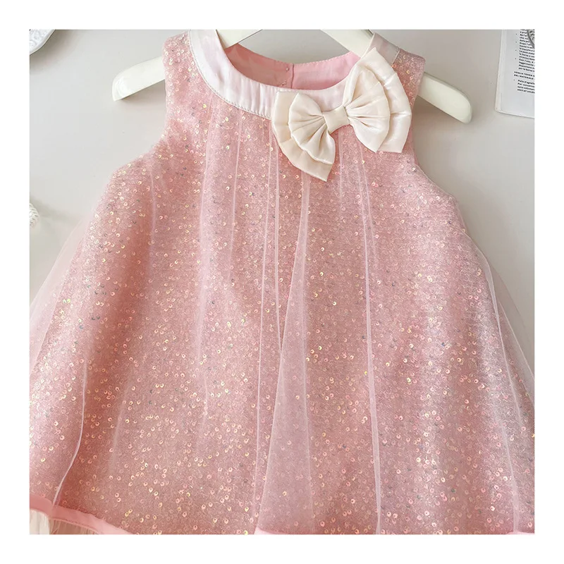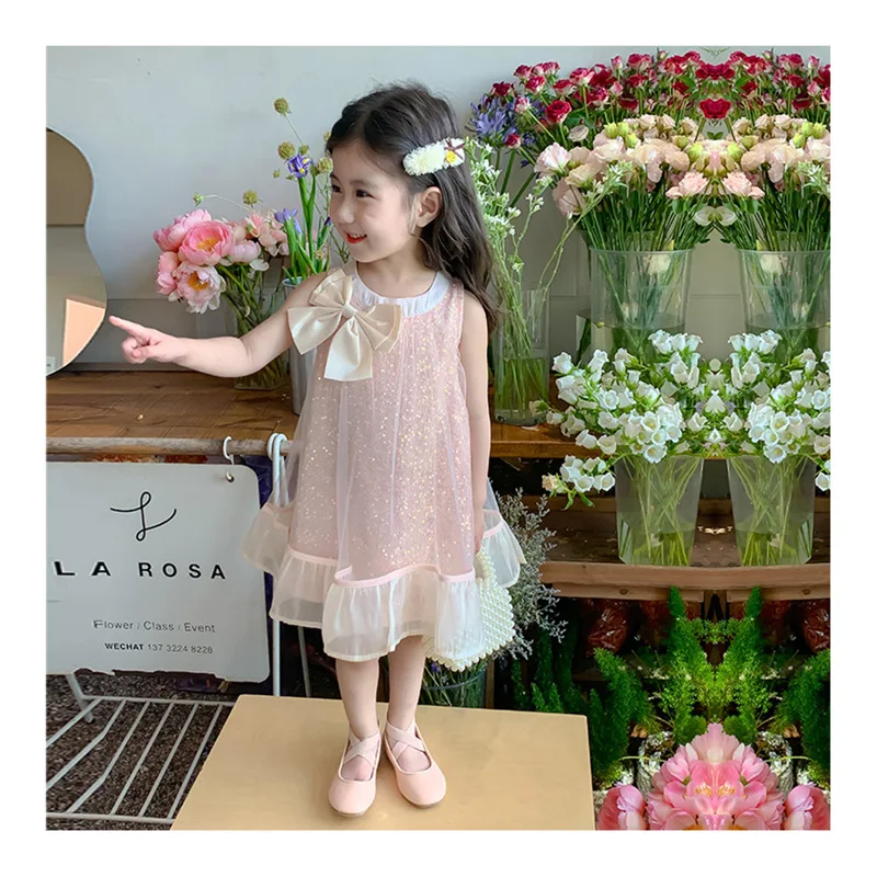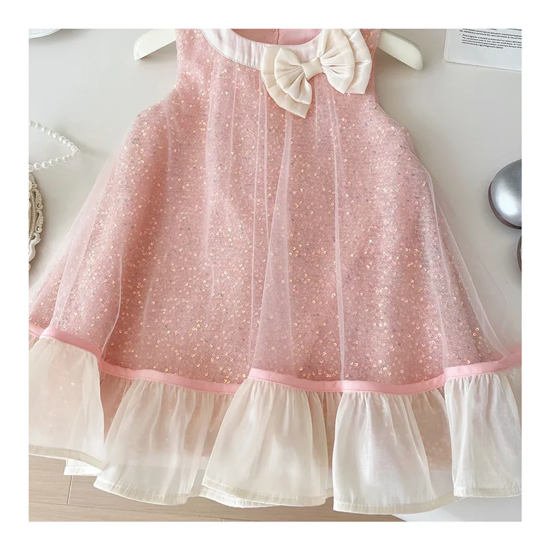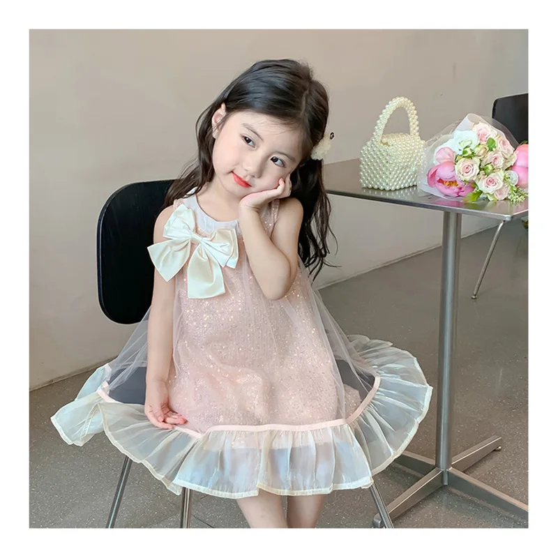 MQTIME - Girls' Summer Dress Bow Sequin Mesh Children's Sleeveless Princess Dress Summer Kid's Clothing