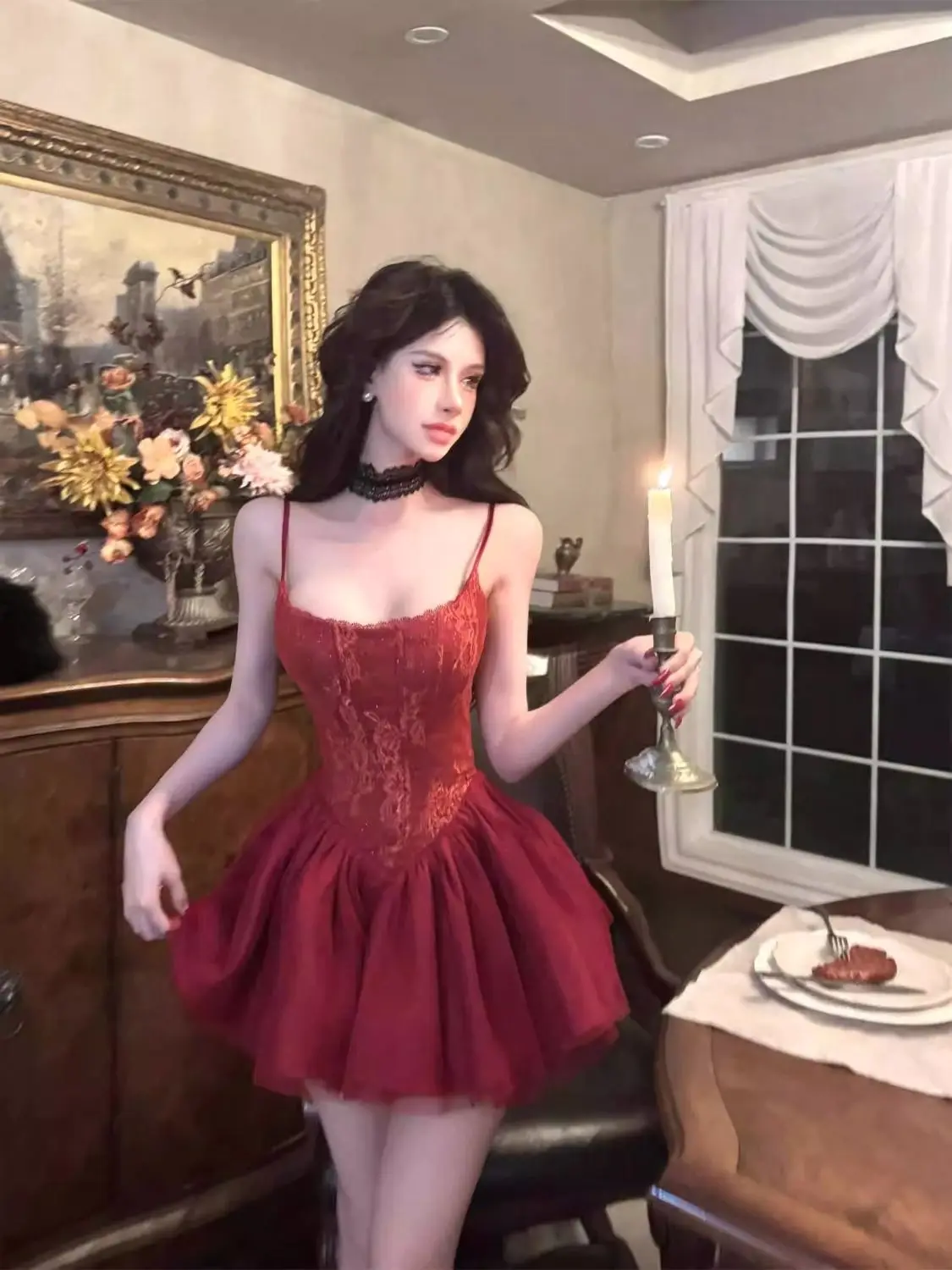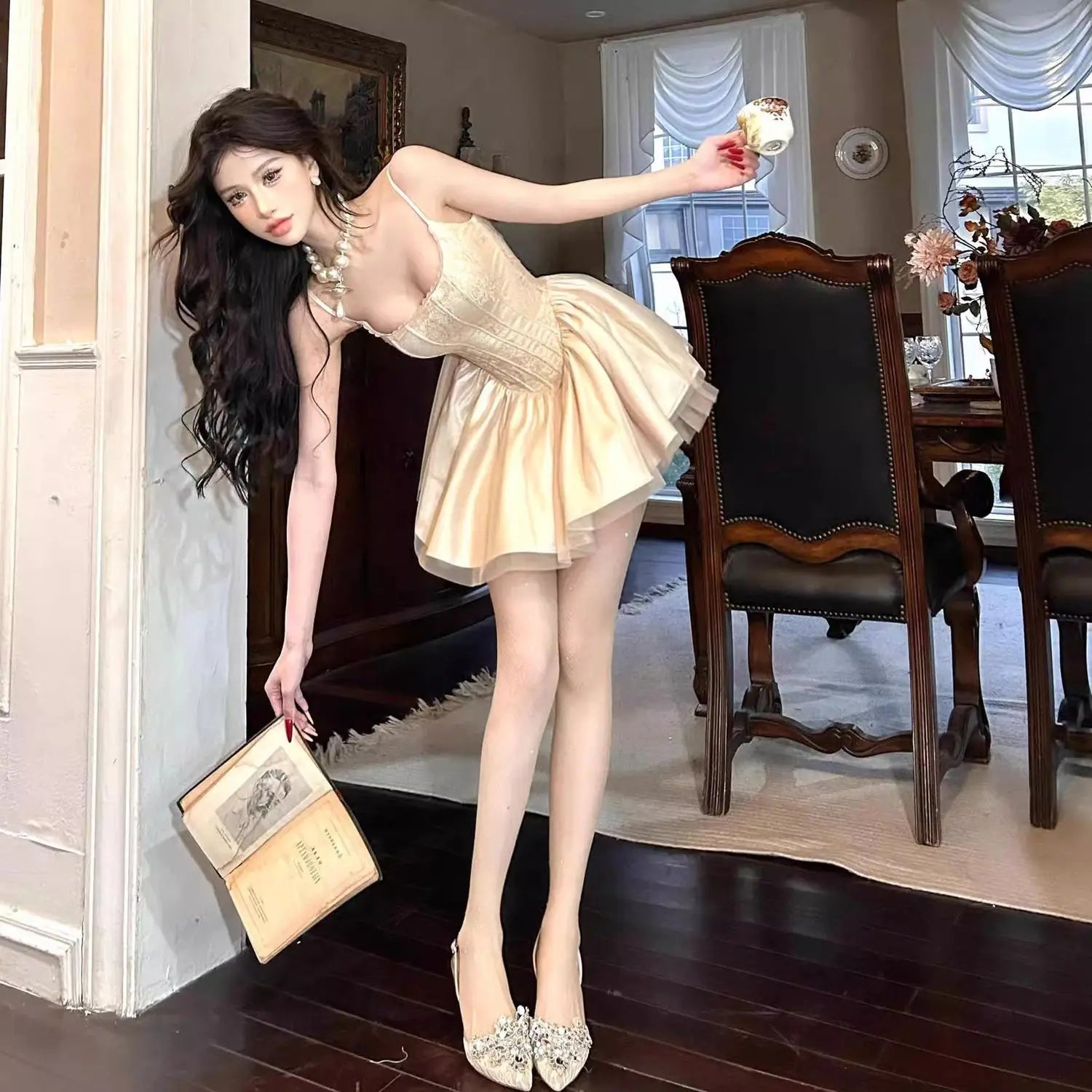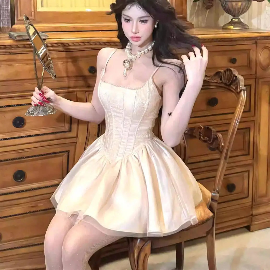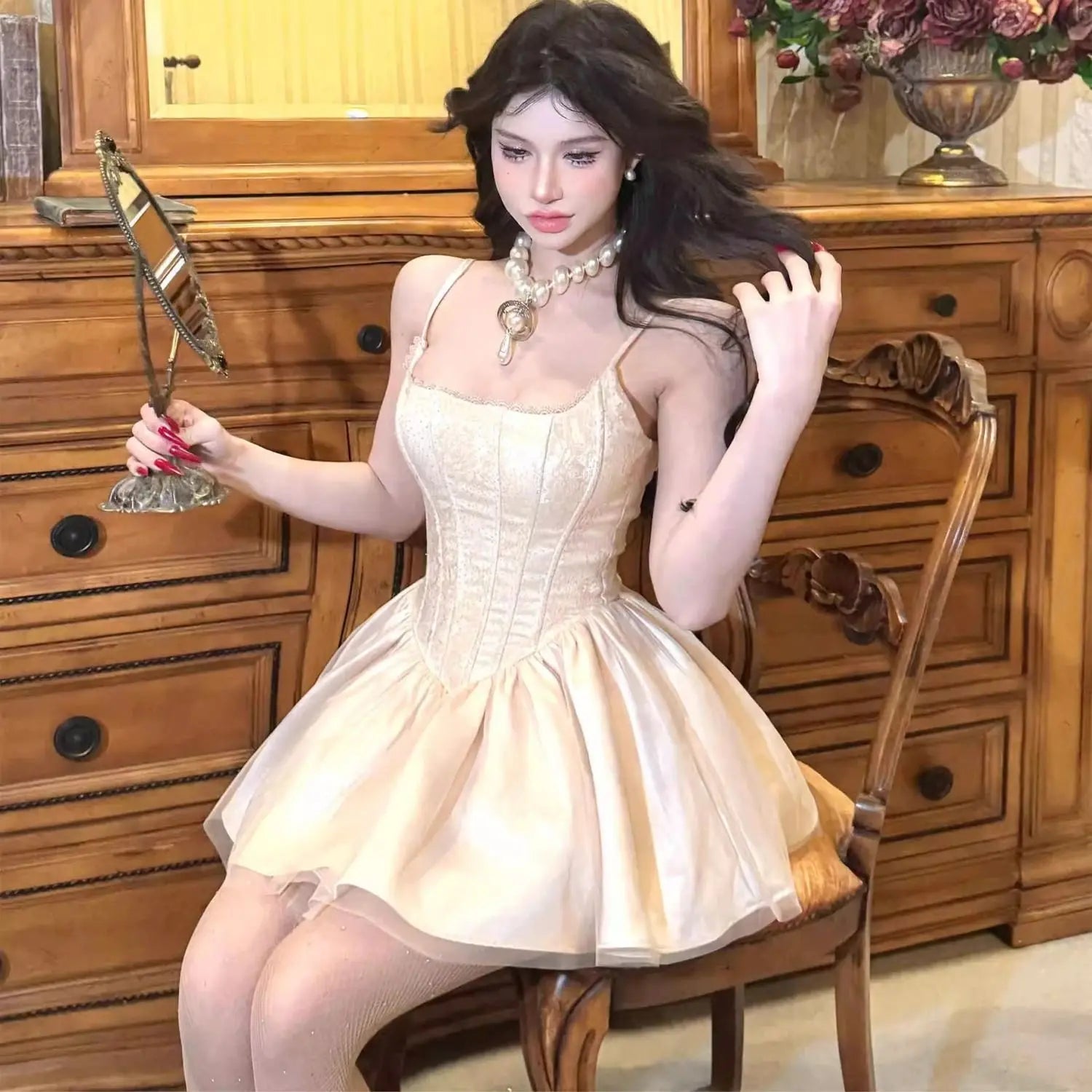 MQTIME - High-end Celebrity Diamond Lace Suspender Dress Women 2025 Summer New Temperament Slim Waist Fluffy Princess Mini Dress Girls