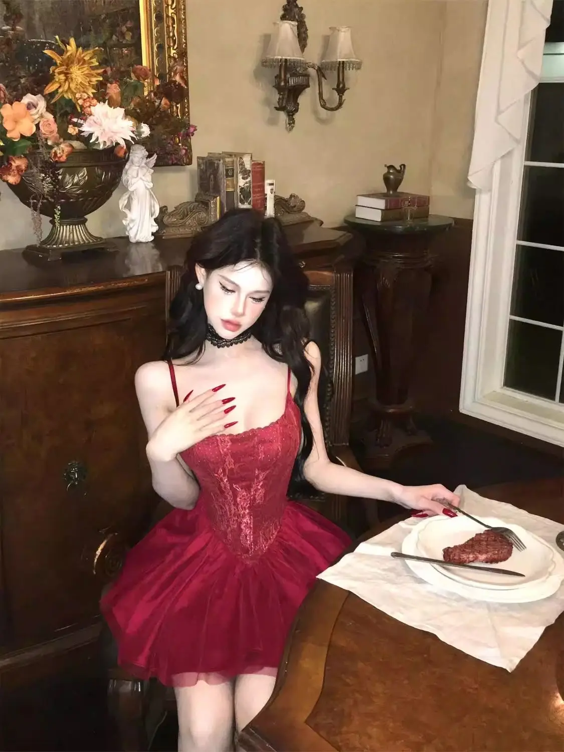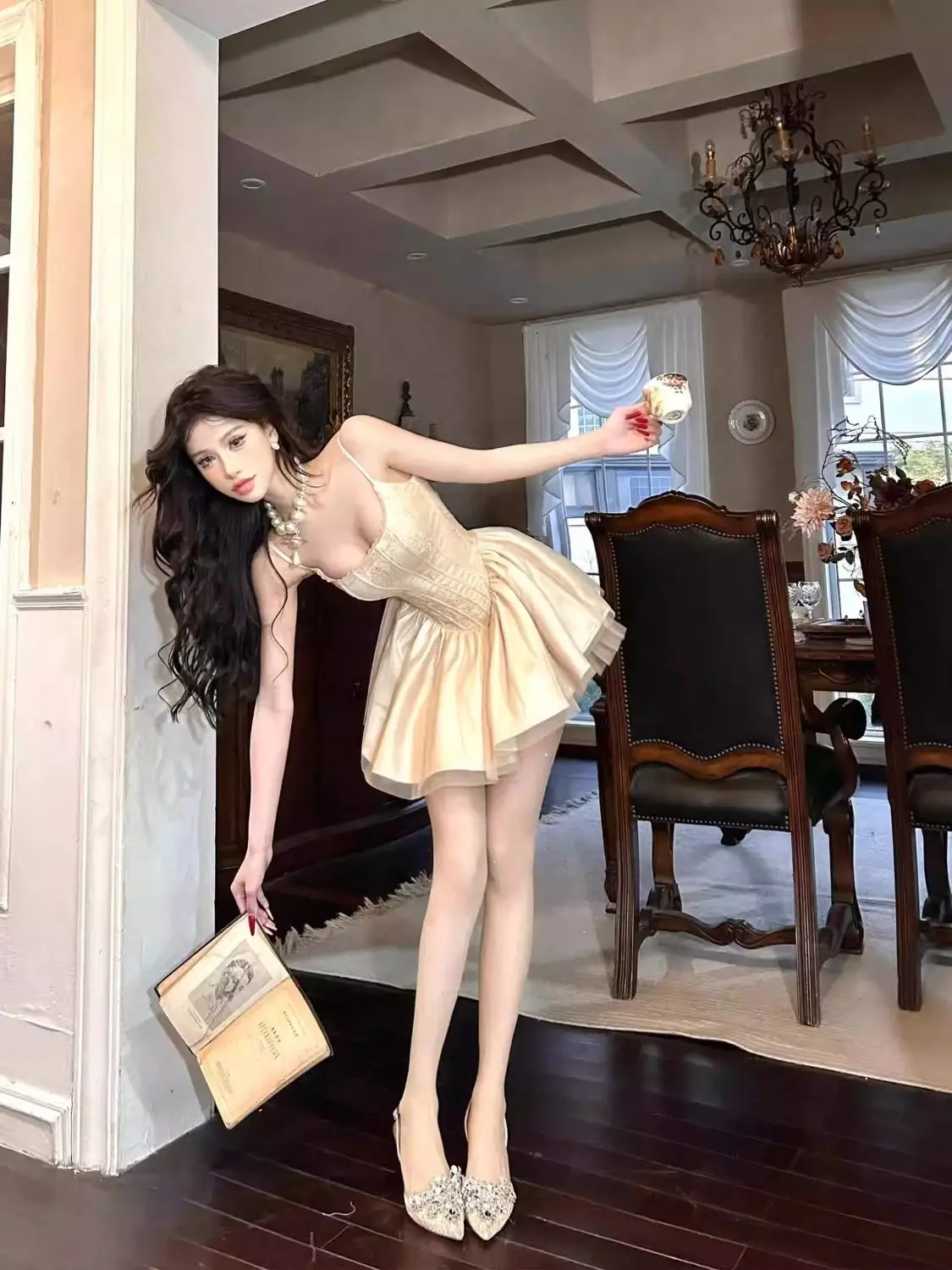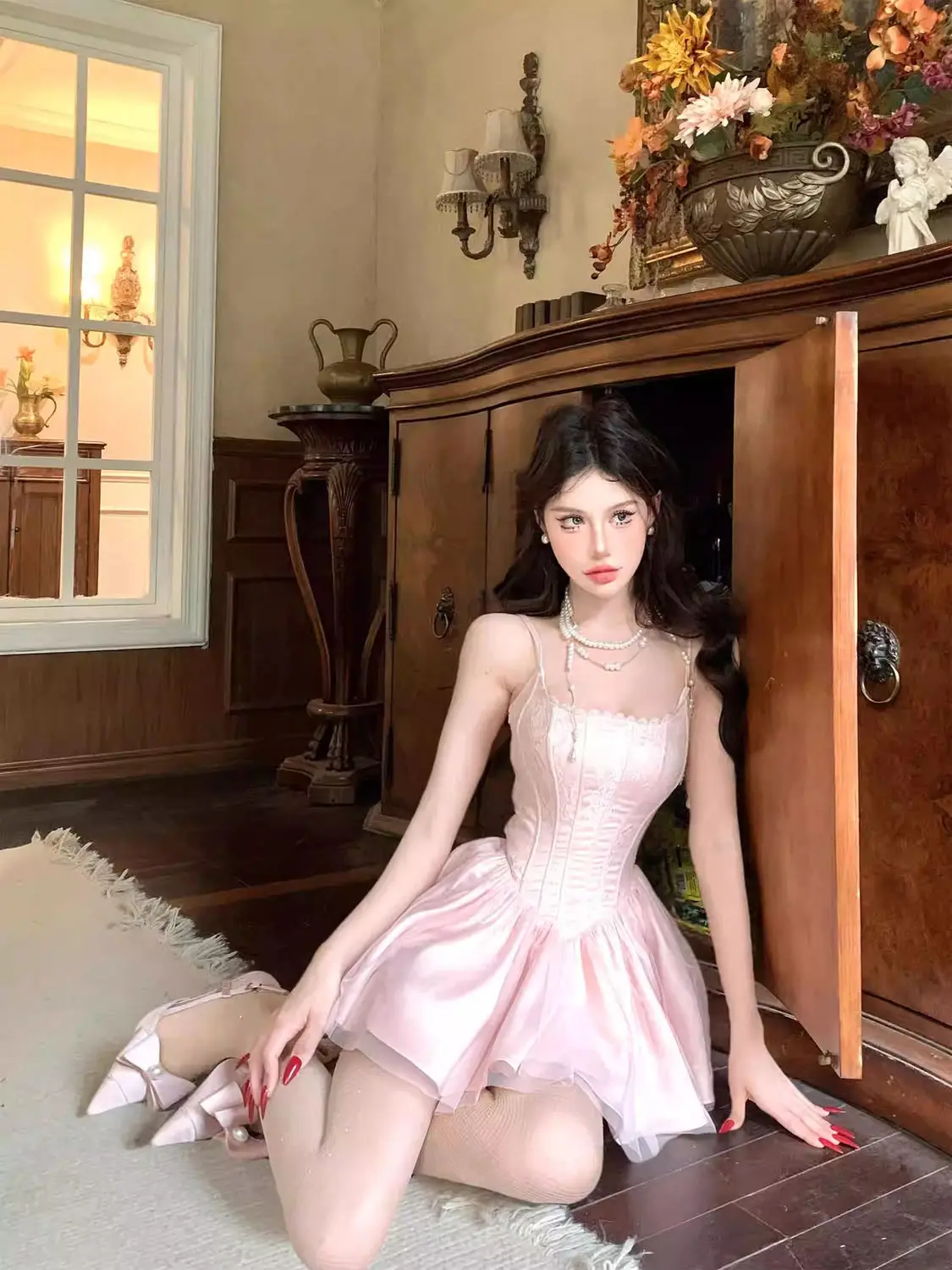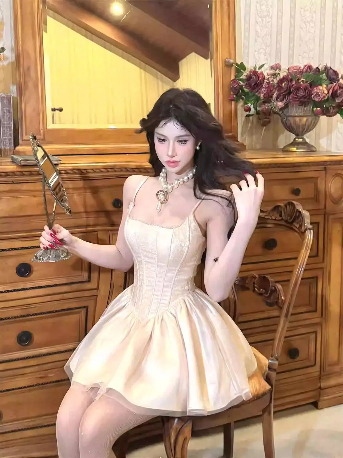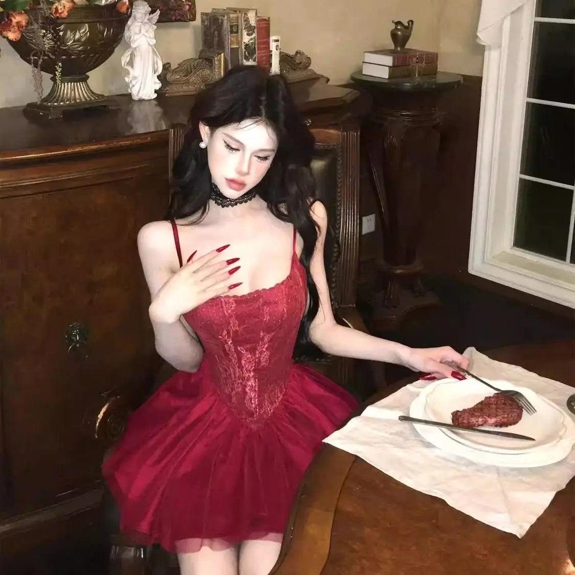 MQTIME - High-end Celebrity Diamond Lace Suspender Dress Women 2025 Summer New Temperament Slim Waist Fluffy Princess Mini Dress Girls