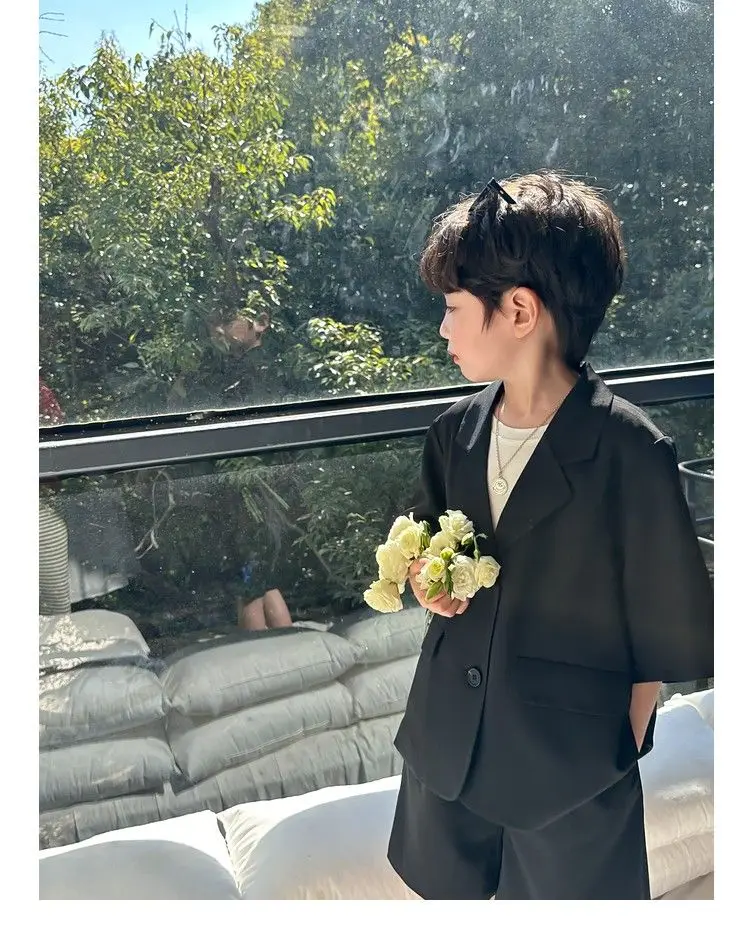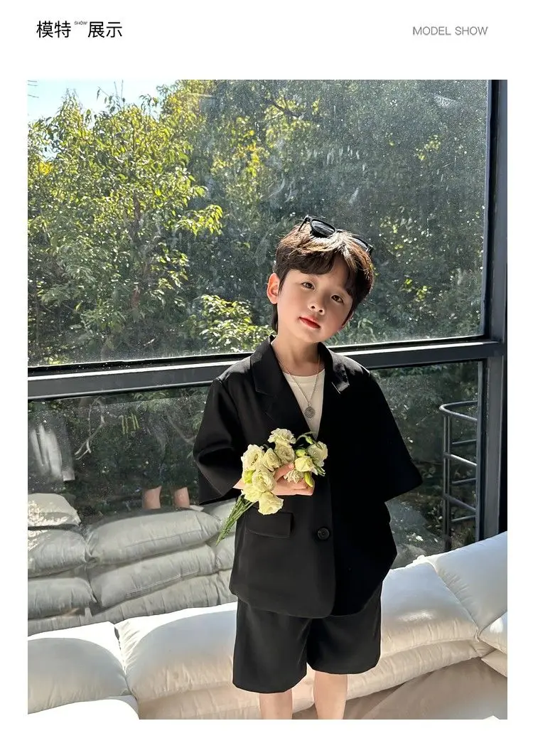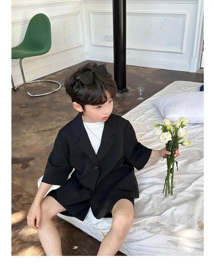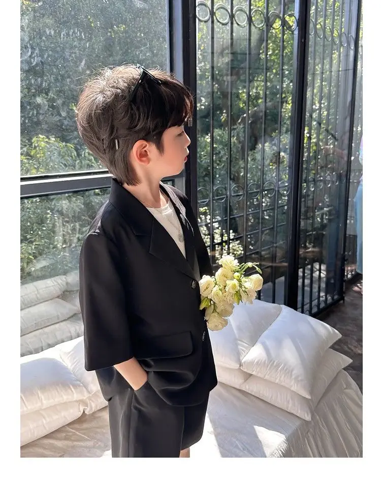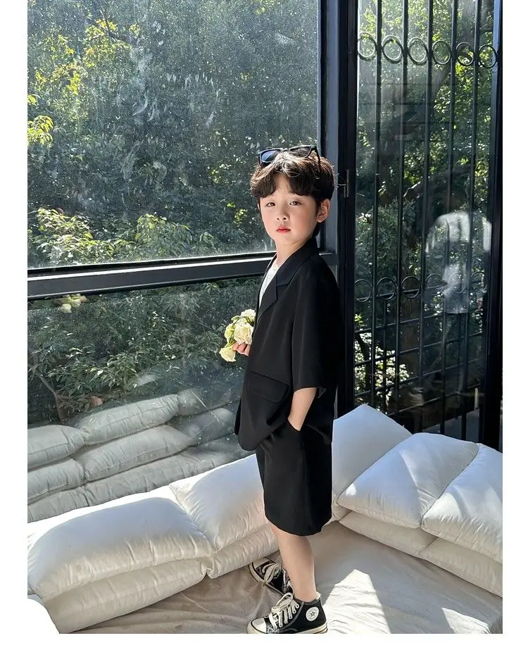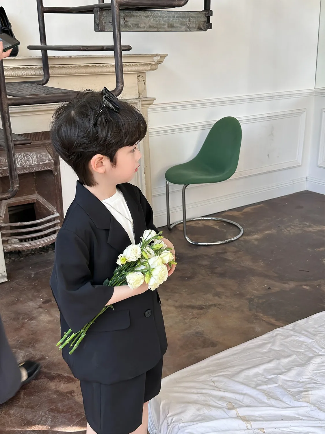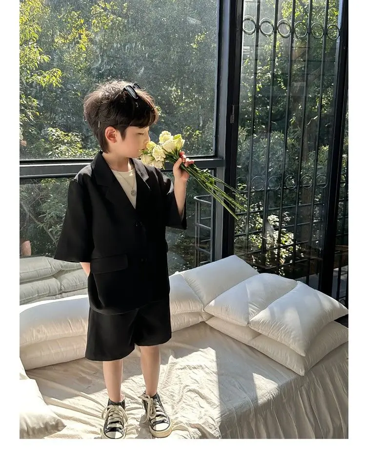 Mqtime High Quality Boys' Blazer Suit Set Summer New Thin Casual Baby Boy Single Breasted Korean Black Short Sleeve Coat+ Shorts 2pcs
