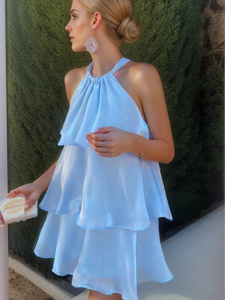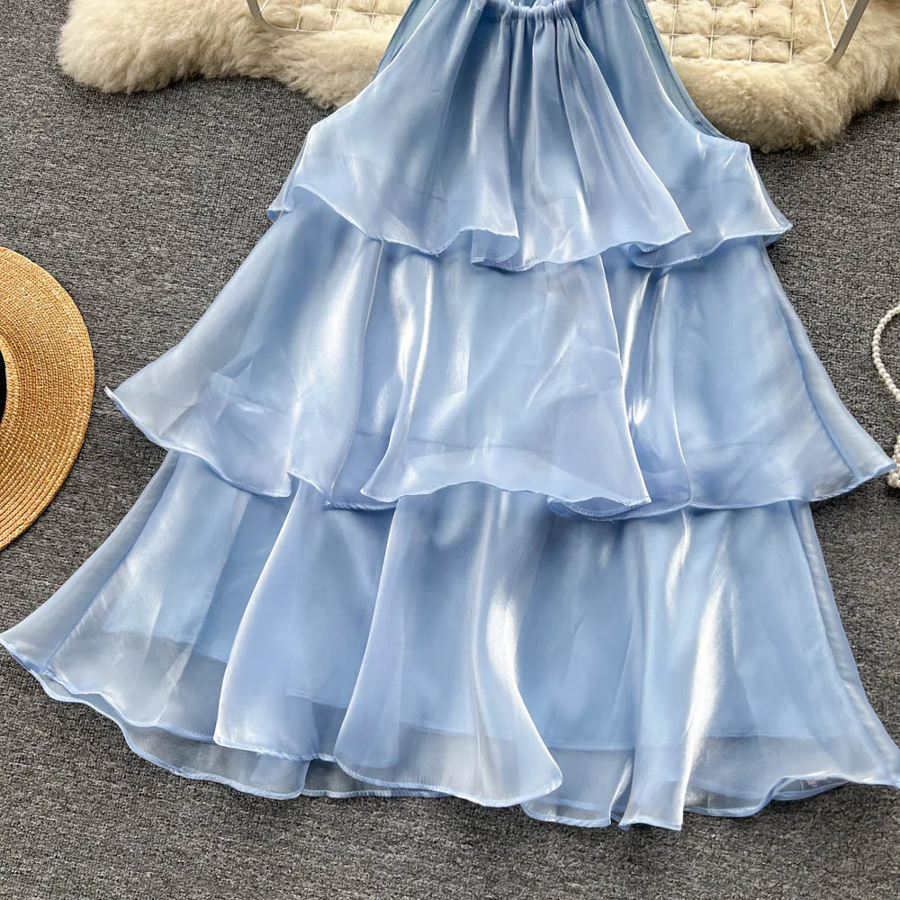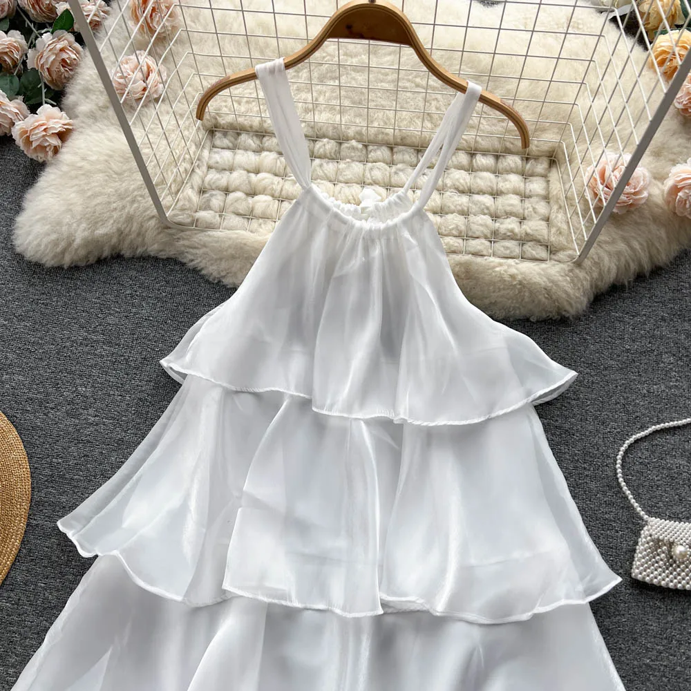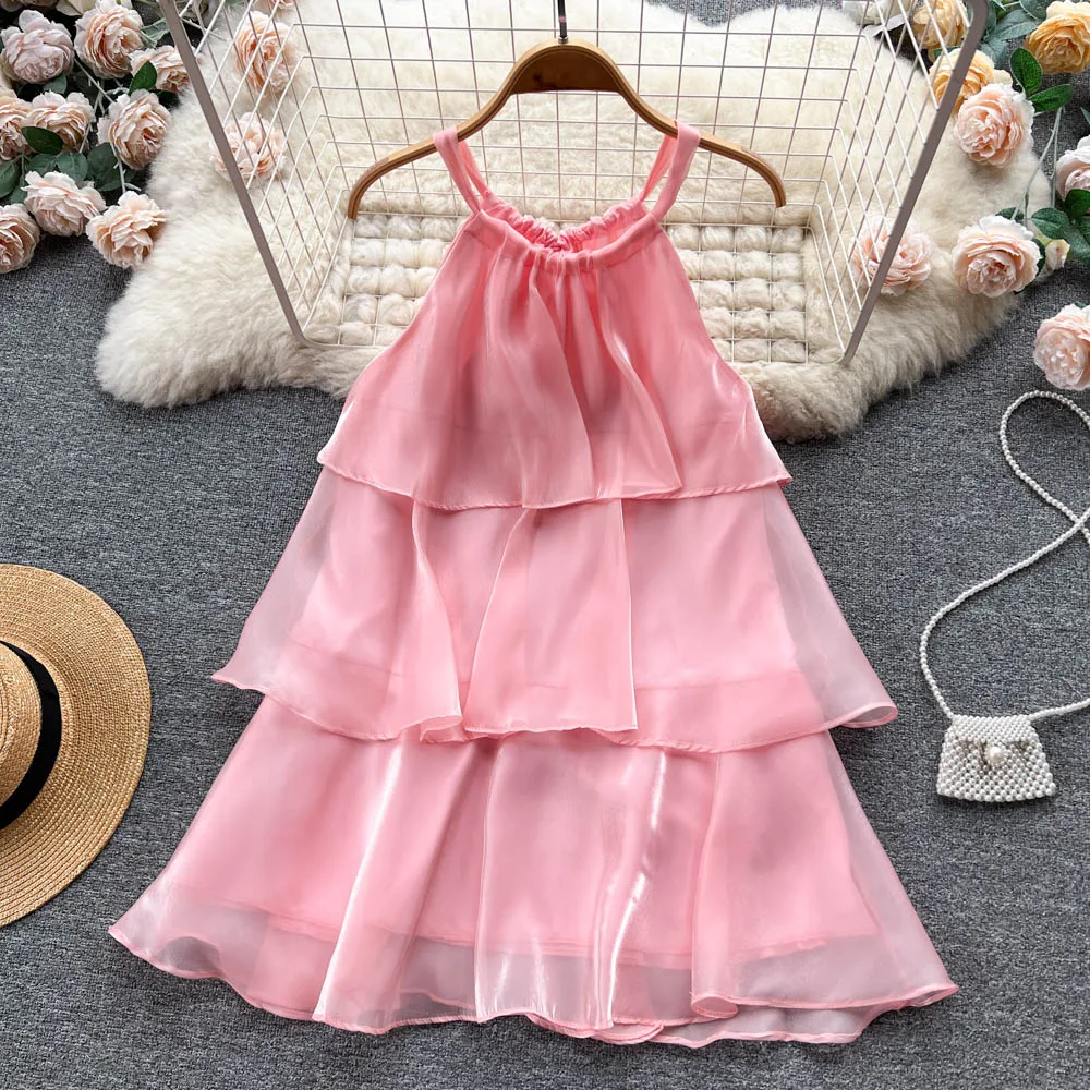 MQTIME - Holiday Sweet Organza Gauze Gentle Style Ruffled Halter Dress Women Sleeveless Loose Strap Short Dress Summer Beach Mini Dress