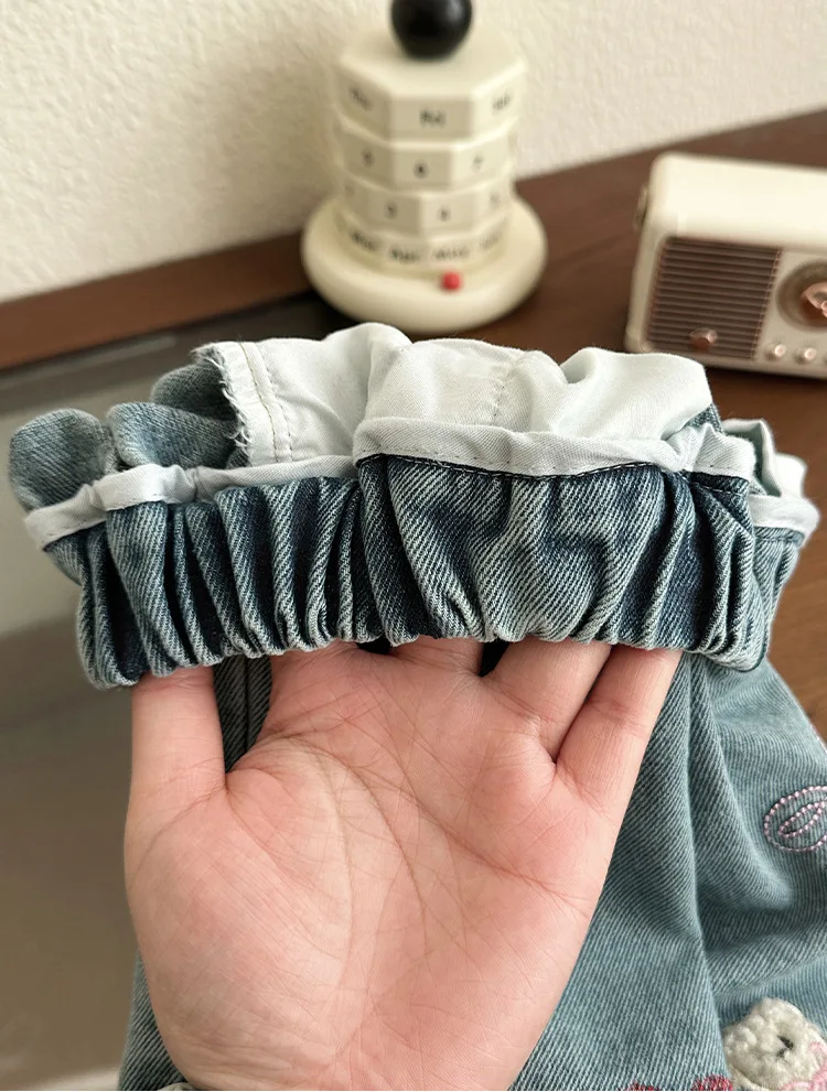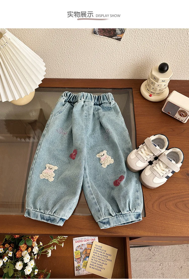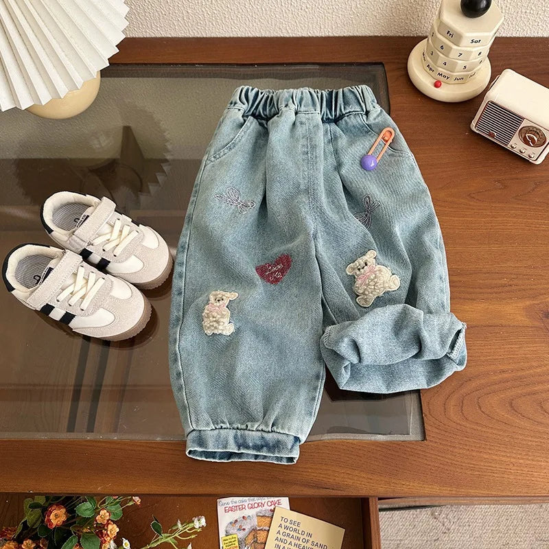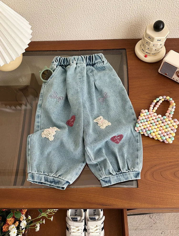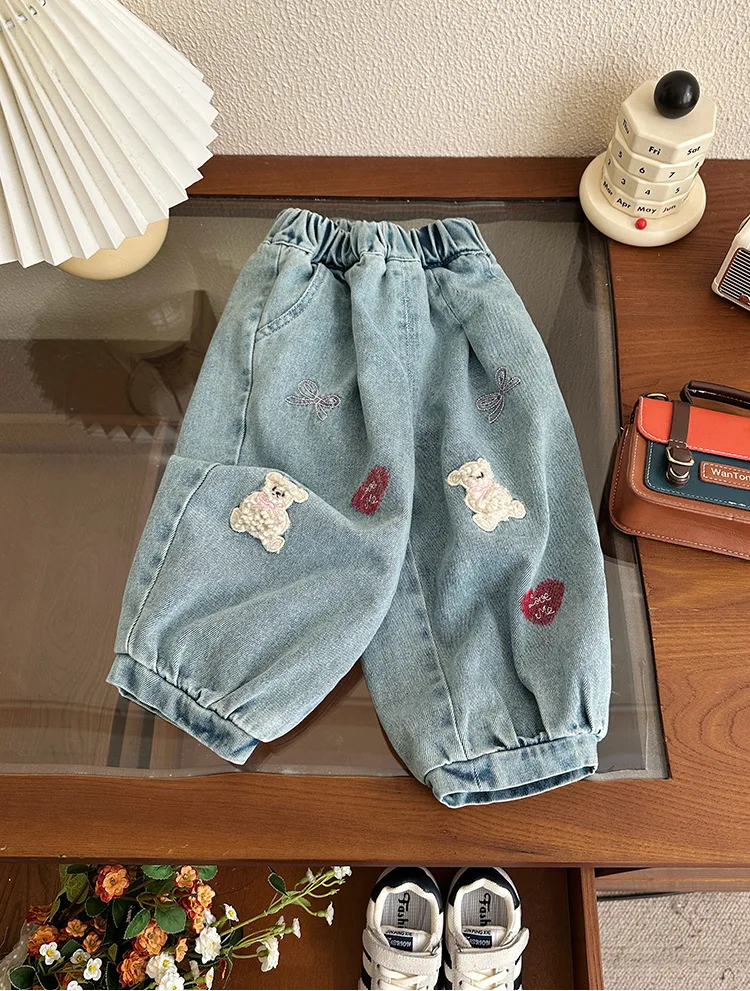 MQTIME - Infant Baby Girl Spring Jeans Cotton Bear Embroidery Loose Children Girl Lantern Pants Elastic Waist 1-6Y Girls Denim Pants