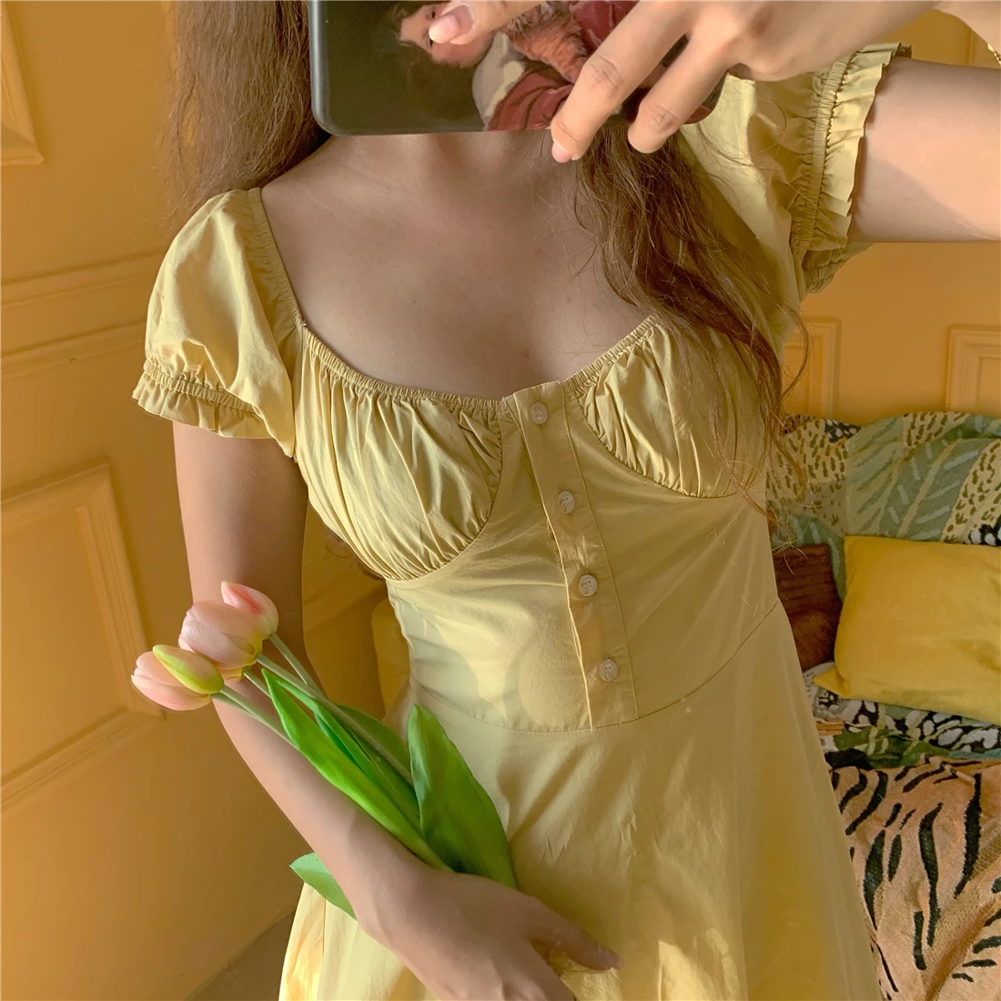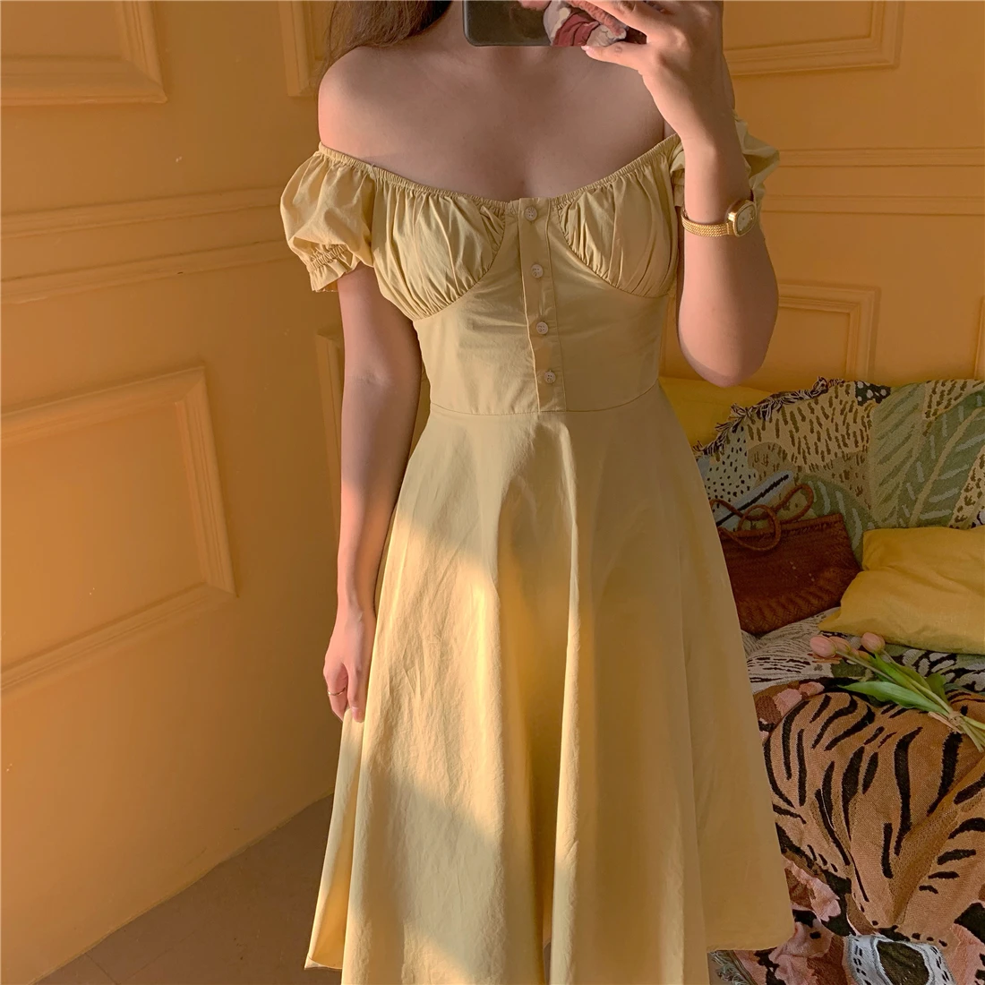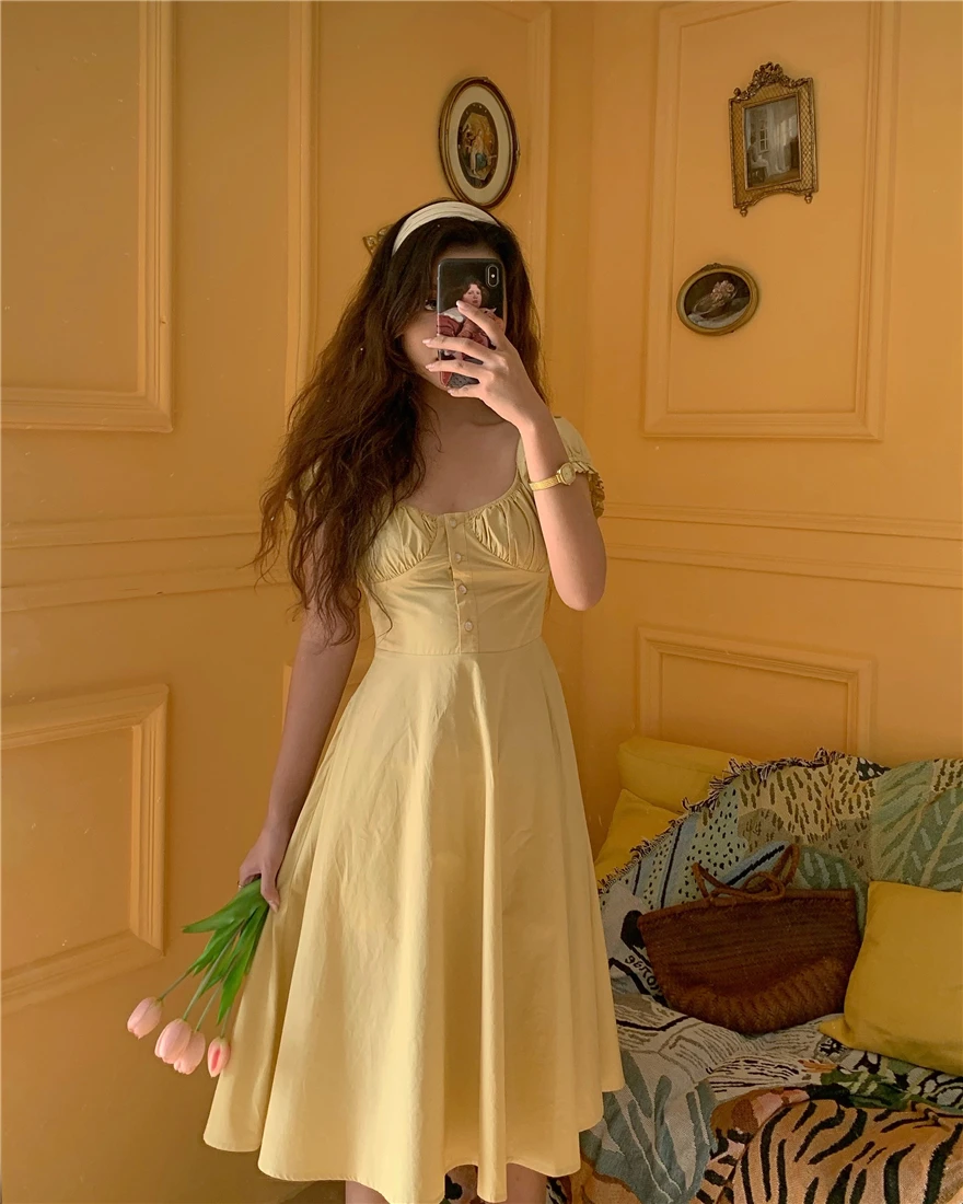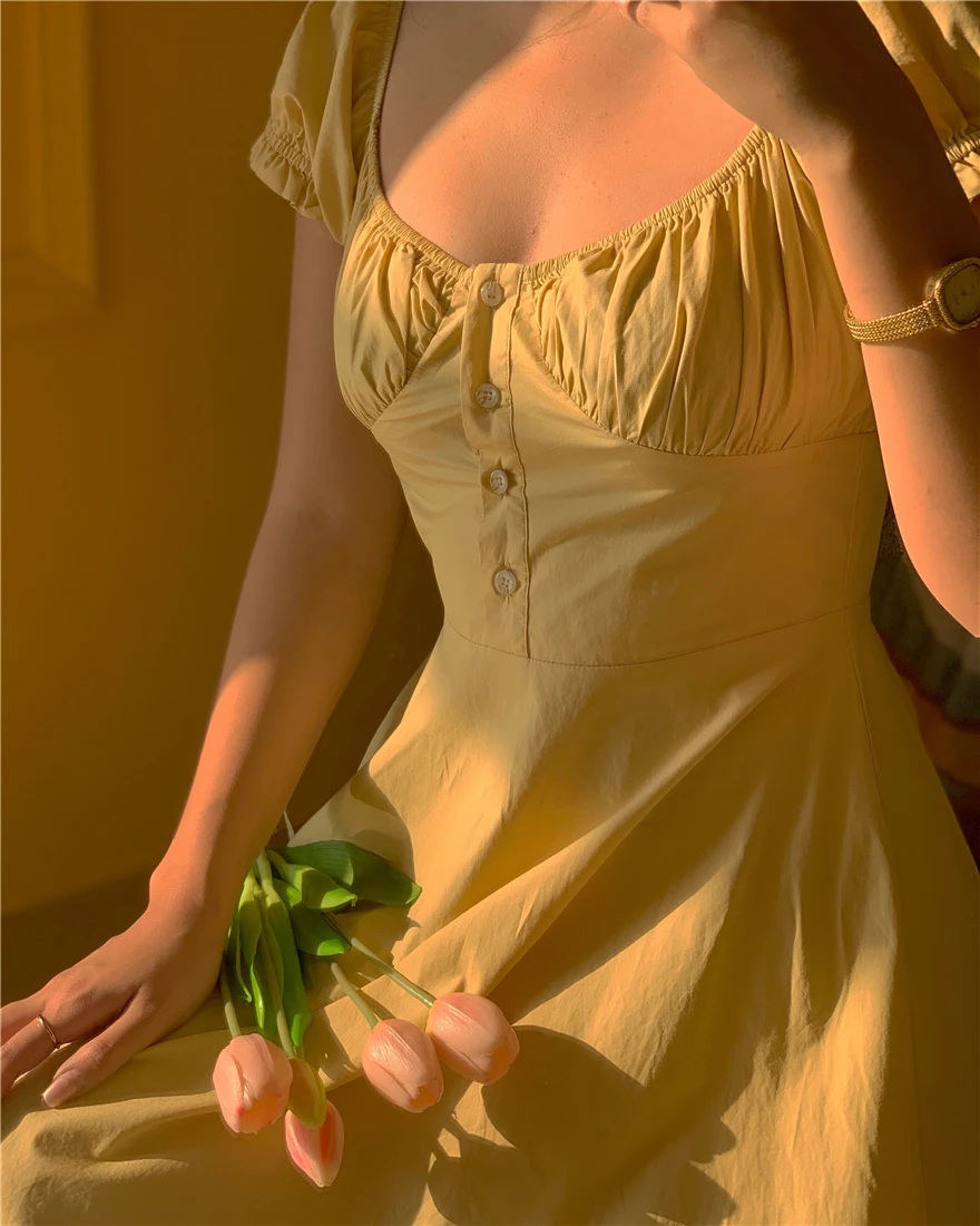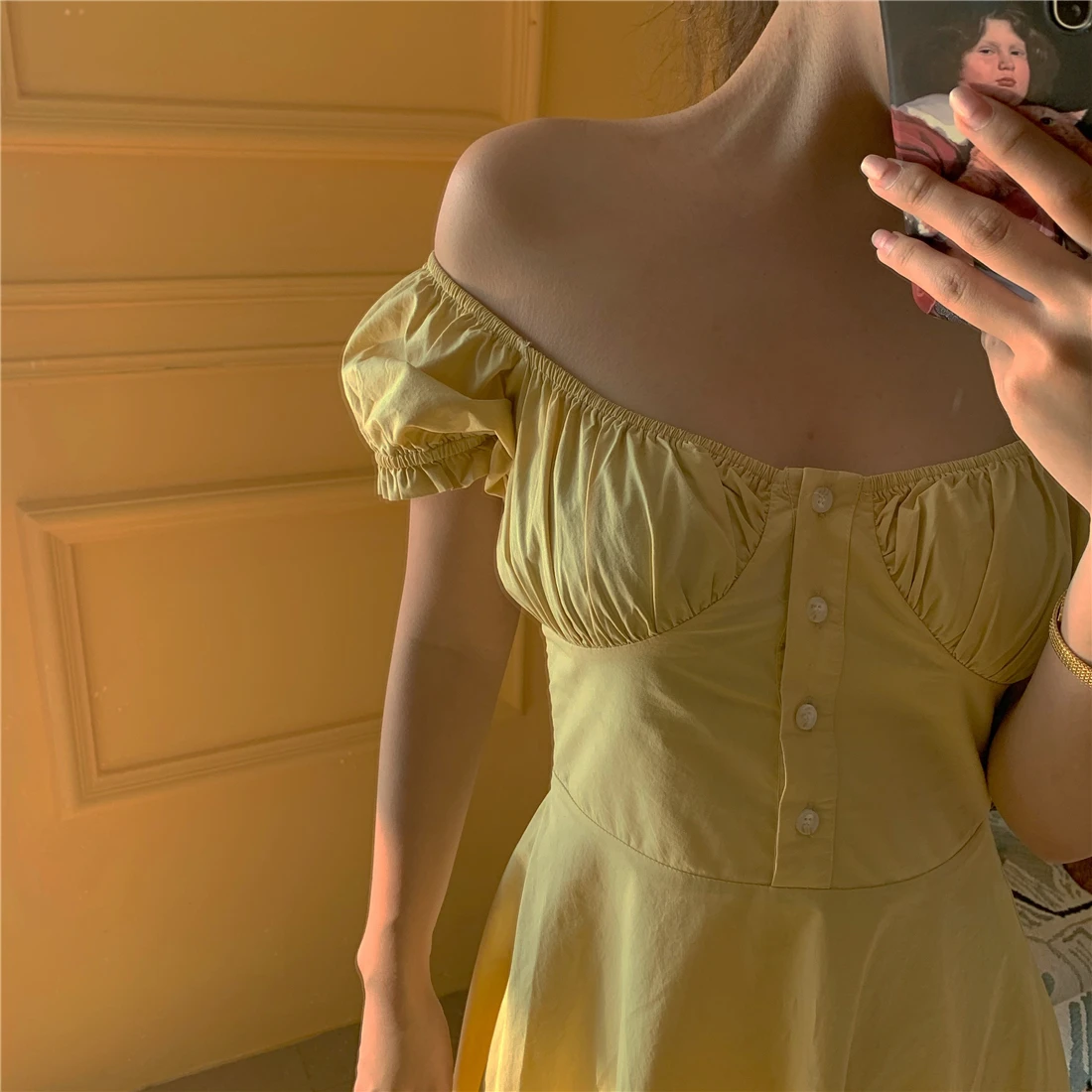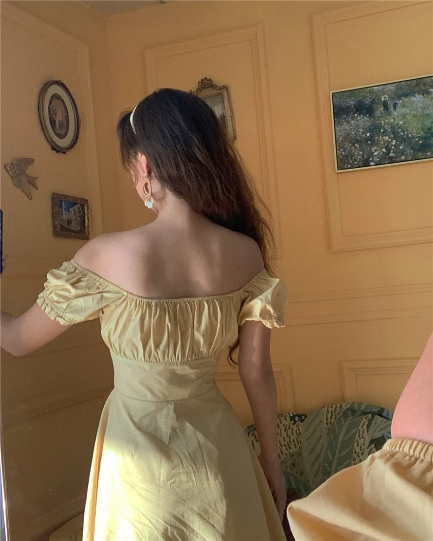MQTIME - Is Tender Goose Yellow Girl's First Love One Shoulder A-type Large Swing Cotton Dress