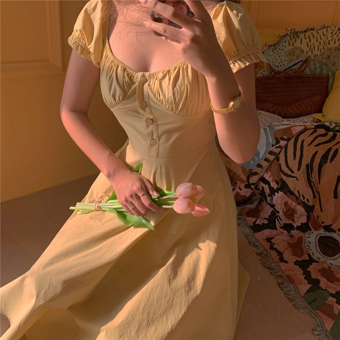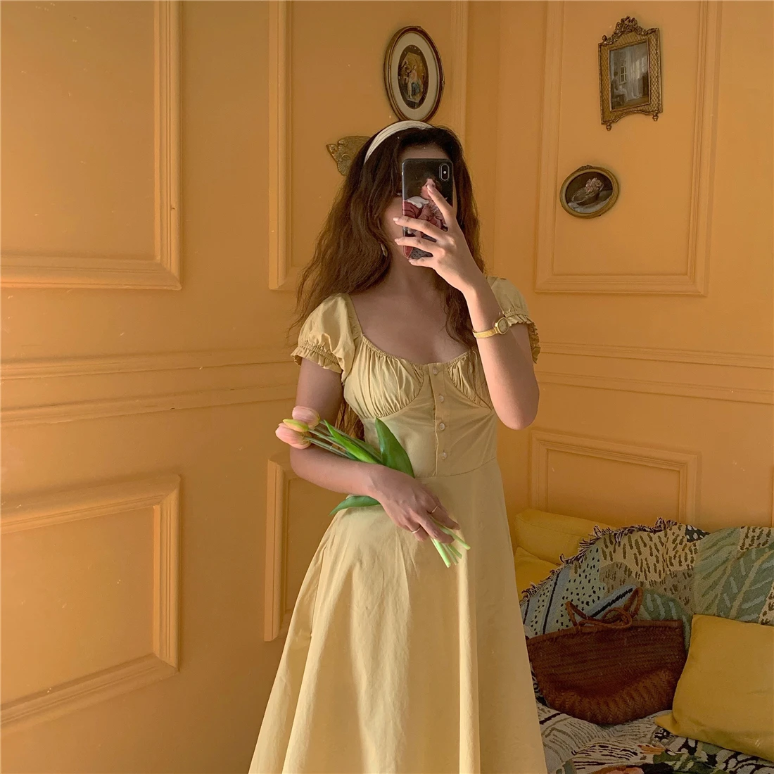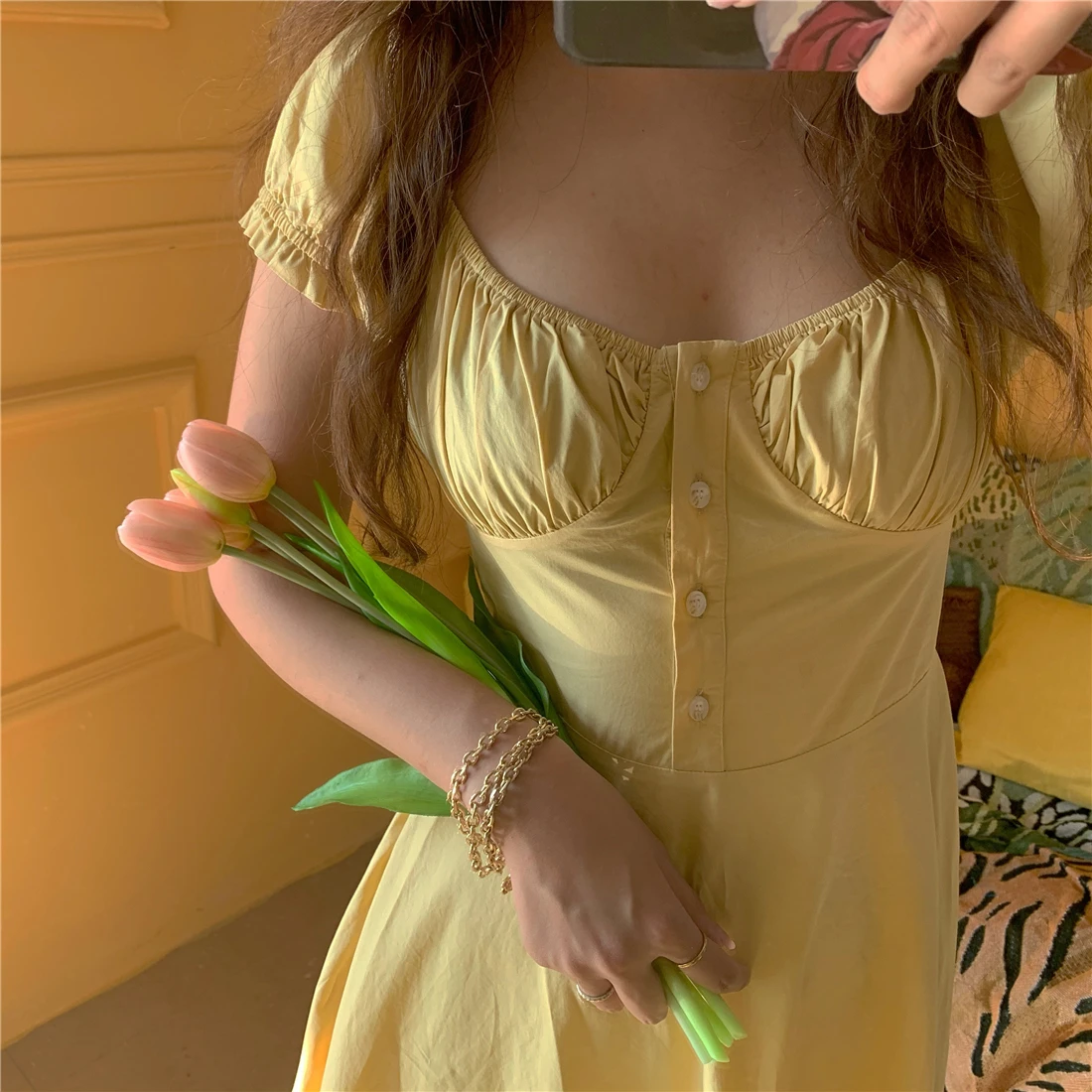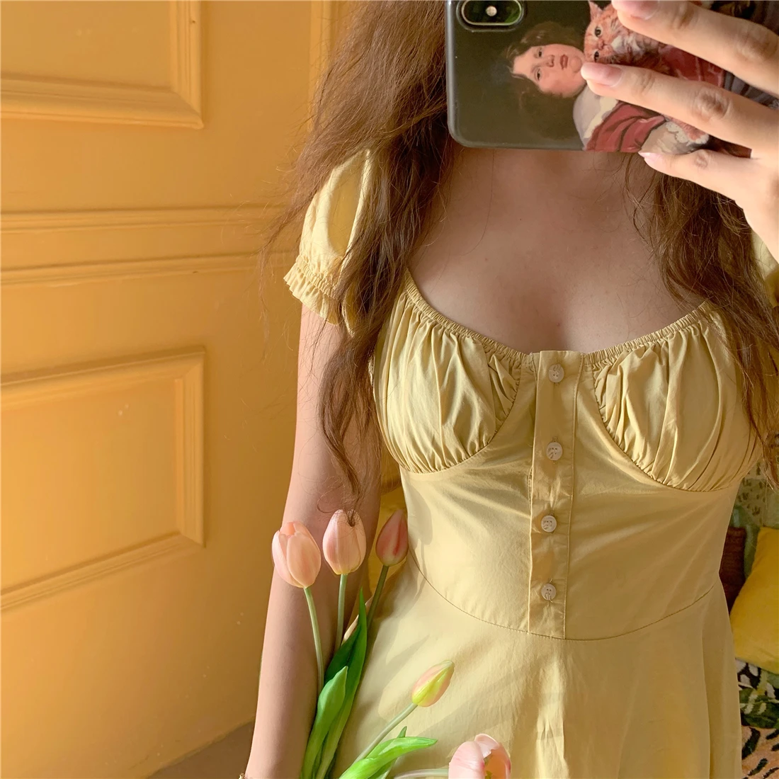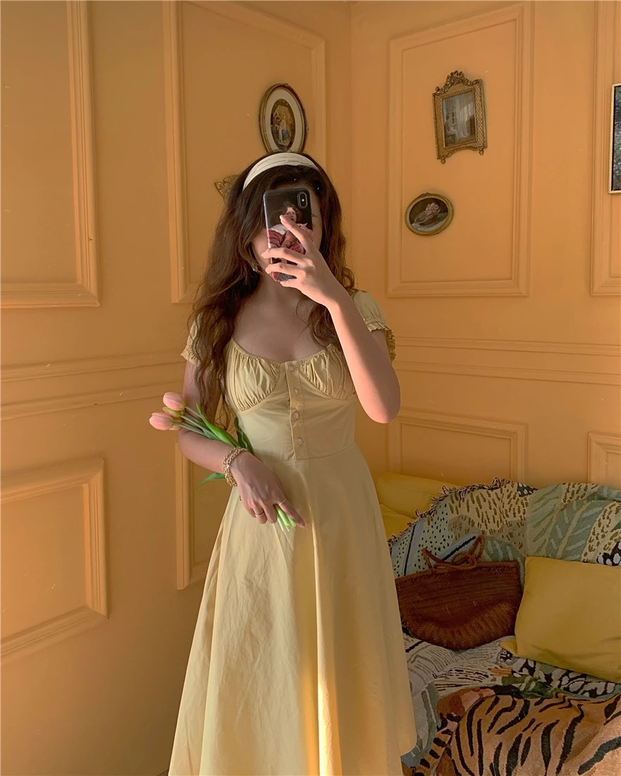 MQTIME - Is Tender Goose Yellow Girl's First Love One Shoulder A-type Large Swing Cotton Dress