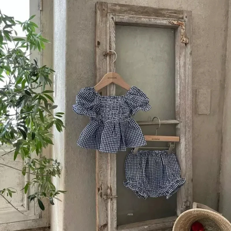 Mqtime Kids Toddlers Plaid Cotton Smocked Top Shorts Set Fashion Summer Baby Girl Clothes Set Design Bubble Sleeve Princess Dress