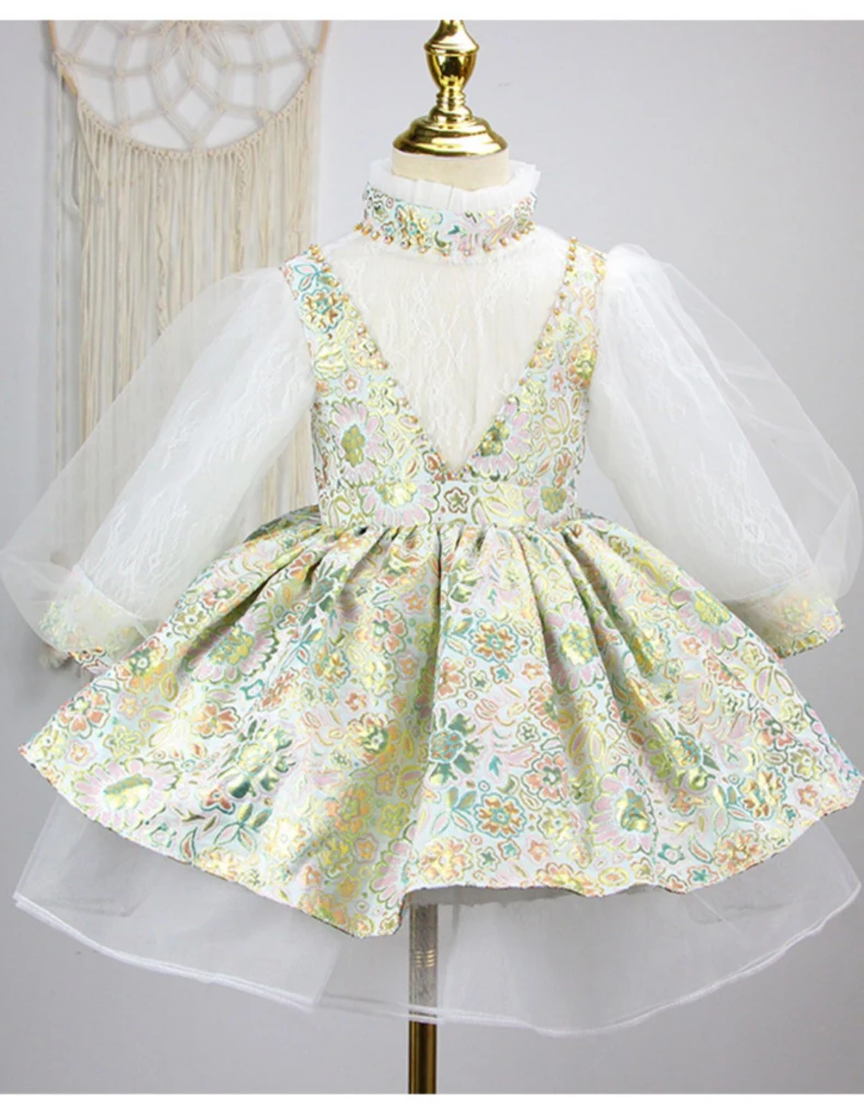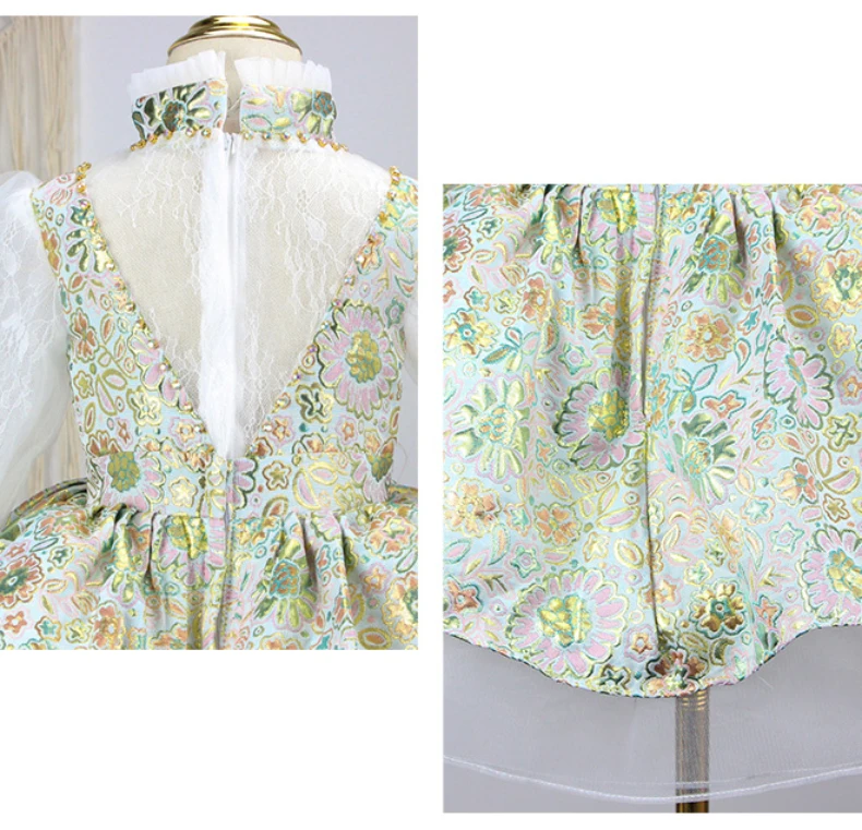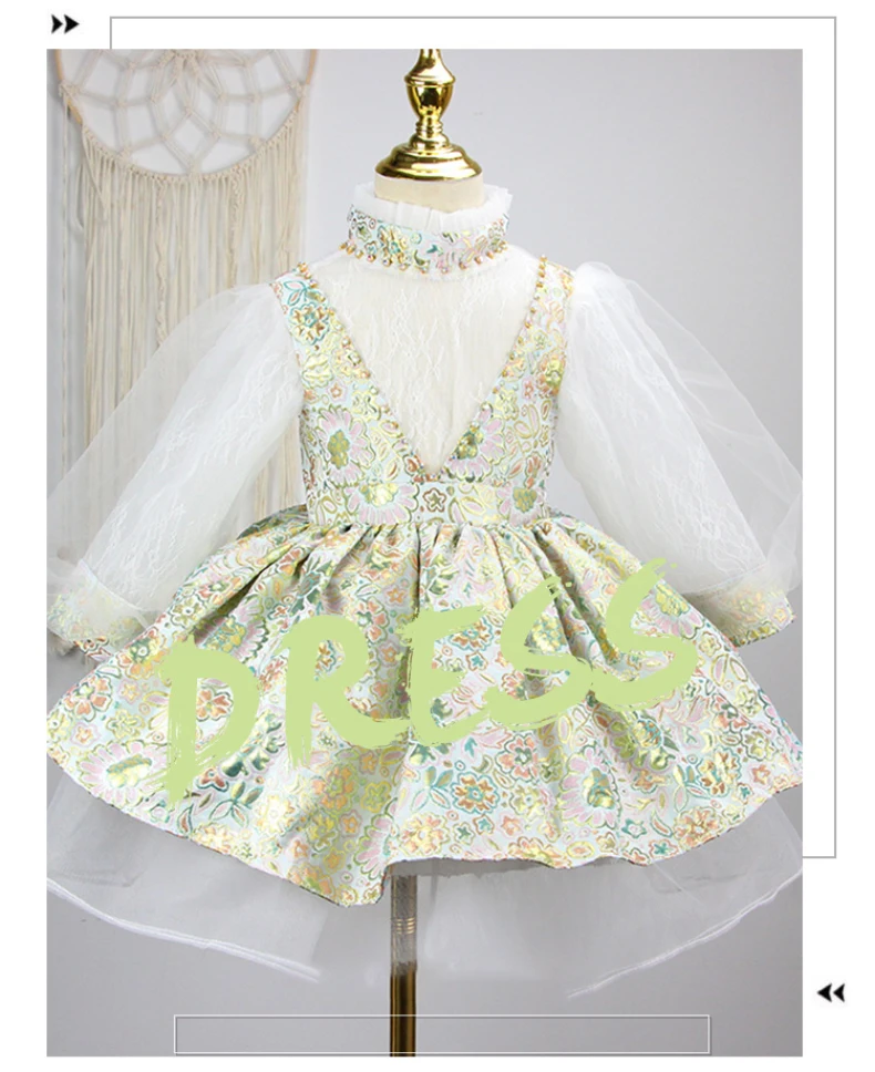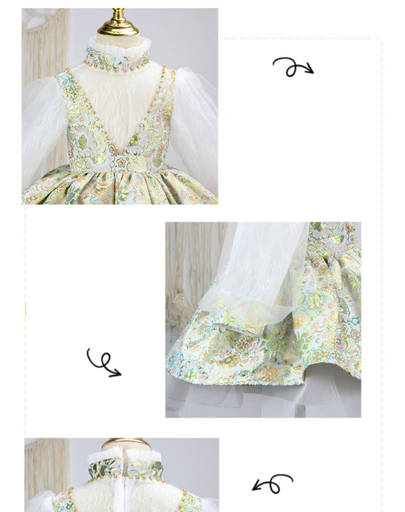 MQTIME - Kids Tulle Layered Flower Girl Dress Lace High O-Neck Puff Sleeve Formal Prom Gown Children Performance Dresses for 2-10Y