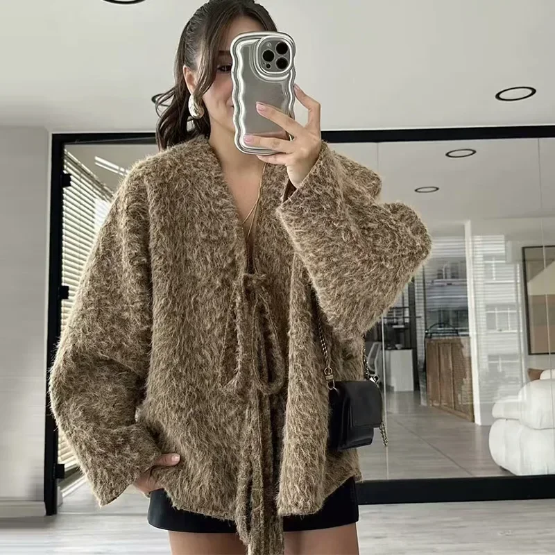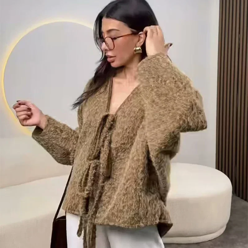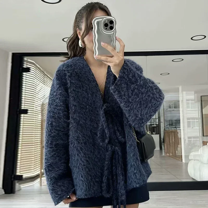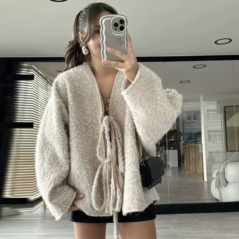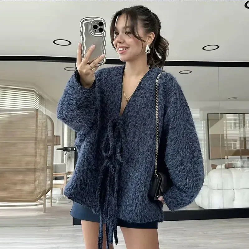 MQTIME - Knit Lace Up Women Cardigan Loose V Neck Hollow Out Long Sleeves Sweater Female 2024 Autumn Elegant Lady Knitwear