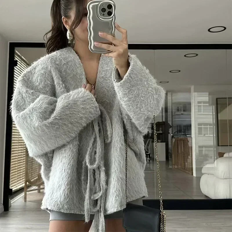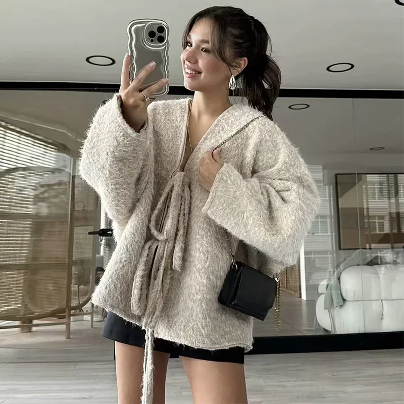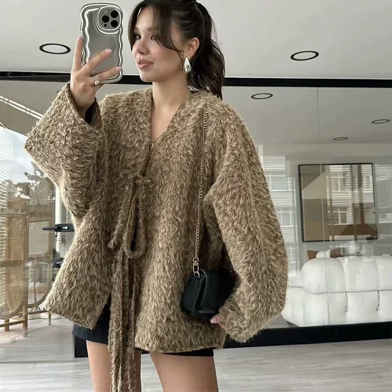 MQTIME  -  Knit Lace Up Women Cardigan Loose V Neck Hollow Out Long Sleeves Sweater Female 2024 Autumn Elegant Lady Knitwear