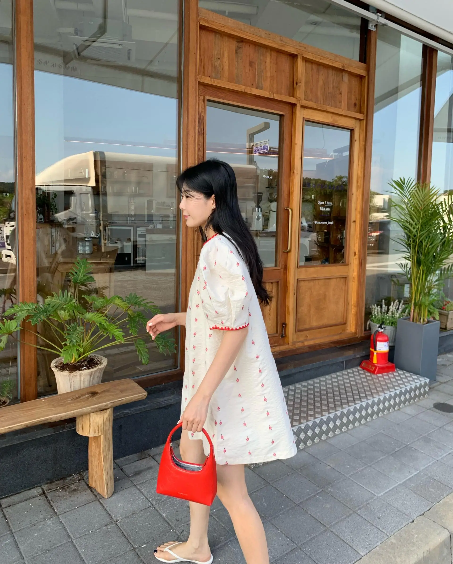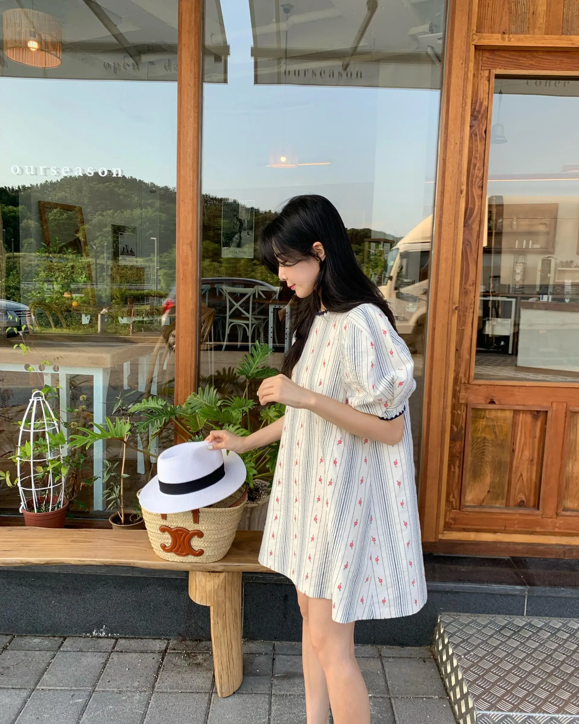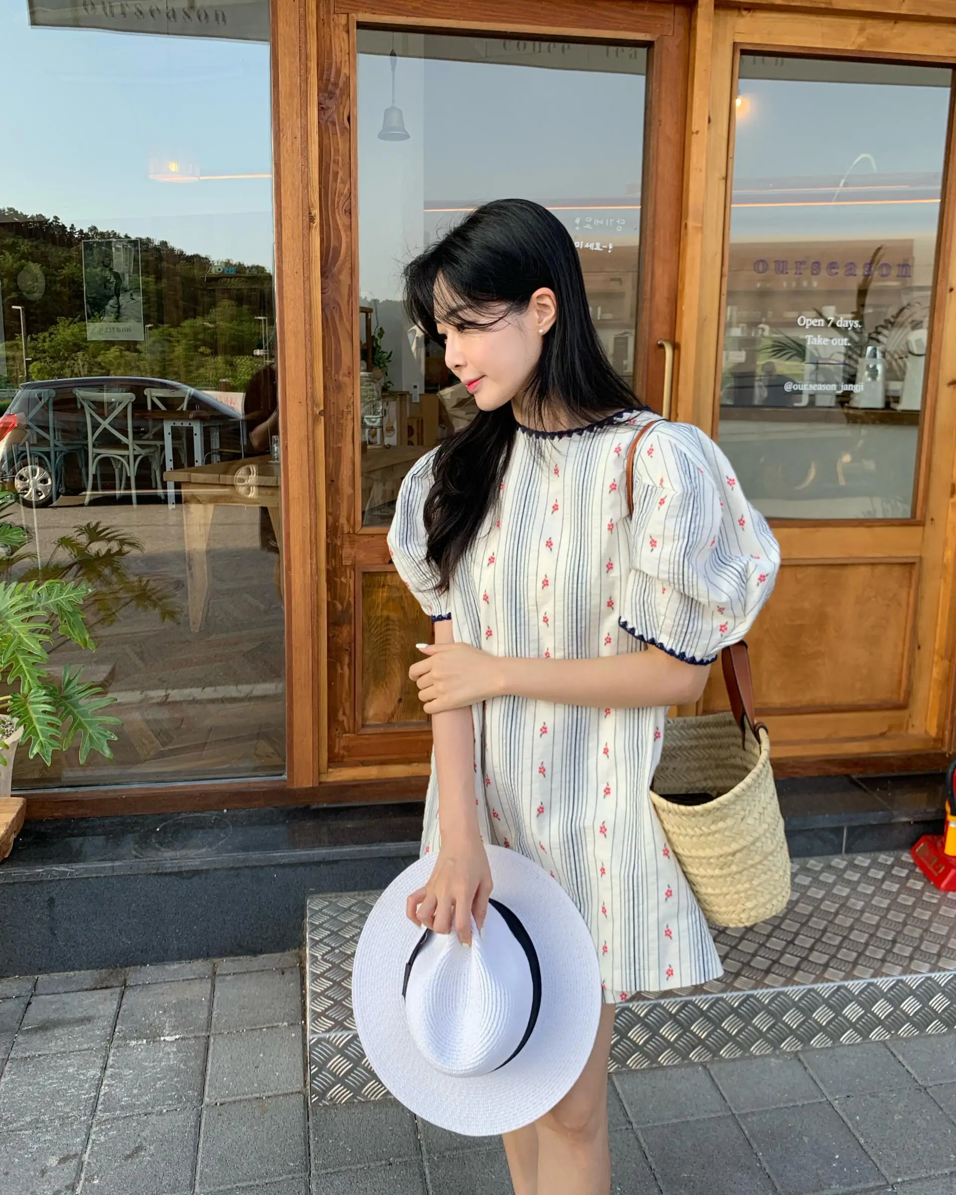 MQTIME - Korean Fashion Ins Dress Bubble Sleeve Age Reduction Skirt Female Vestidos New Summer Contrast Color Striped Dresses