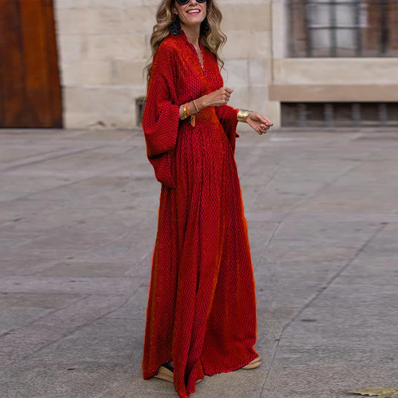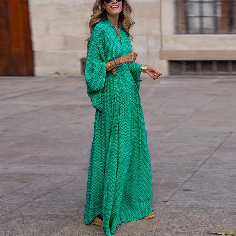 MQTIME  -  Ladies Pattern Print Slim Long Dress 2024 New Fashion High Waisted Office Dresses Elegant V-neck Long Sleeved Autumn Dresses