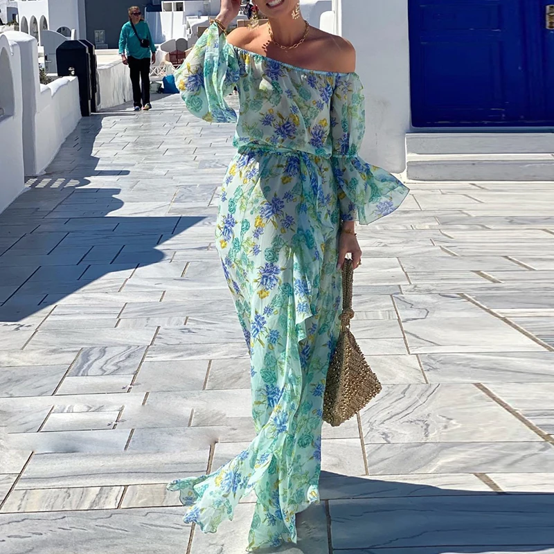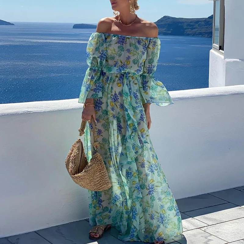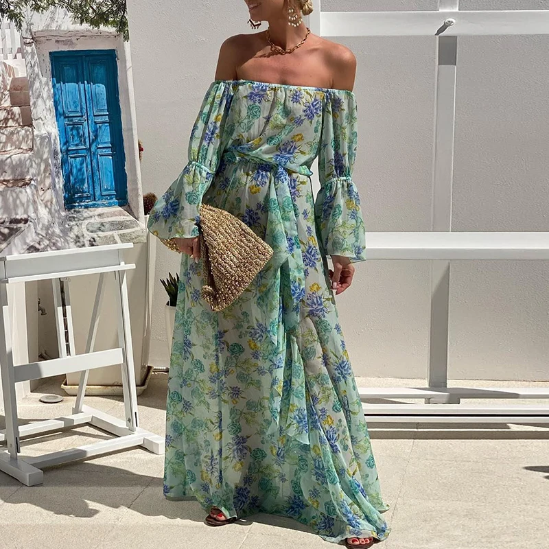 MQTIME - Ladies Slash Neck High Waist Party Dress Fashion Floral Print Flare Sleeves Beach Dresses Bohemian Vacation Chiffon Long Dress