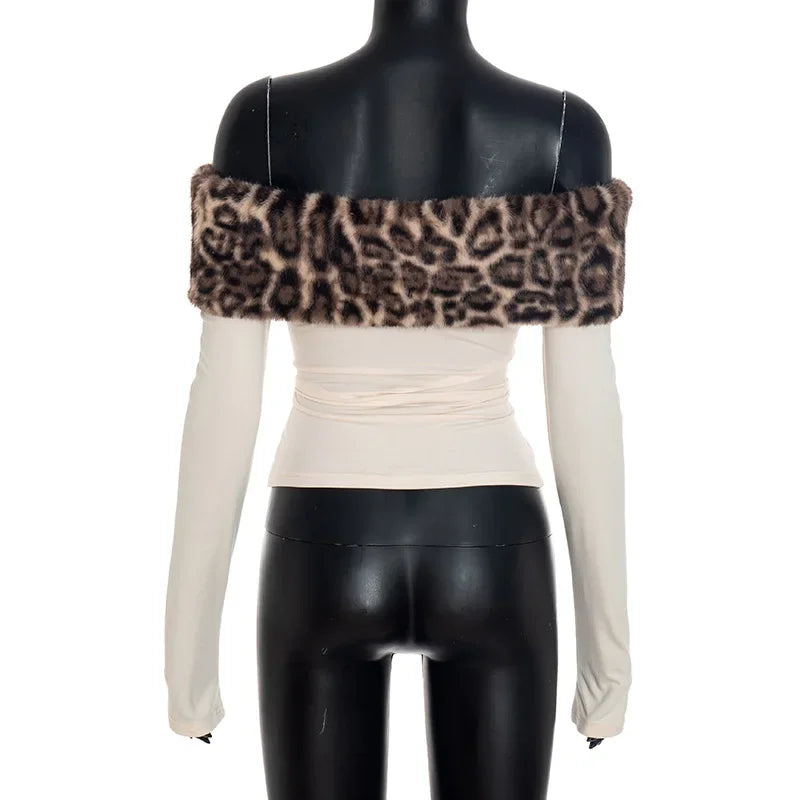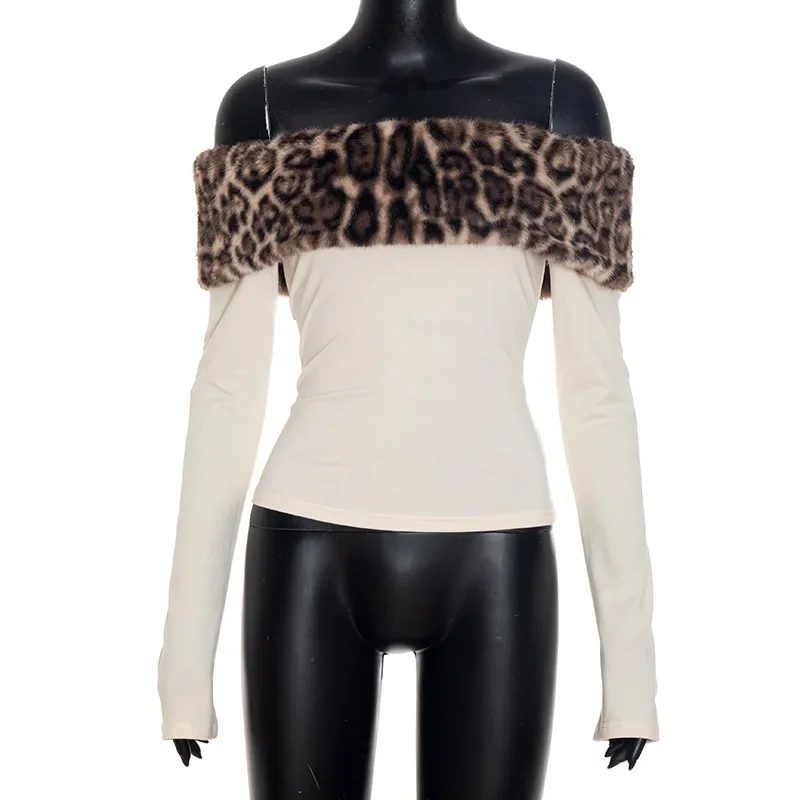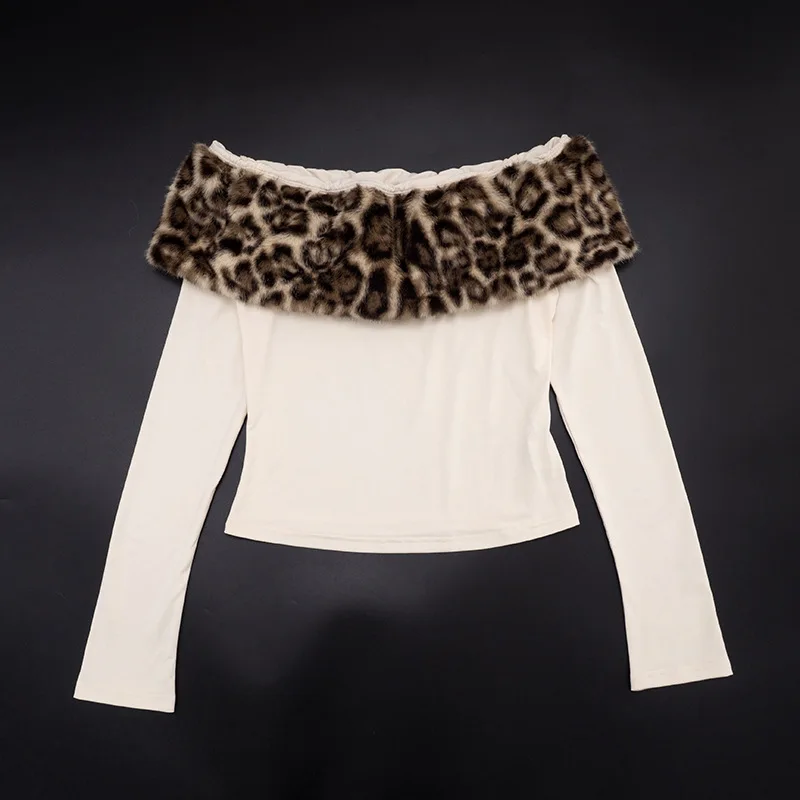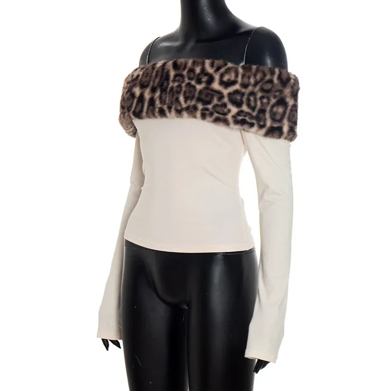 MQTIME - Leopard Print Faux Fur Patchwork Slim T-shirts Women Sexy Casual Slash Neck Off Shoulder Long Sleeve Streetwear Tees Tops