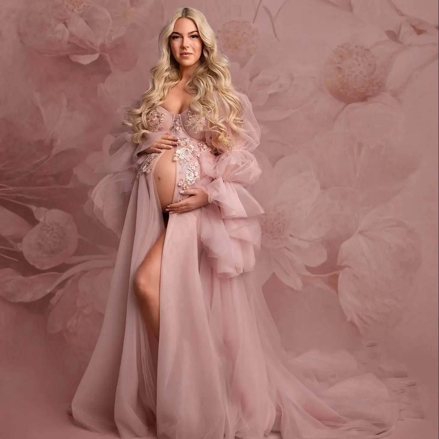 MQTIME - Light Pink Maternity Robe for Babyshower Illusion Sweetheart Lace Appliques Prom Gown for Pregnant Women Customized Photoshoot