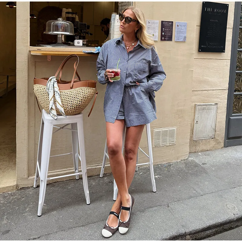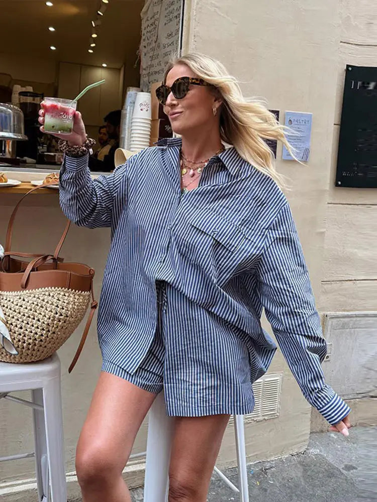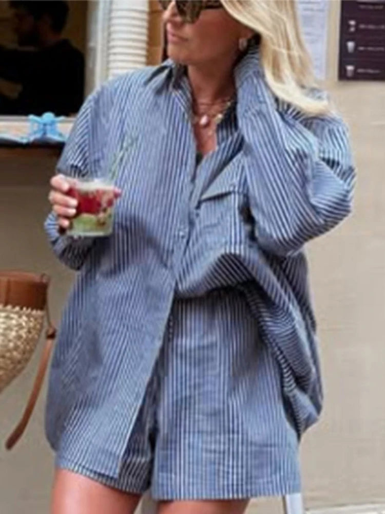 MQTIME - Loose 2 Pieces Women Summer Set Striped Plaid Turn-down Collar Long Sleeve Shirt Short Pants Outfits Female Shorts Suit