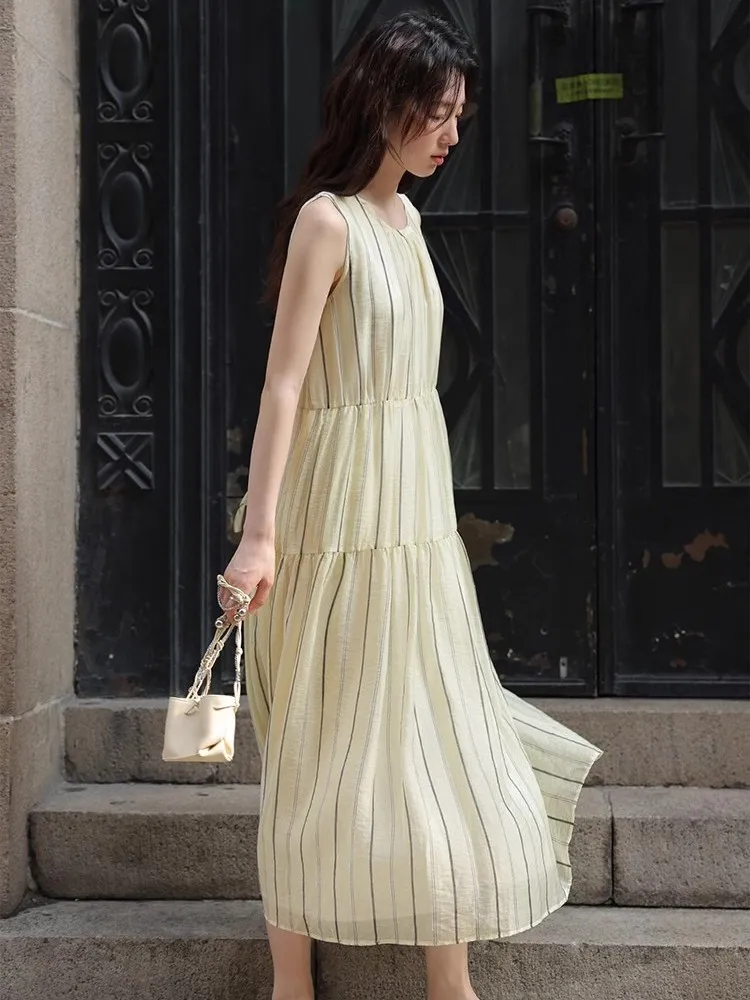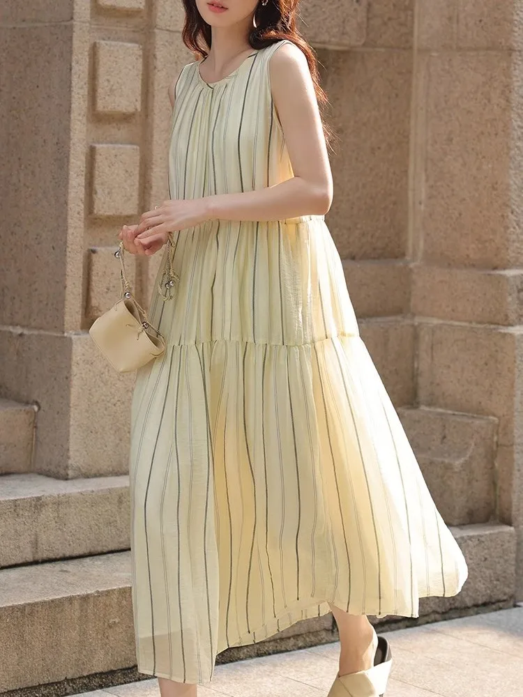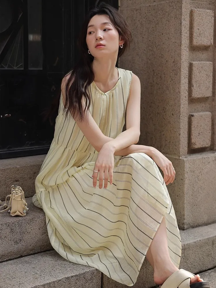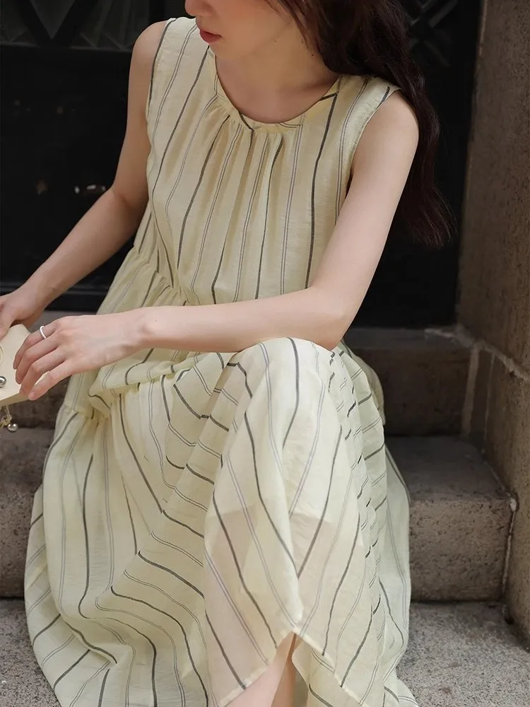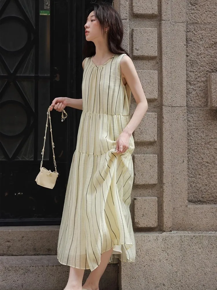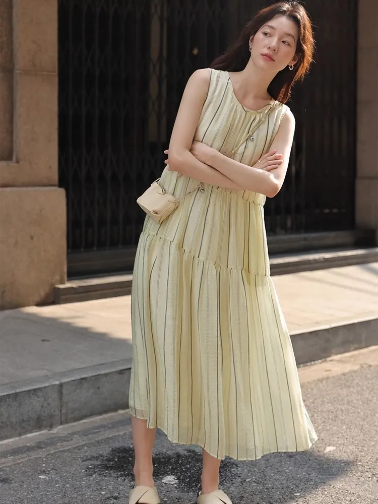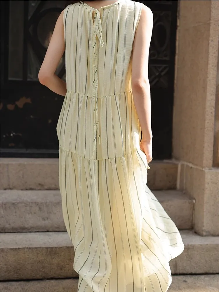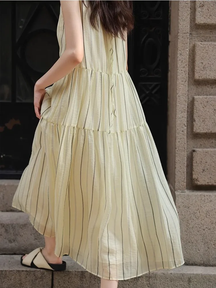 MQTIME - Loose Striped Dress 2024 Summer Small Fresh Round Neck Tie Fashion Casual Temperament Long Skirt