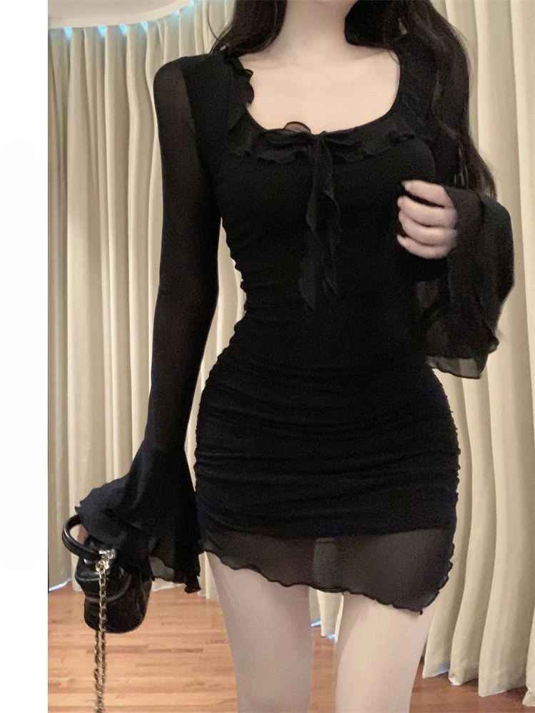 MQTIME  -  Lotus Leaf Long Sleeve Dress Slim Mesh Hip Skirt Light Mature Style Pure Wind Waist Spice Girl Short Dresses