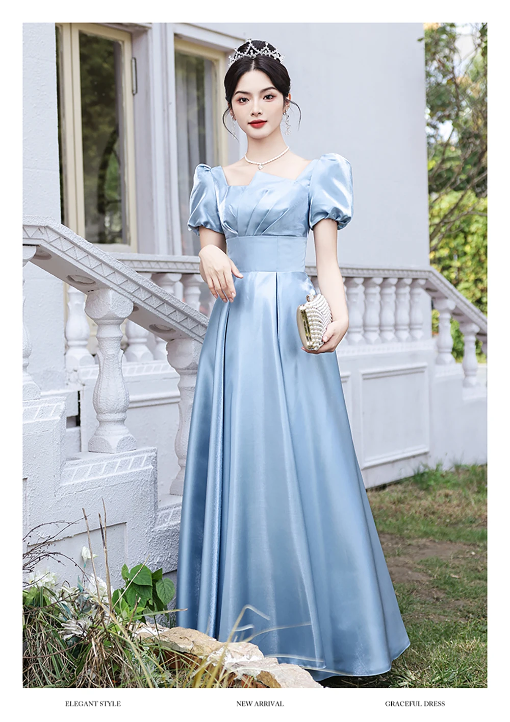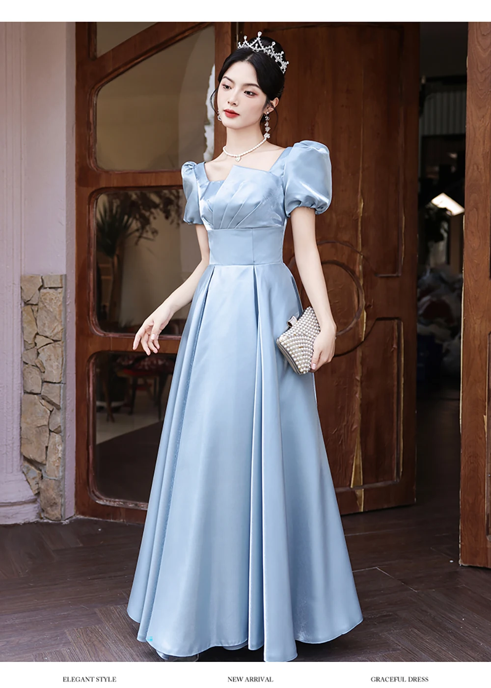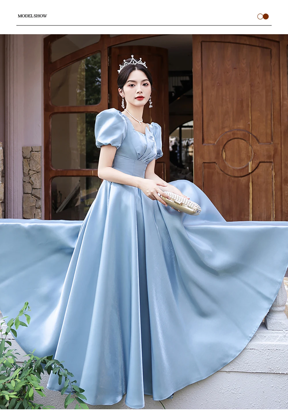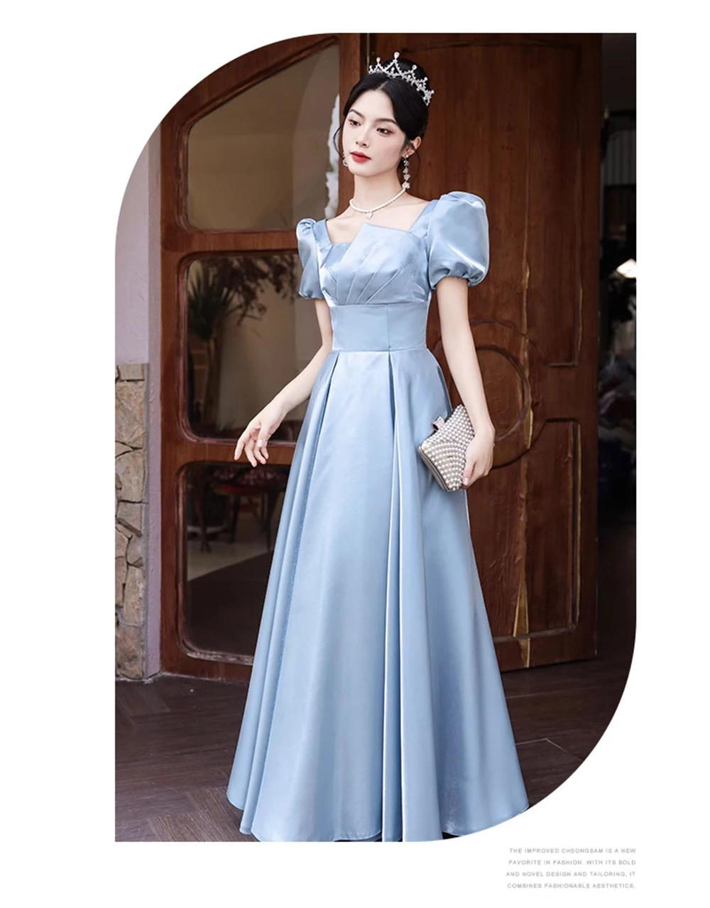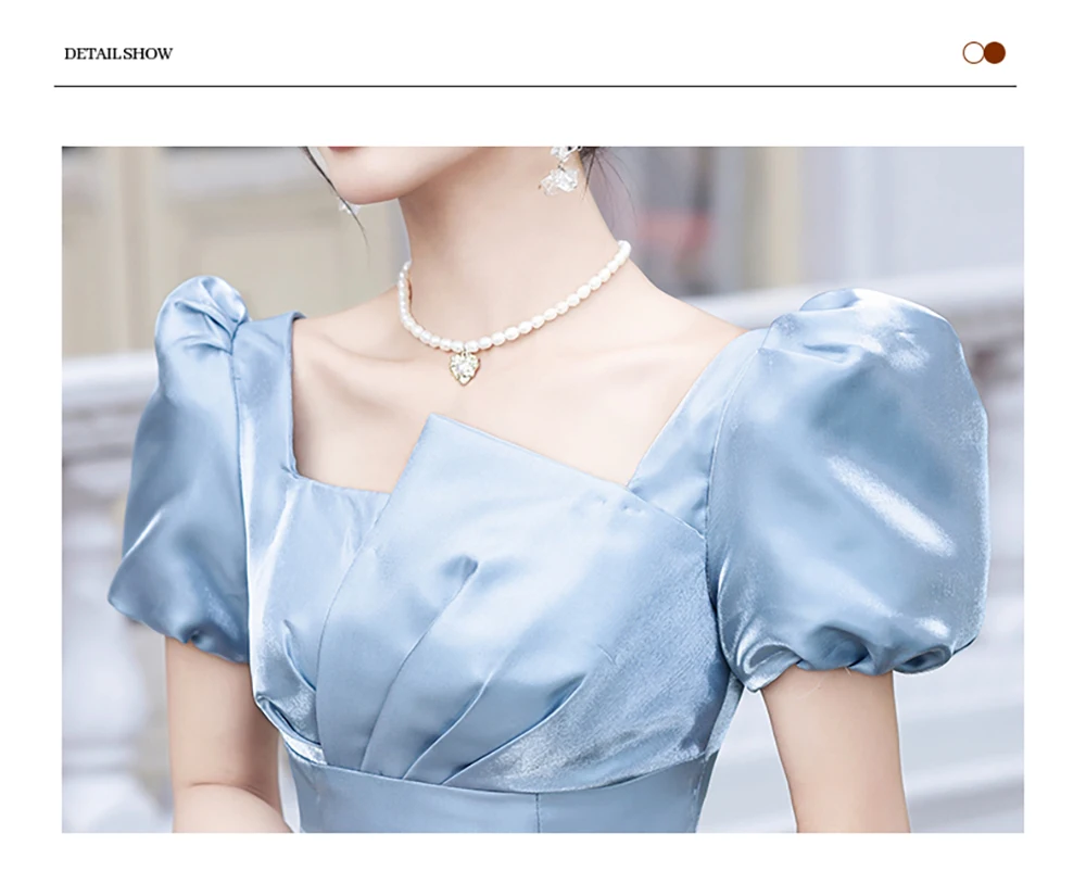 MQTIME - Luxury Blue Satin Princess Dress Women Elegant Square Collar Satin Pearlized Long Evening Dresses Quinceanera Stage Prom Gown