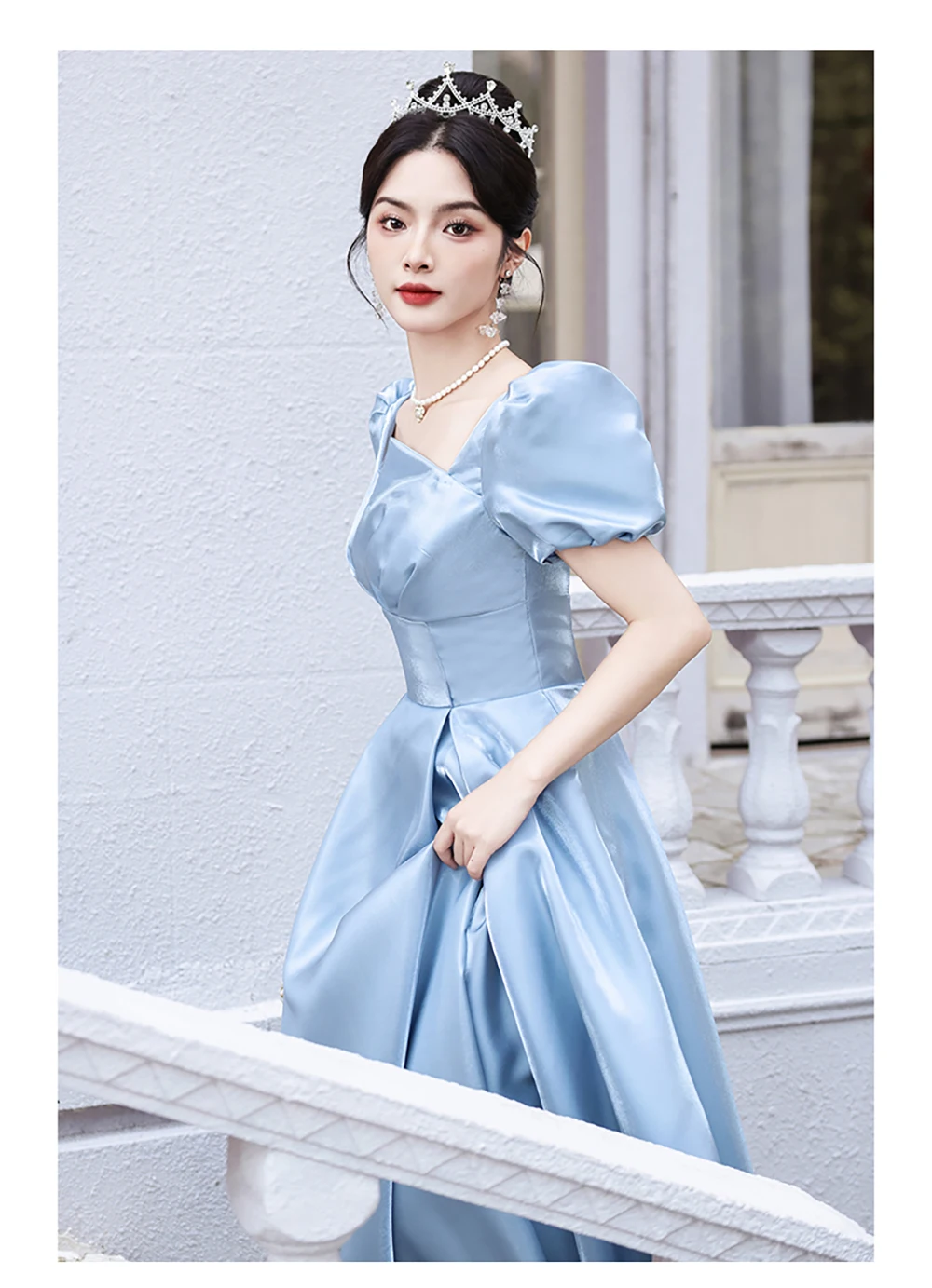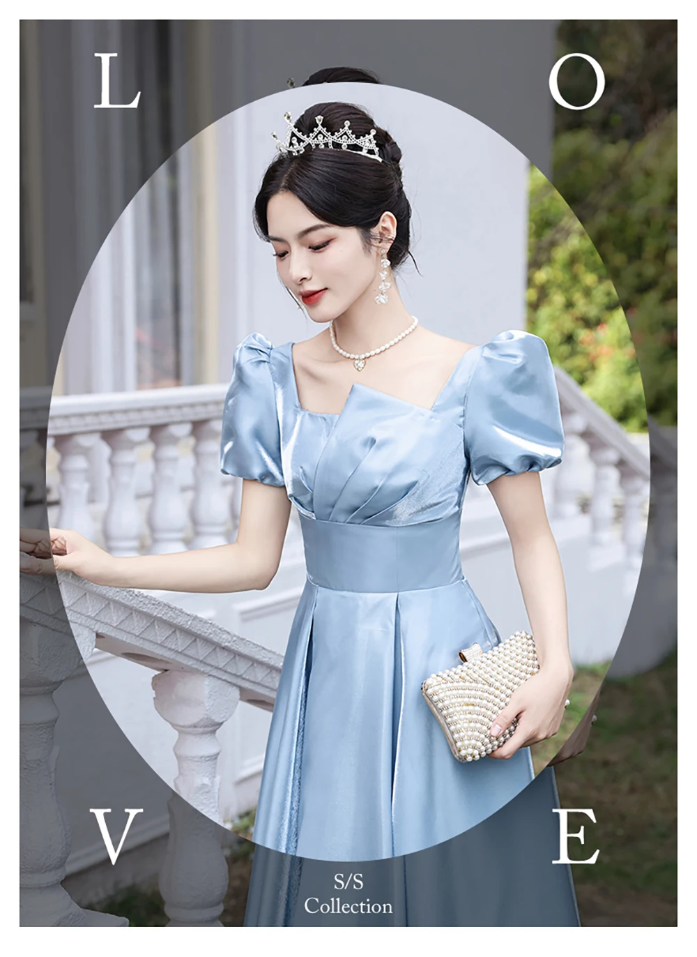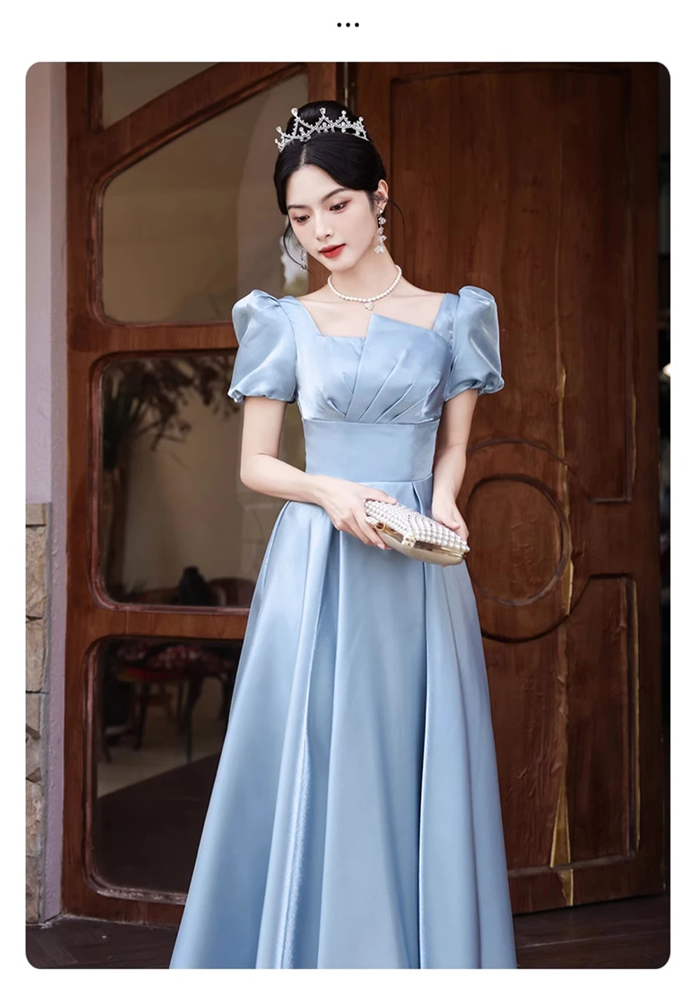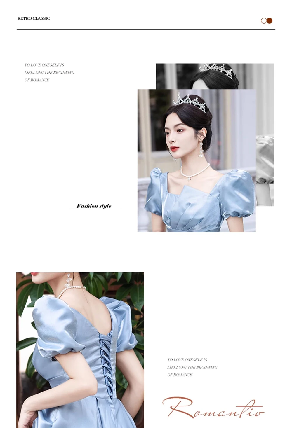 MQTIME - Luxury Blue Satin Princess Dress Women Elegant Square Collar Satin Pearlized Long Evening Dresses Quinceanera Stage Prom Gown