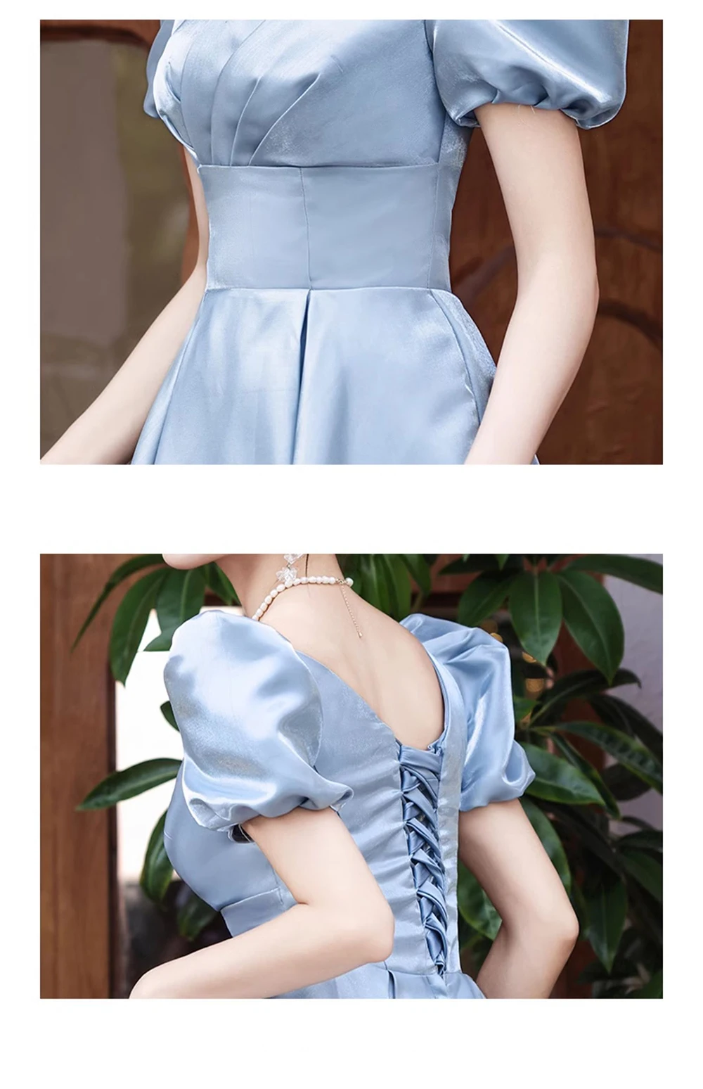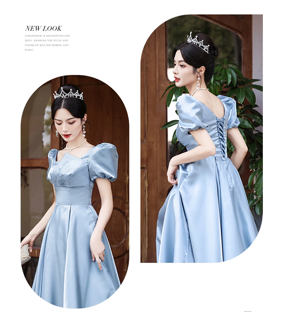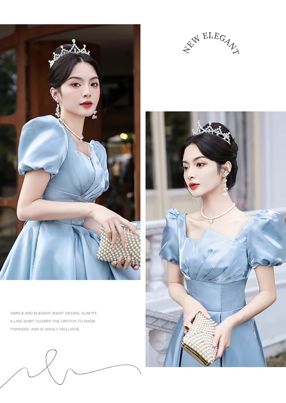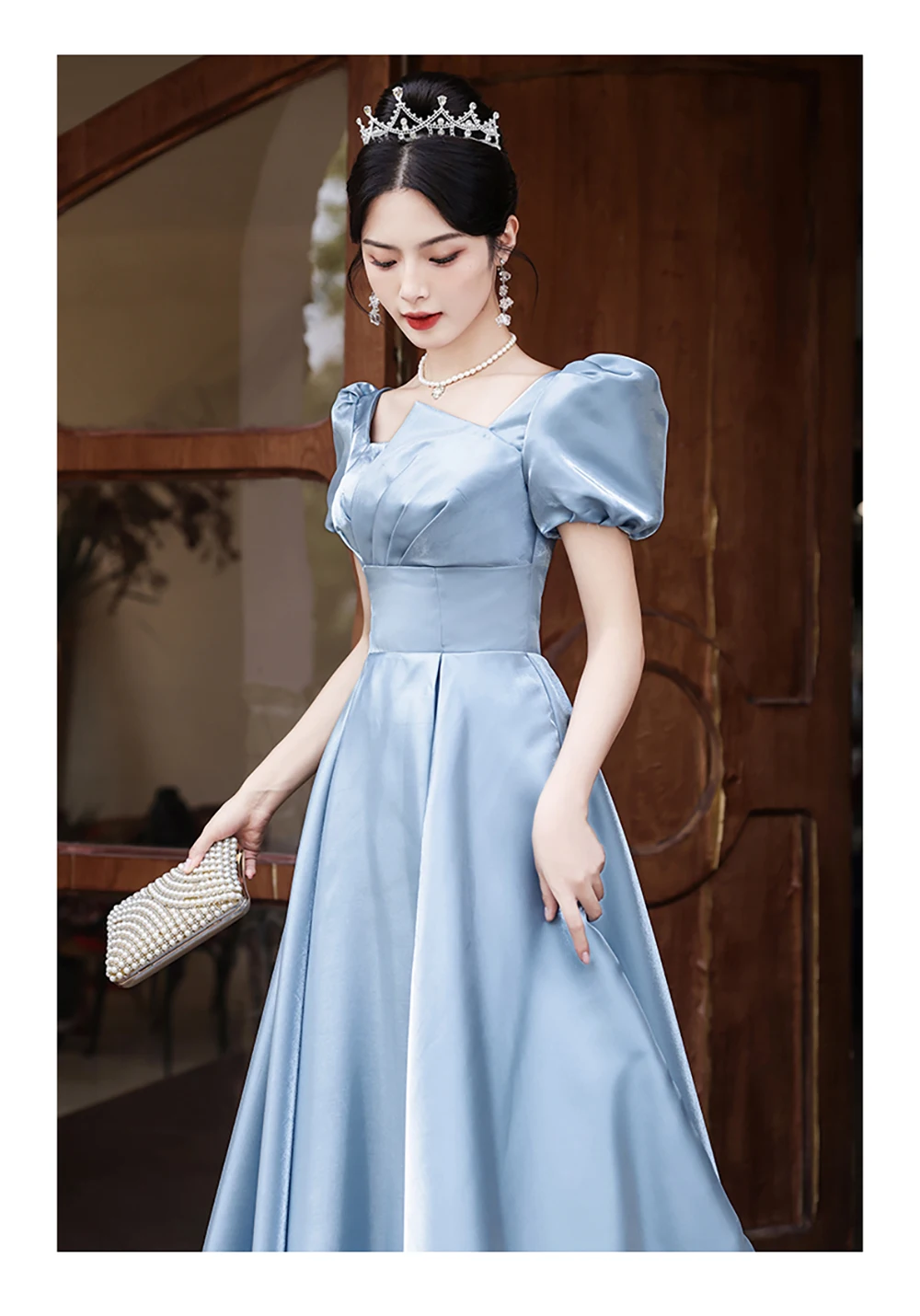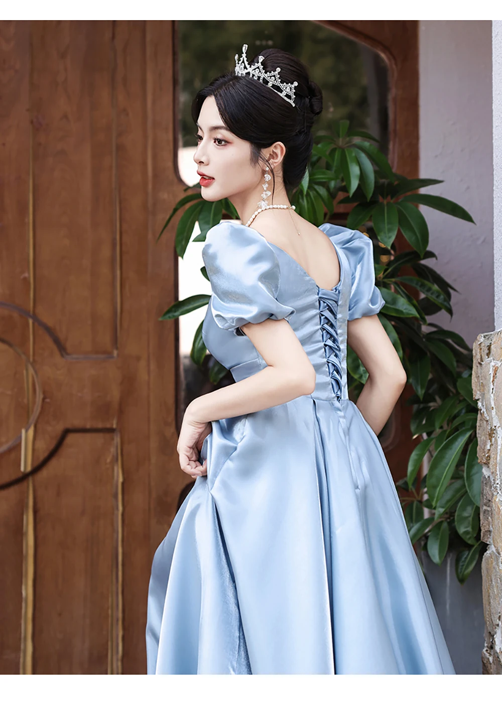 MQTIME - Luxury Blue Satin Princess Dress Women Elegant Square Collar Satin Pearlized Long Evening Dresses Quinceanera Stage Prom Gown