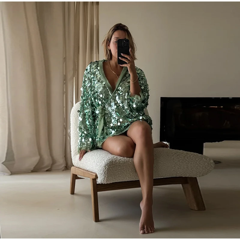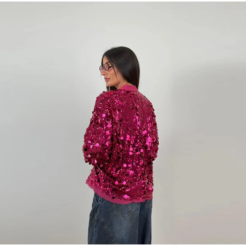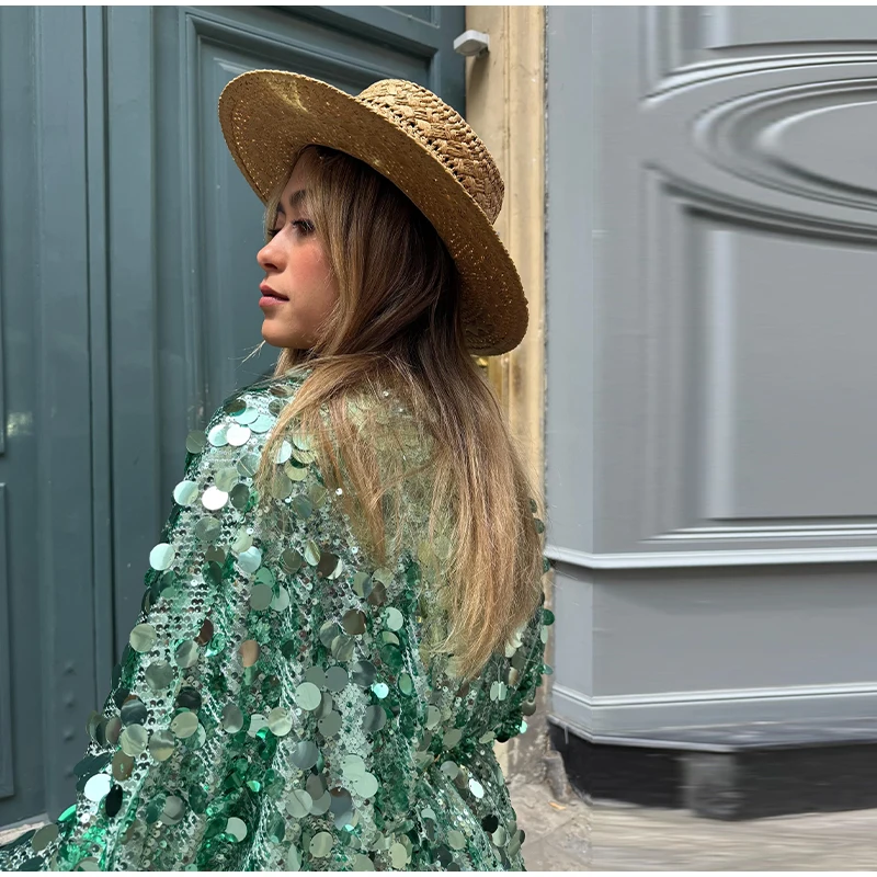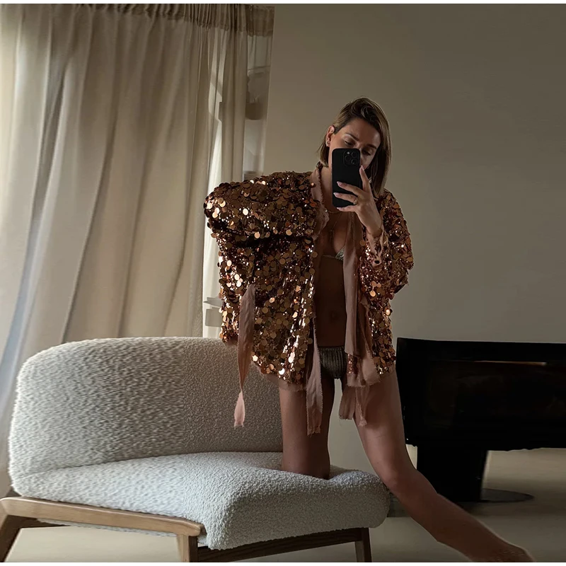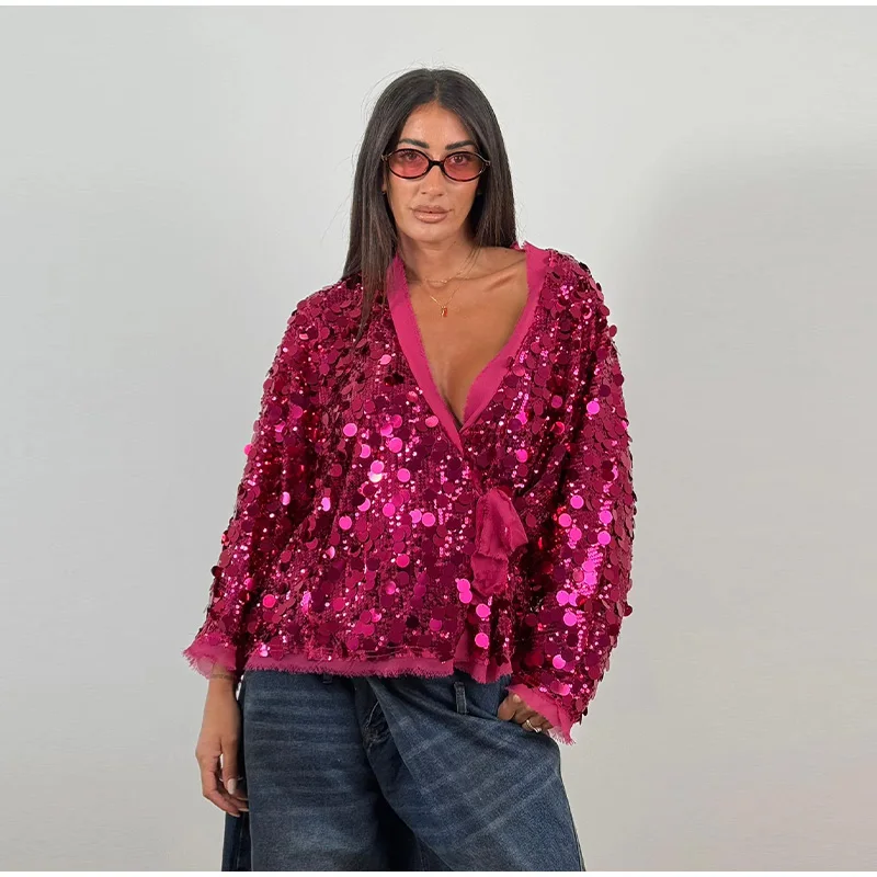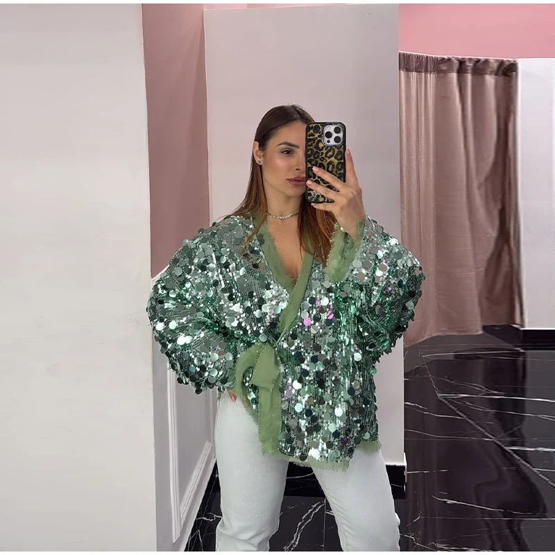 MQTIME - Luxury Sequin Oversized Wrap Jacket Fringe Trim Tie-Waist V-Neck Sparkly Coat Women's Casual Party Club Streetwear Outfits
