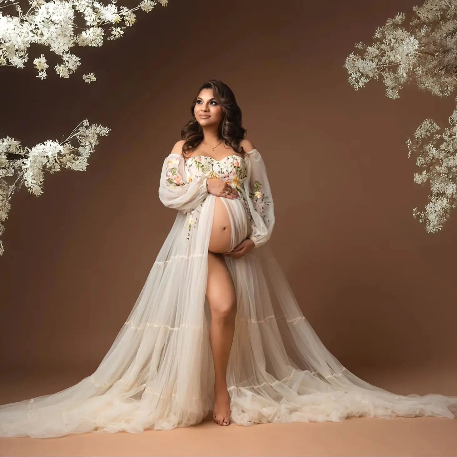 MQTIME - Maternity Dress for Pregnancy Light Champgne Prom Party Gowns with Lace Appliques Photography Props