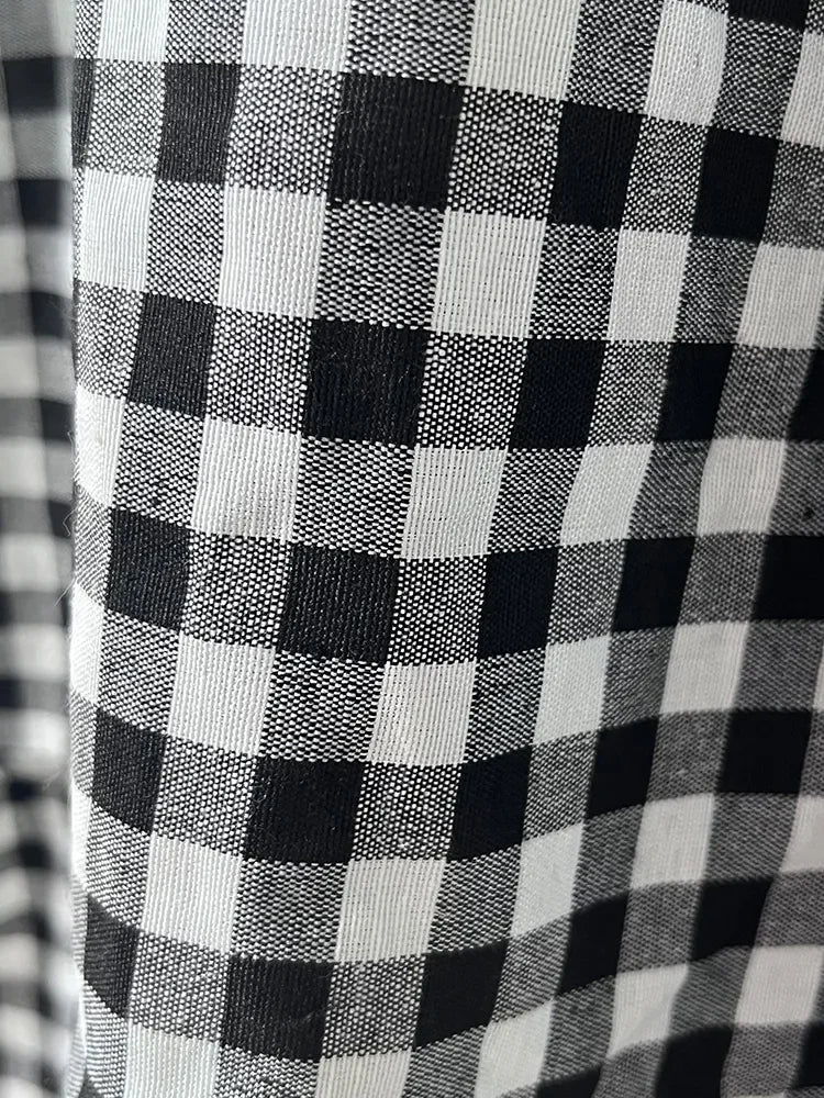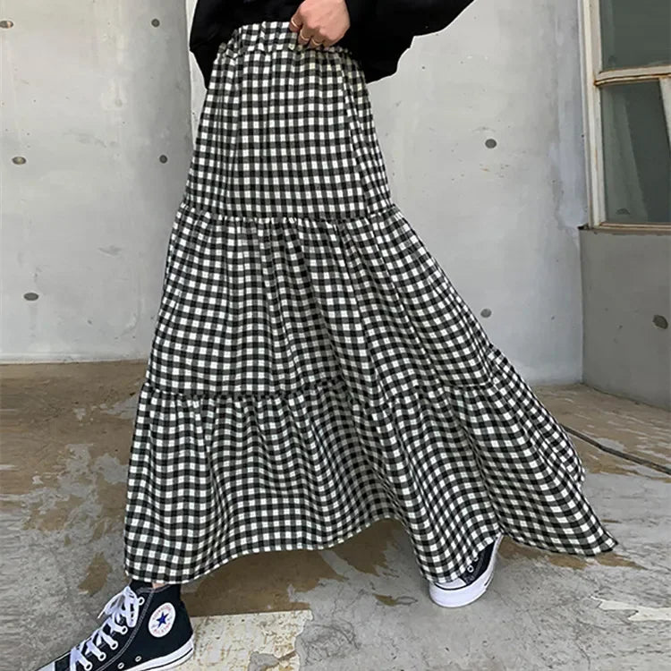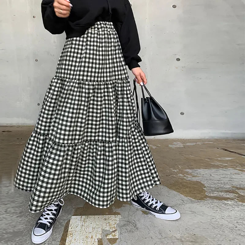 MQTIME - Maxi Gingham Skirt Women Ankle Length Cotton-linen Black & White Plaid Elastic Waist Tiered Pleated Long Skirt Ladies falds