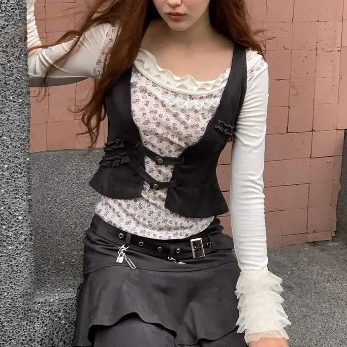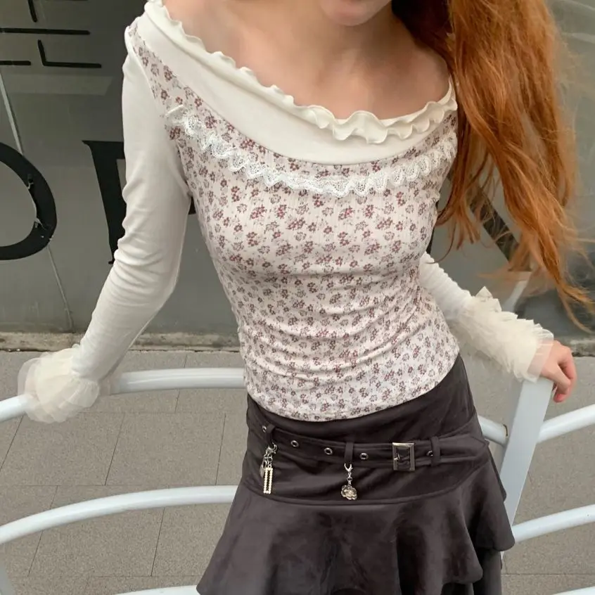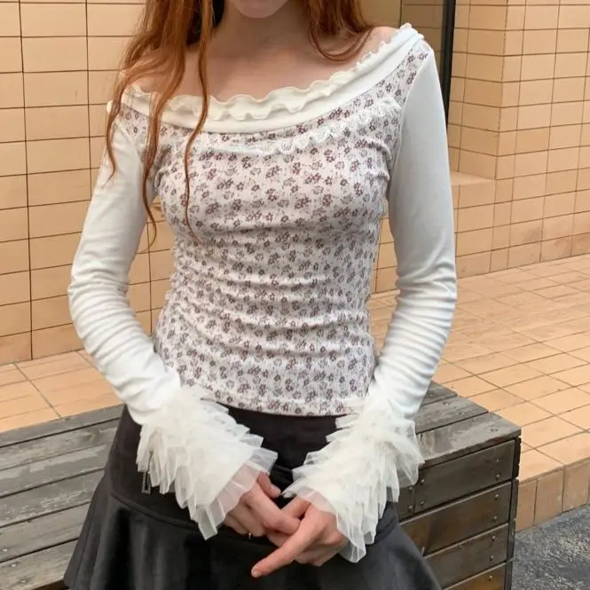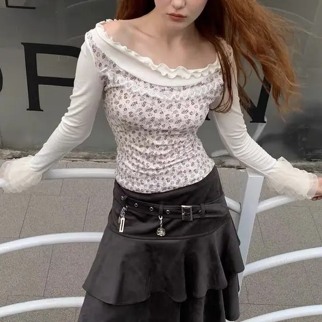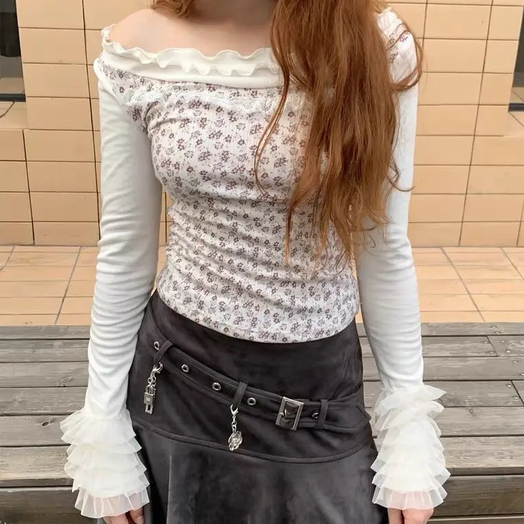 MQTIME - Mesh Fungus Ruffle Flower Graphic Slim Top Off Shoulder T-Shirt Women Fall T Shirt harajuku fairycore 2000s y2k grunge aesthetic