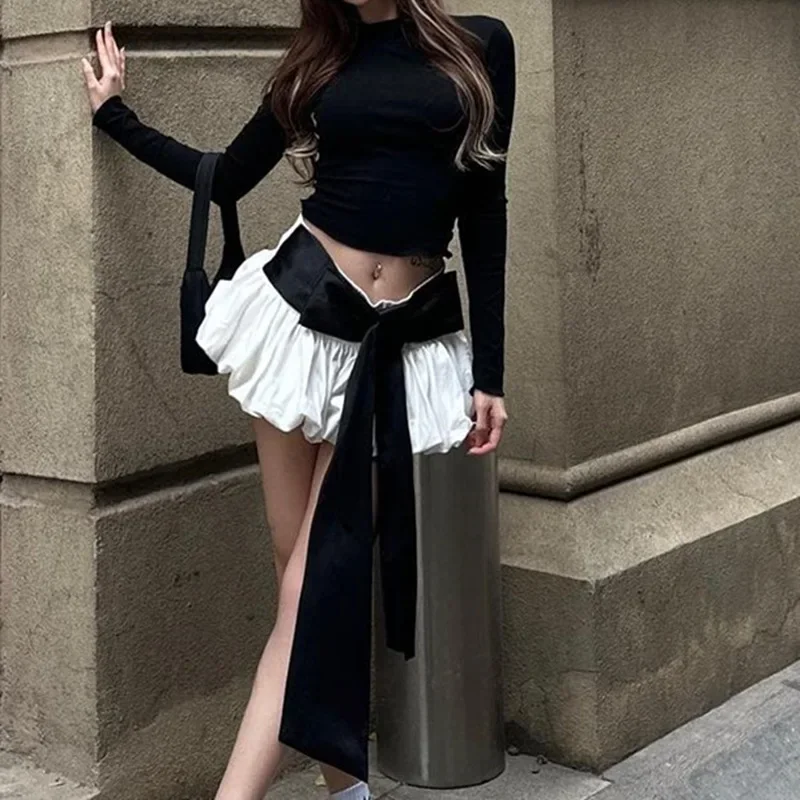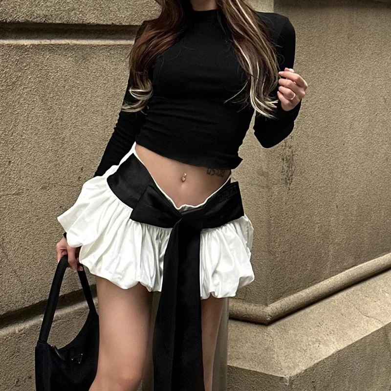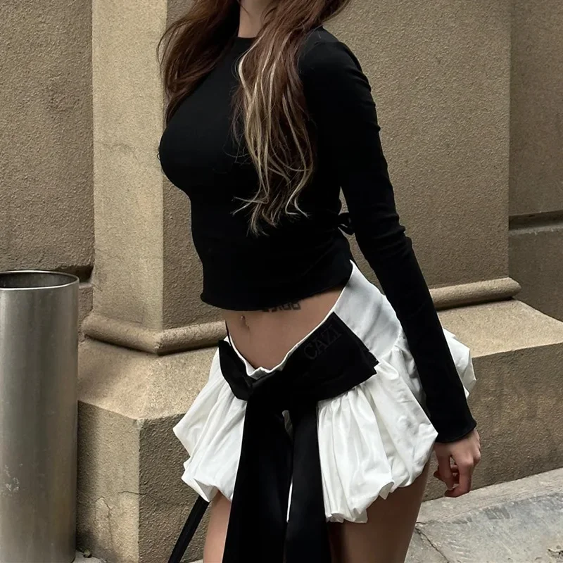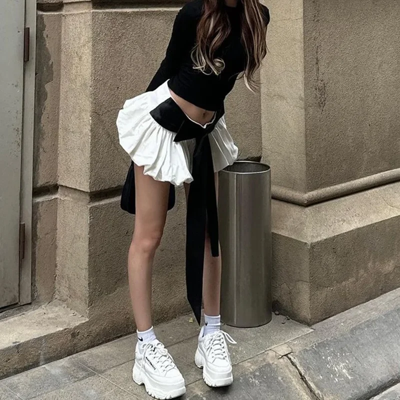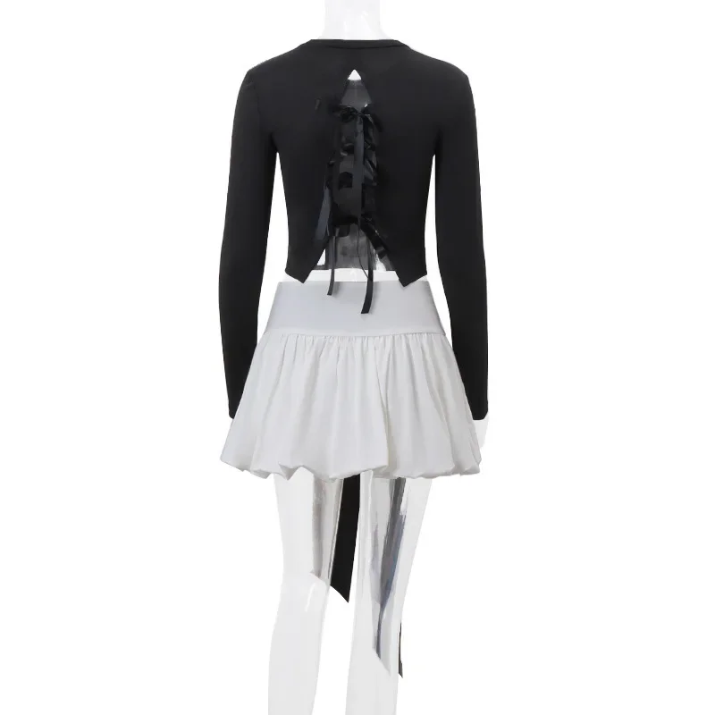 MQTIME - New Bow Skirt Sets For Women Sexy Backless Bandage Lace Up Shirt Femme Fashion Folds Mini Skirts 2 Piece Suits Women Outfits