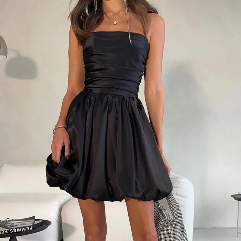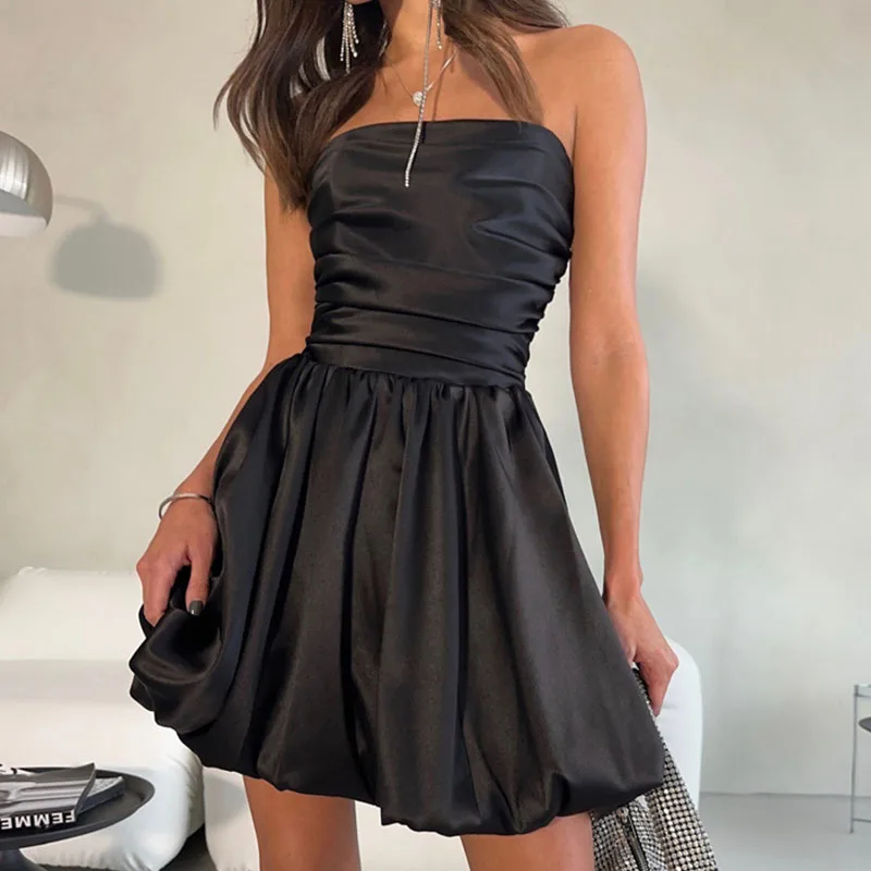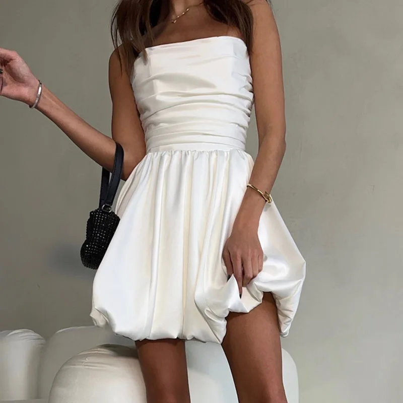 MQTIME - New French Style Design Mini Dress Fashion Sweet Pleated Waist Solid Party Dress 2024 Women Elegant Strapless Satin A-Line Dress