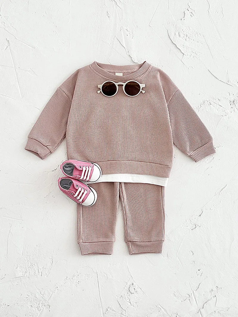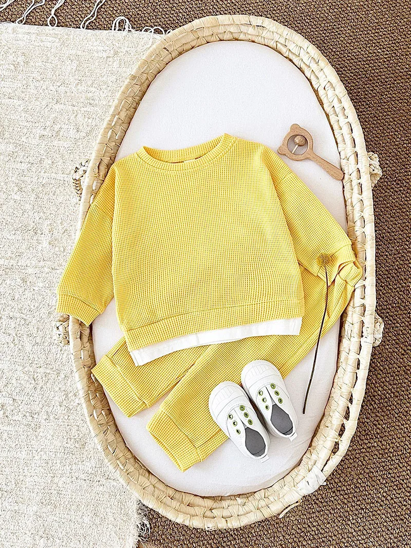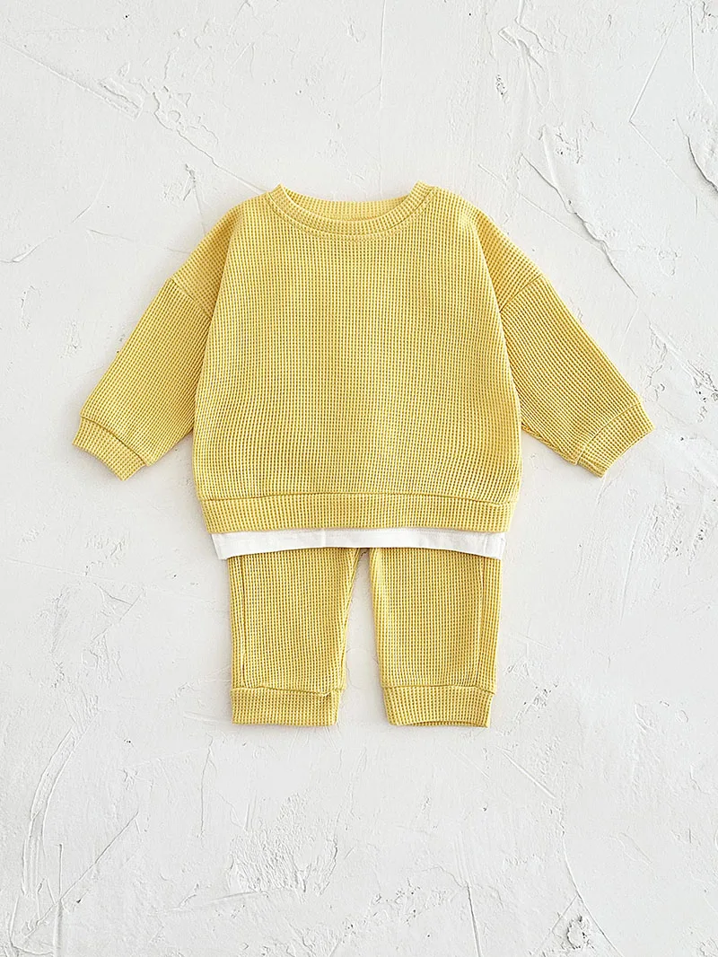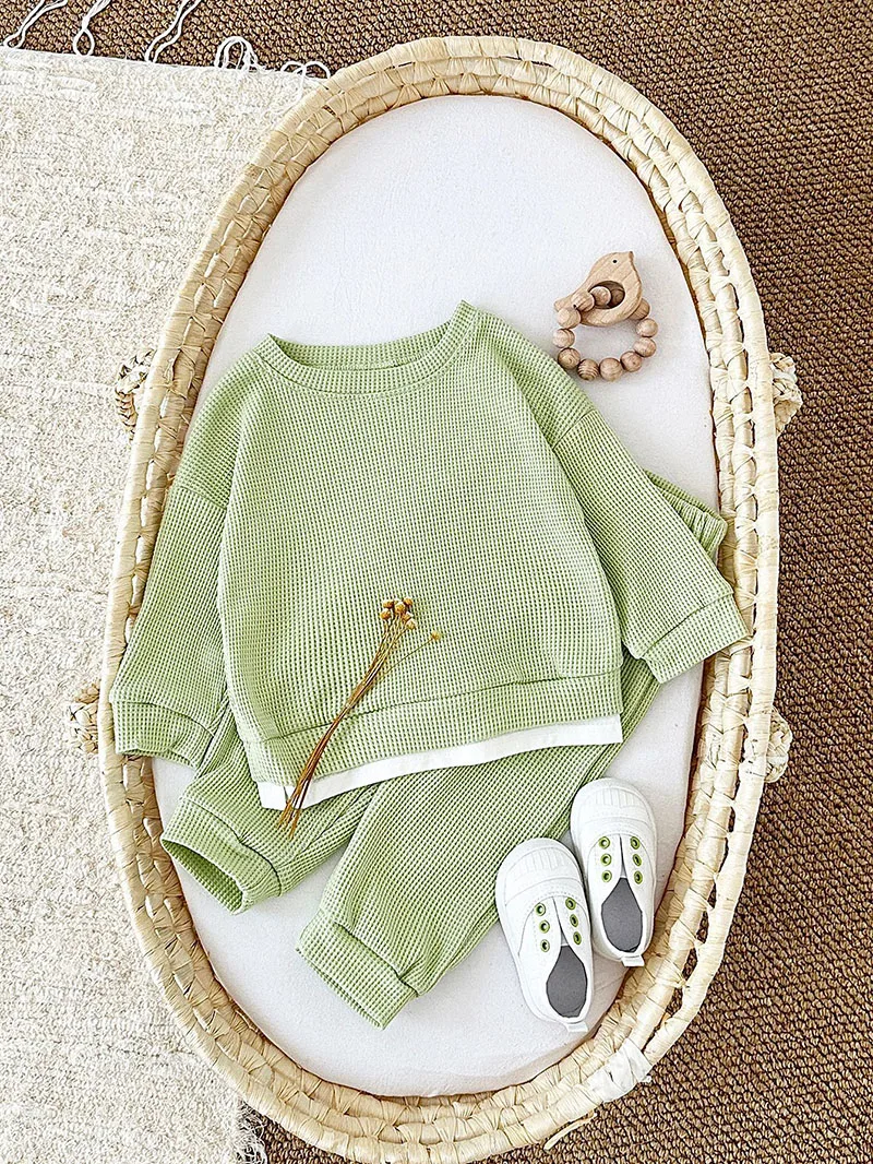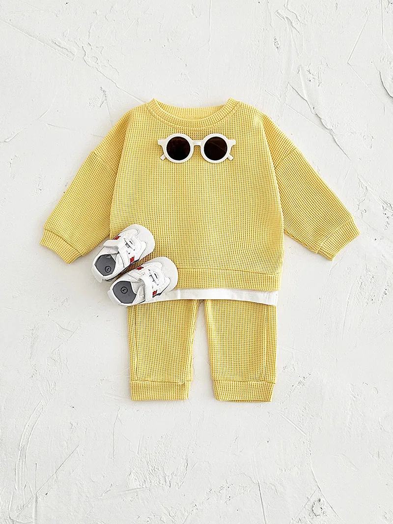 MQTIME  -  New Spring Baby Waffle Clothes Set Cute Kids Boys Solid Color Hoodie +Sweat Pants Toddler Color Block Outfit