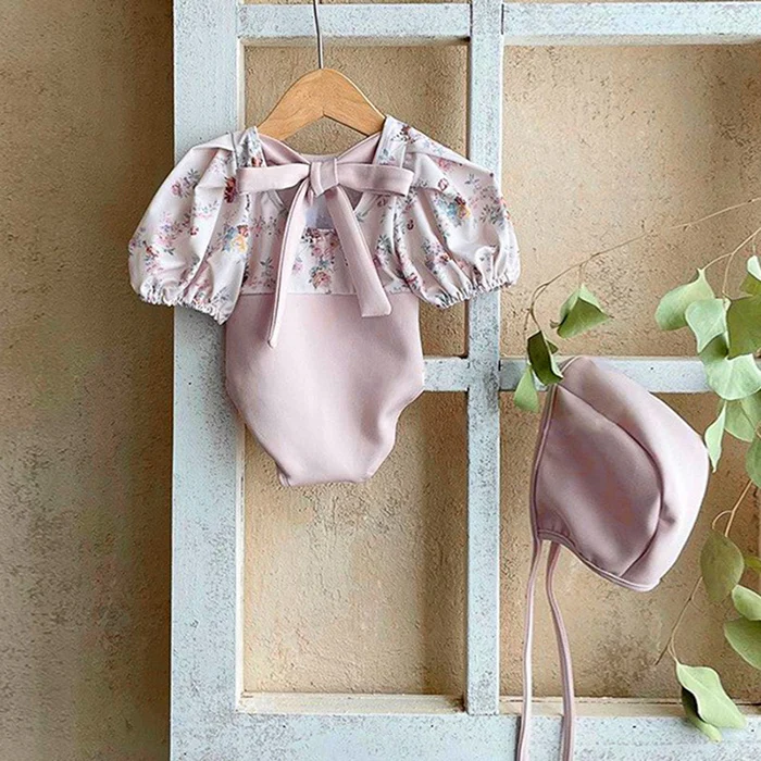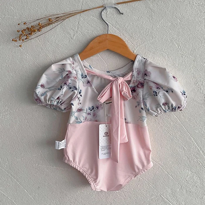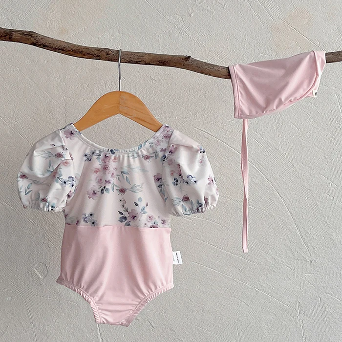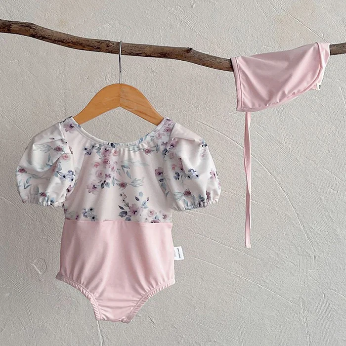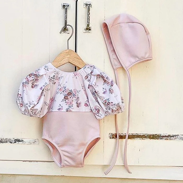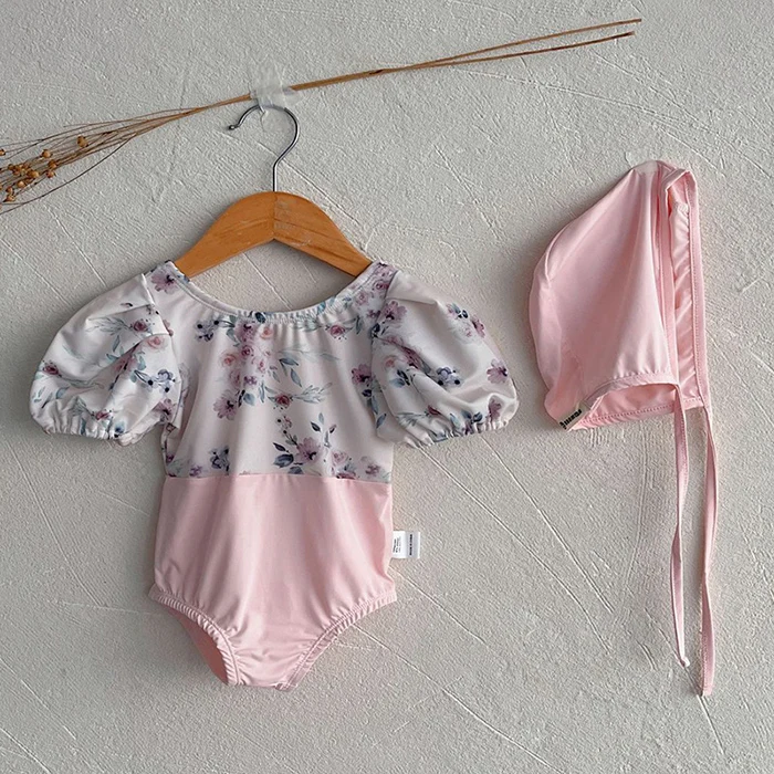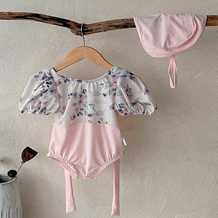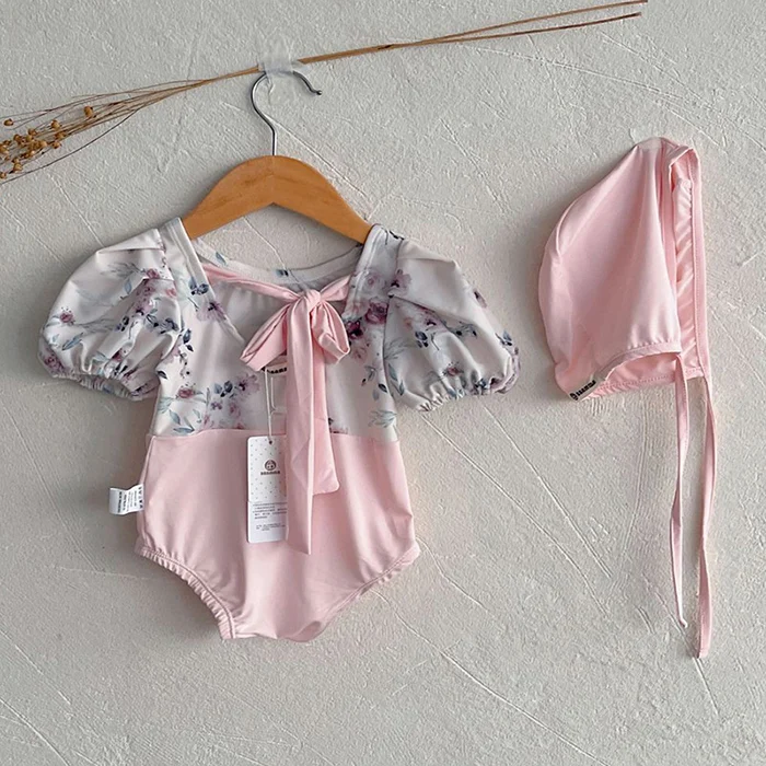 MQTIME - New Summer Baby Girls One Piece Swimsuit+Hat Short Sleeved Printed Splicing Baby Jumpsuit Swimsuit Children Bikini Swimwear