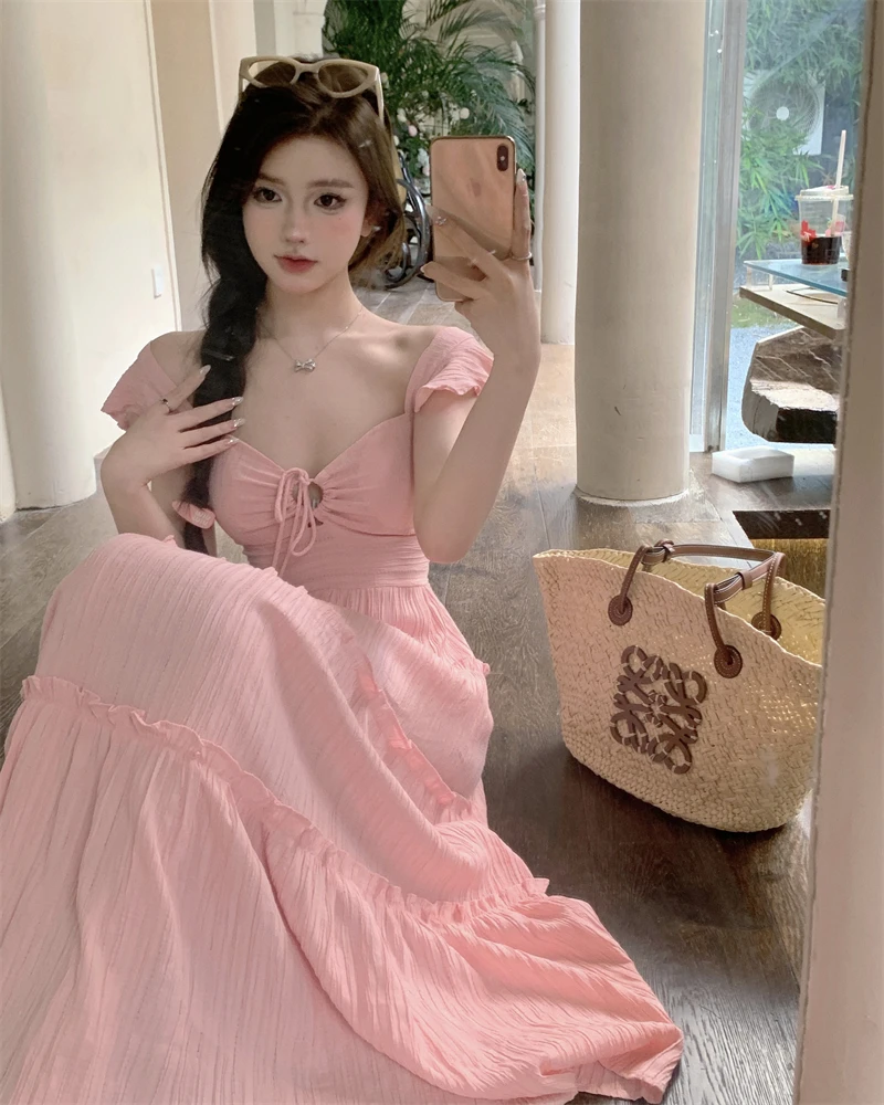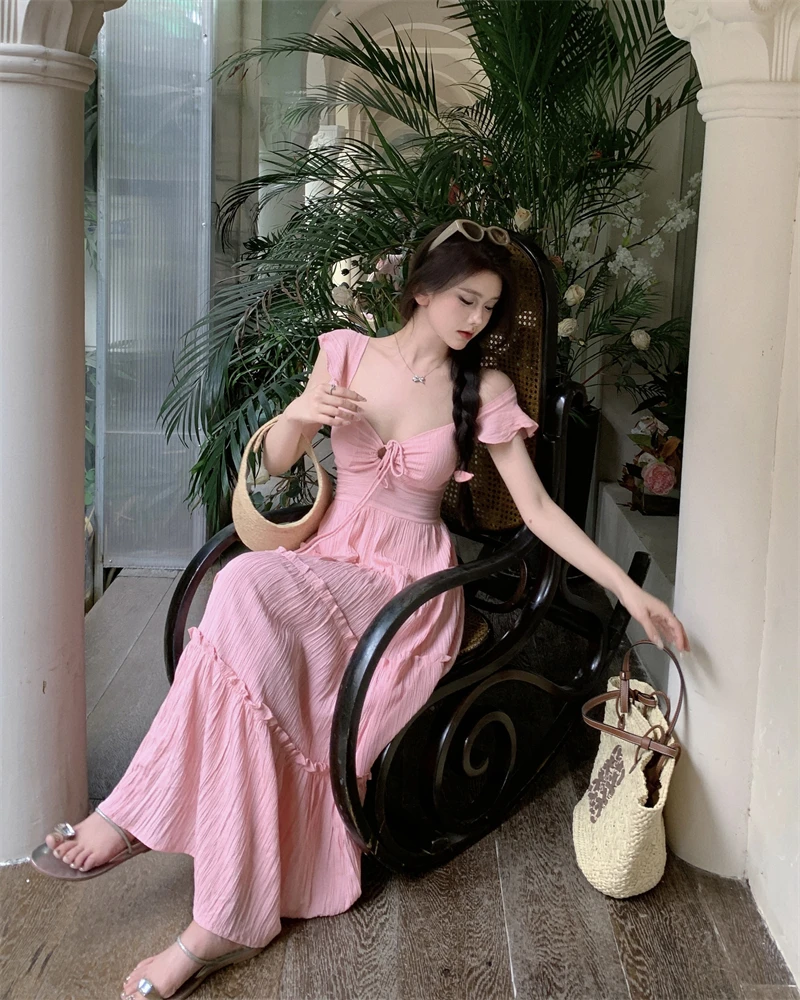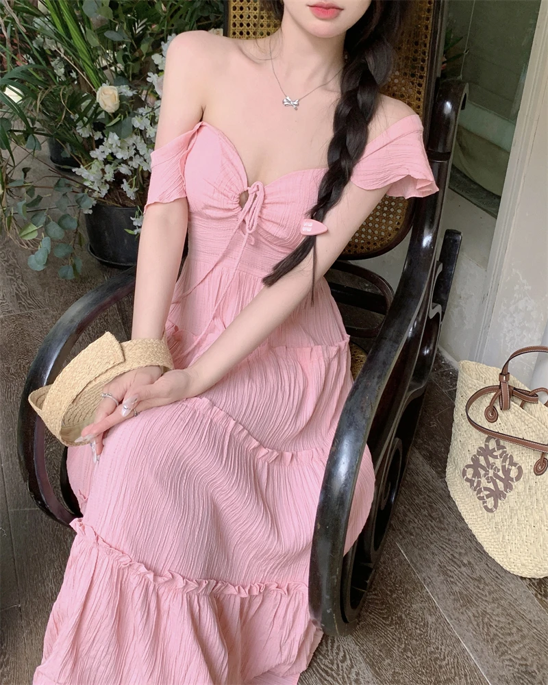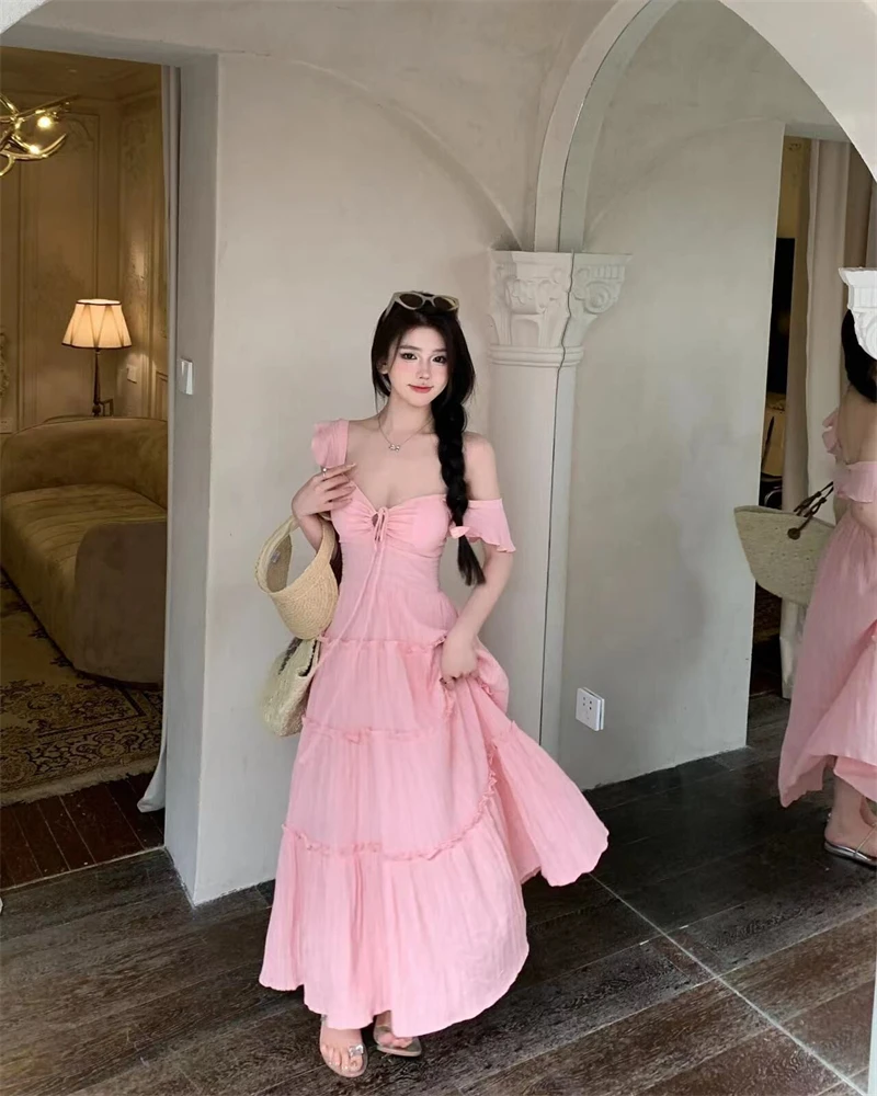 MQTIME - New Summer Long Dresses for Women Off Shoulder A-line Ruched Korean Fashion Holiday Beach Style Sexy Party Dress Robe Vestido