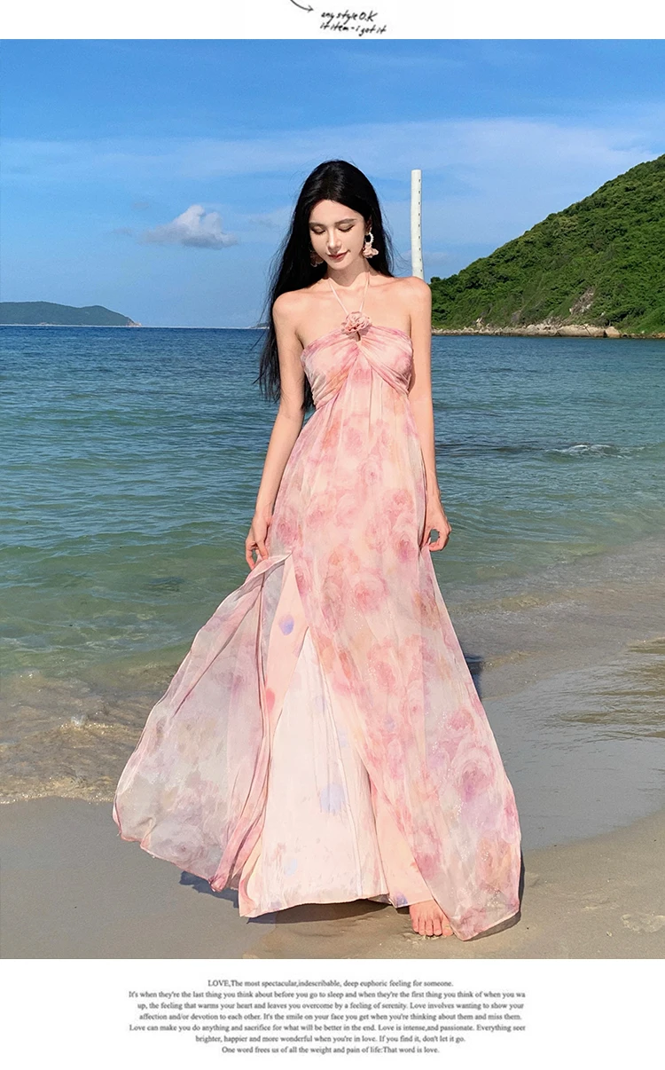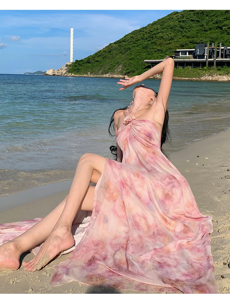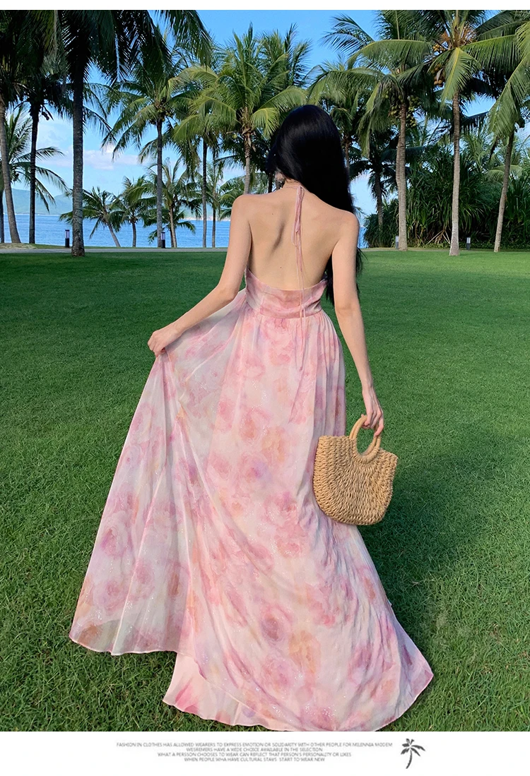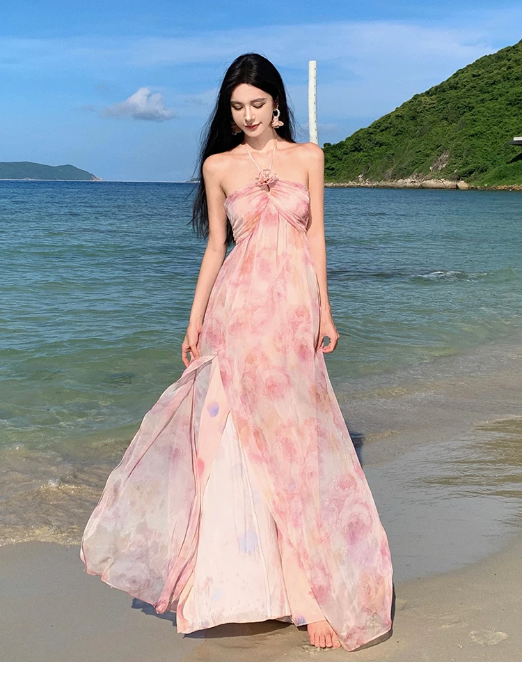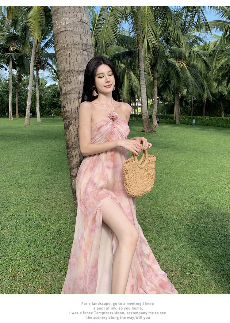 MQTIME  -  New Summer Pink Print Split Beach Dresses For Women Flower Halter-Neck Holiday Long Dress  French Elegant Female Clothes 2024