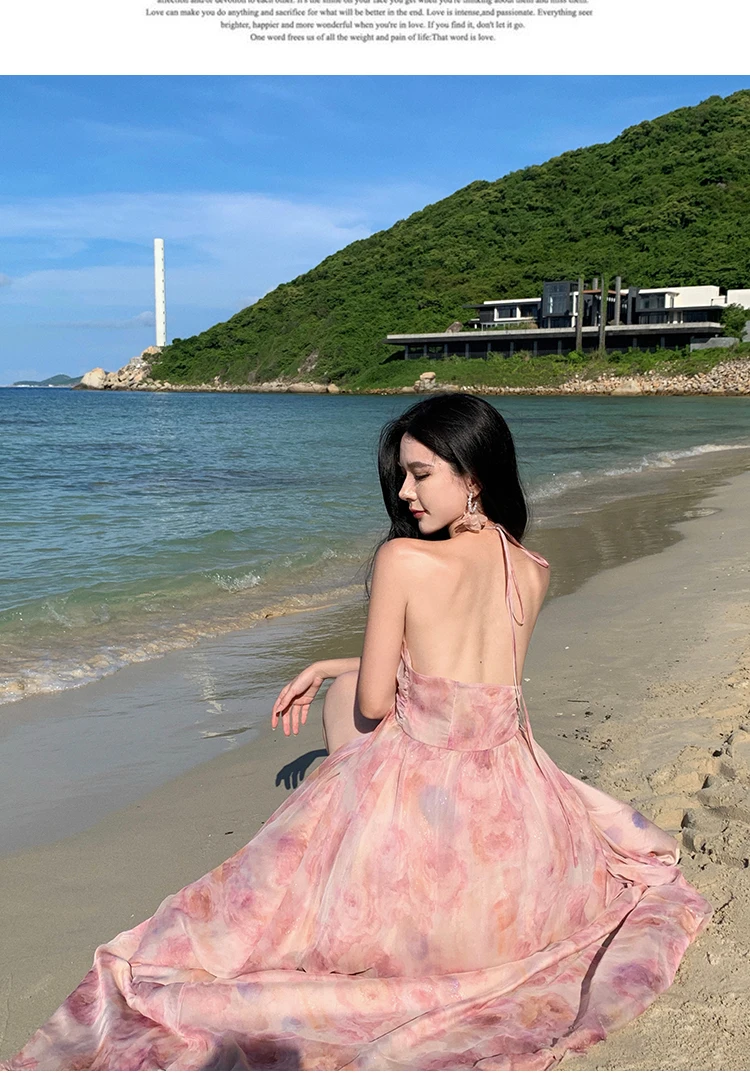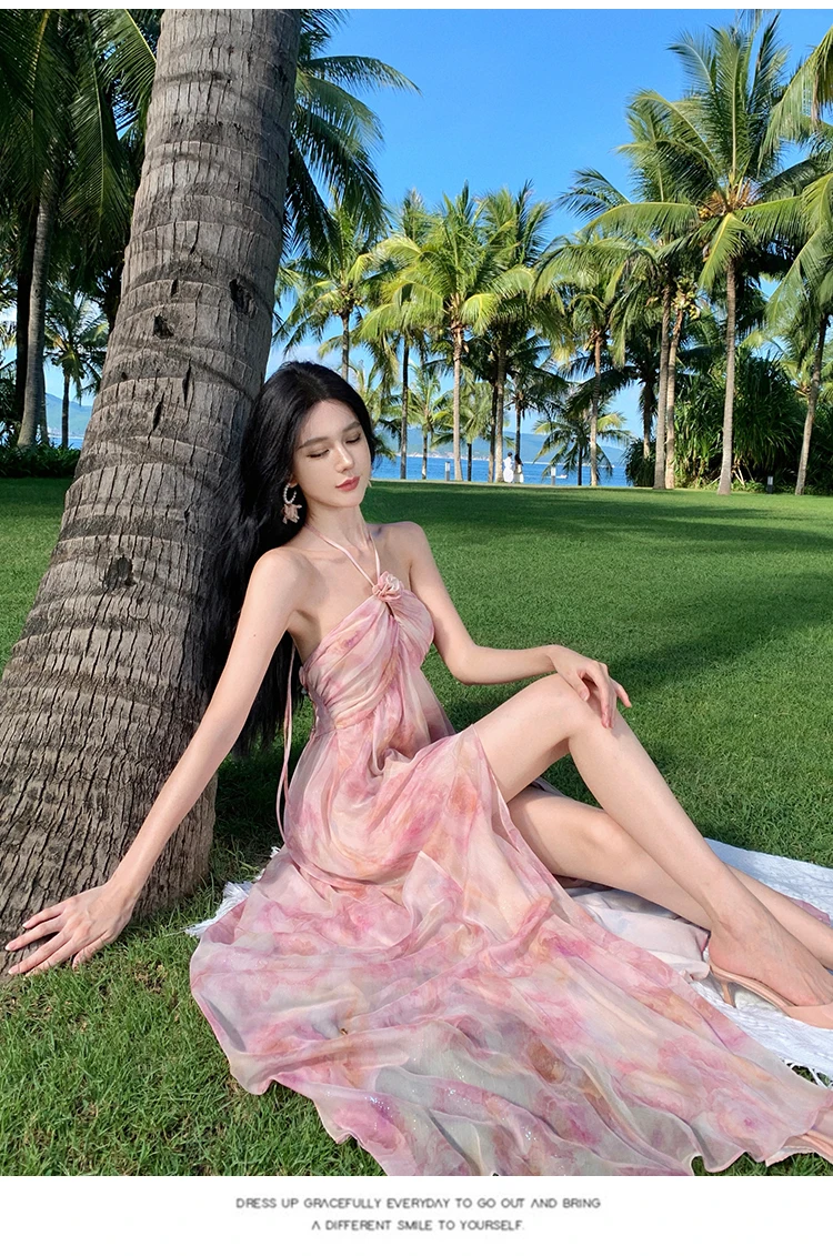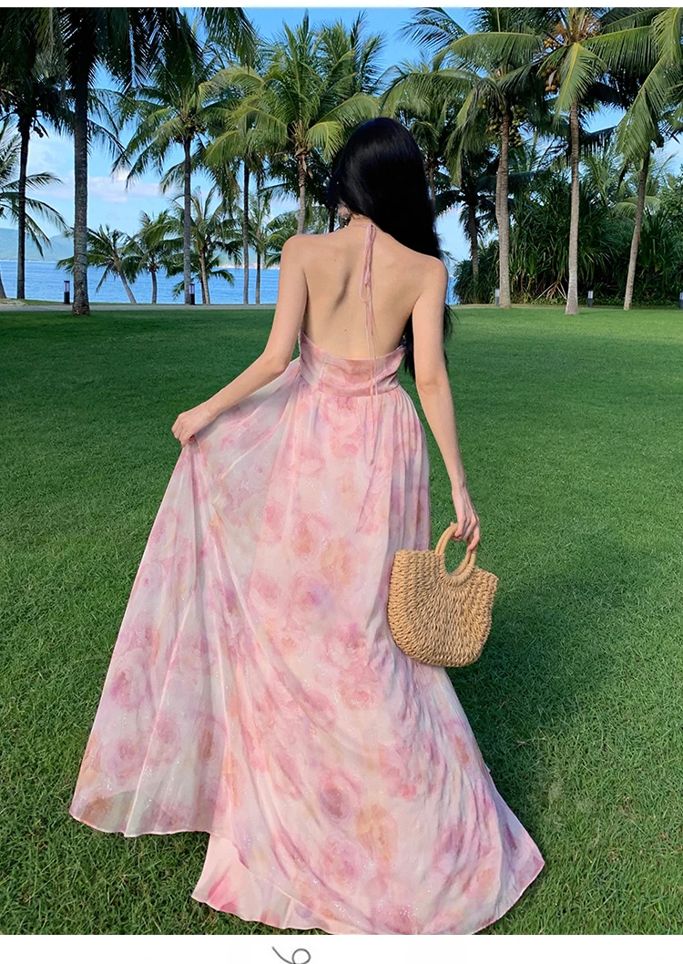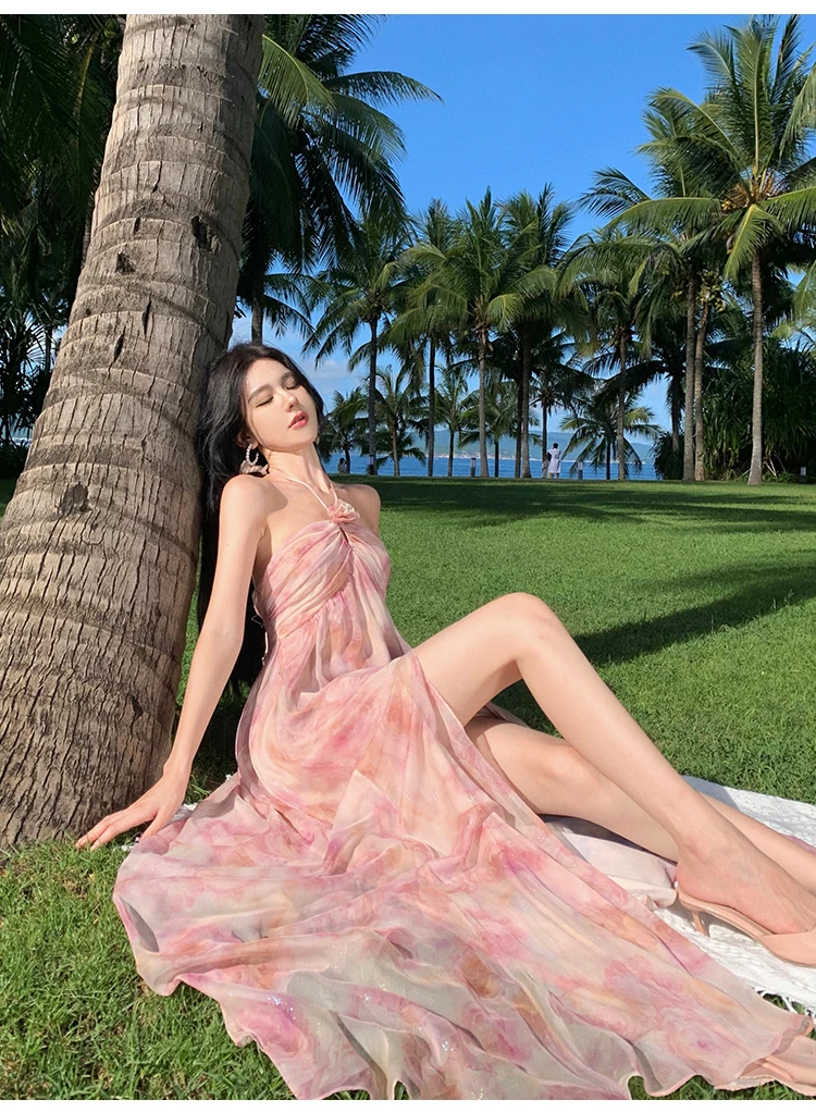 MQTIME  -  New Summer Pink Print Split Beach Dresses For Women Flower Halter-Neck Holiday Long Dress  French Elegant Female Clothes 2024