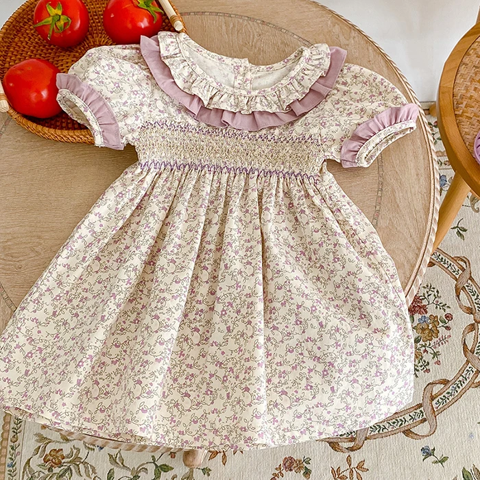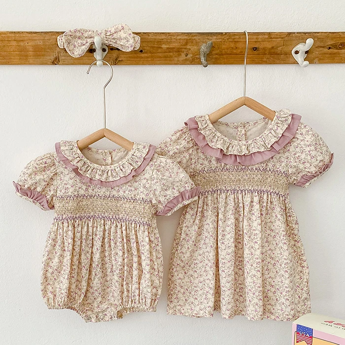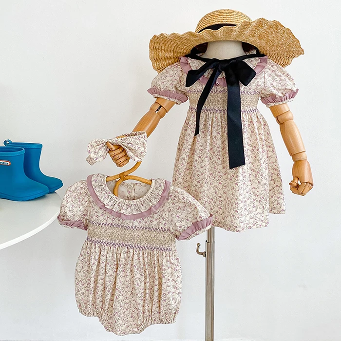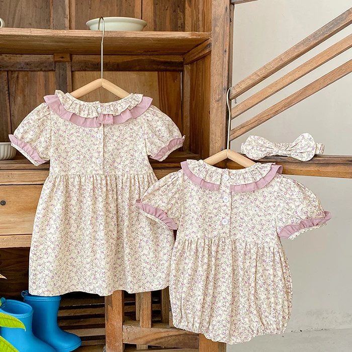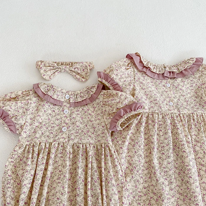 MQTIME - New Summer Sisters Clothes 2-6Yrs Girls Princess Dress Short Sleeved Cotton Floral Printing Kids Party Dresses