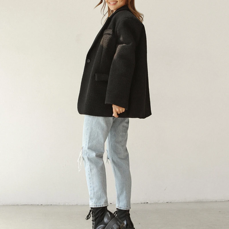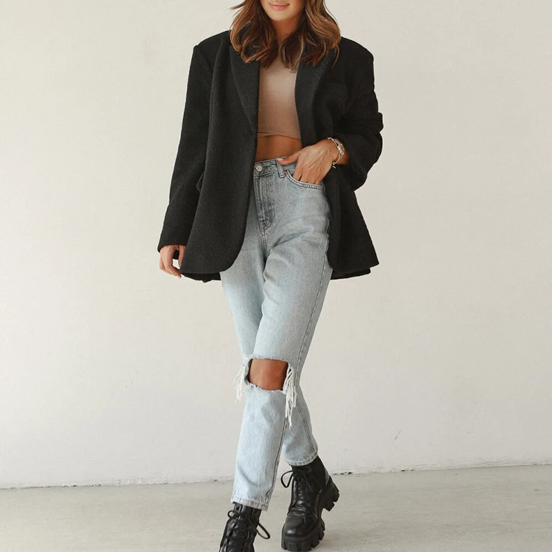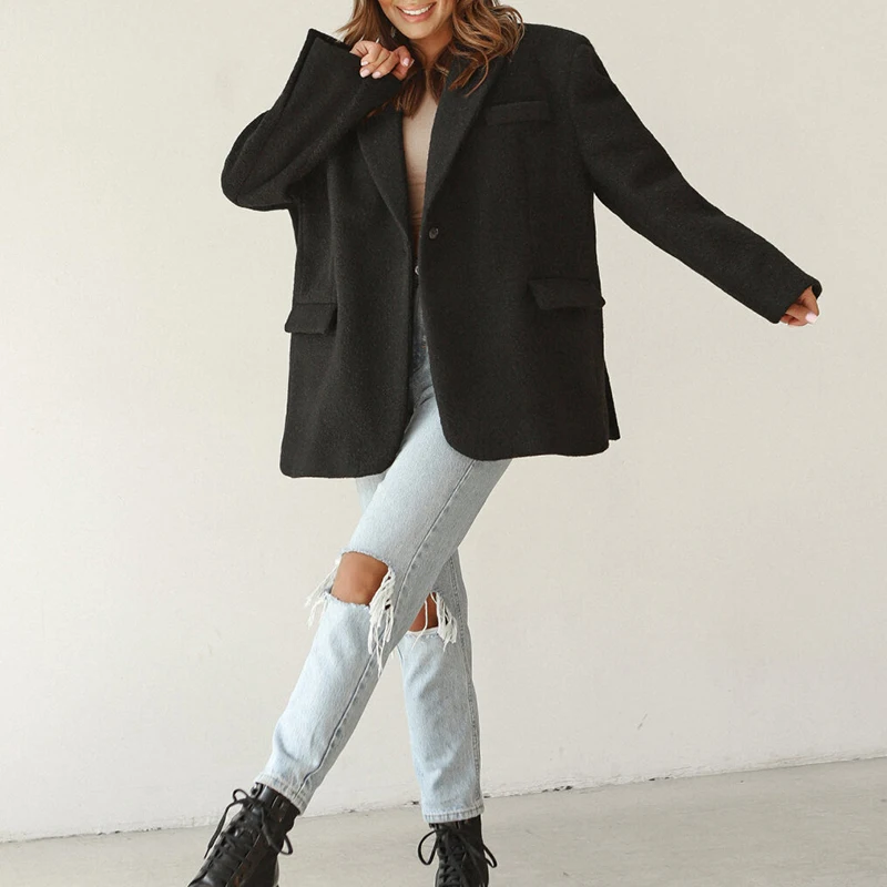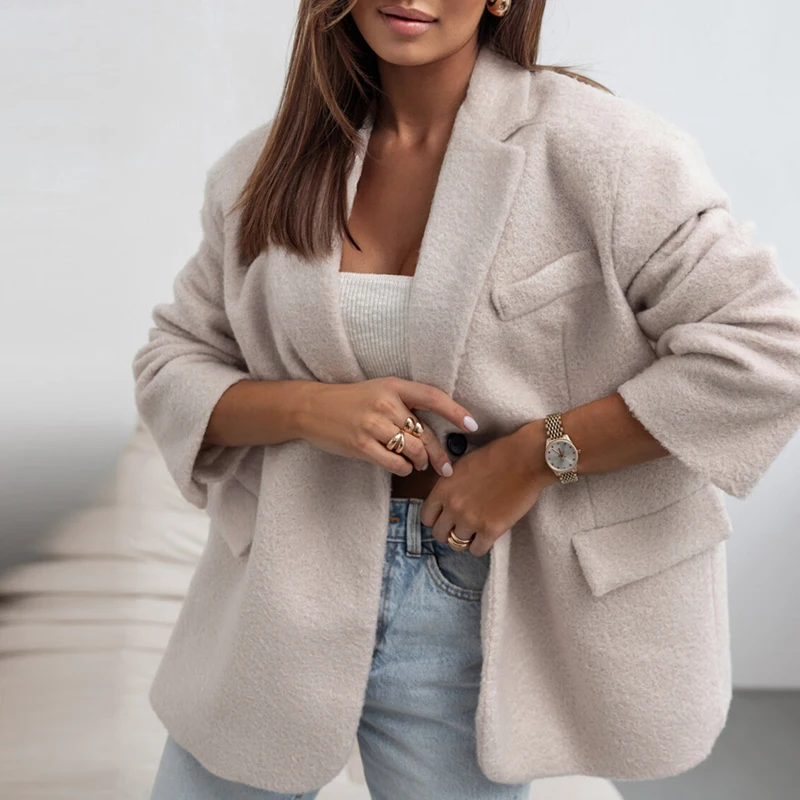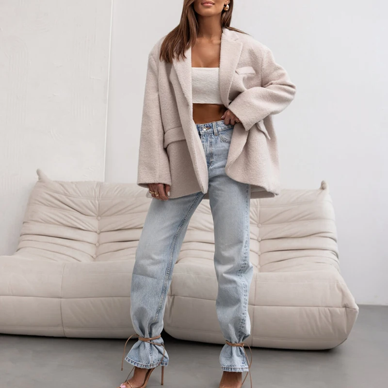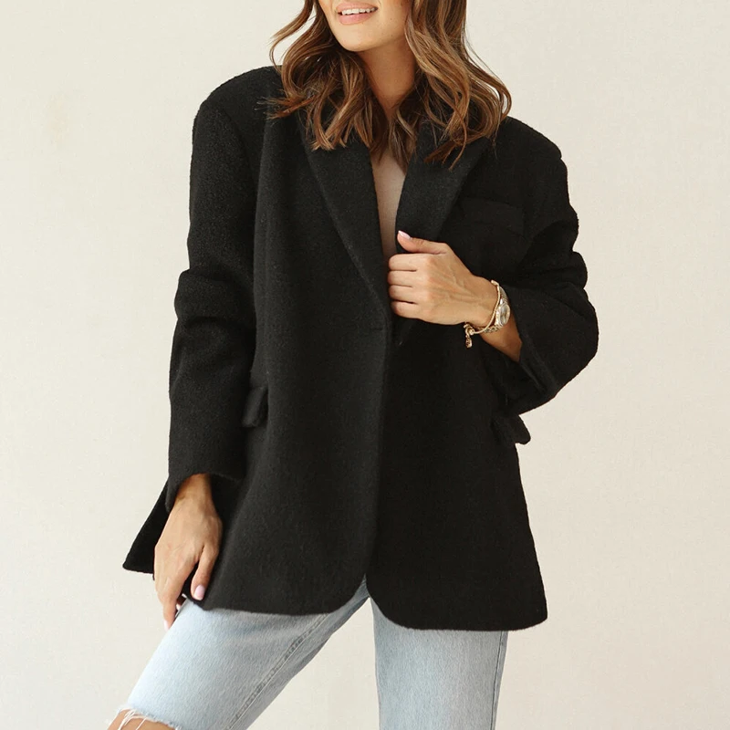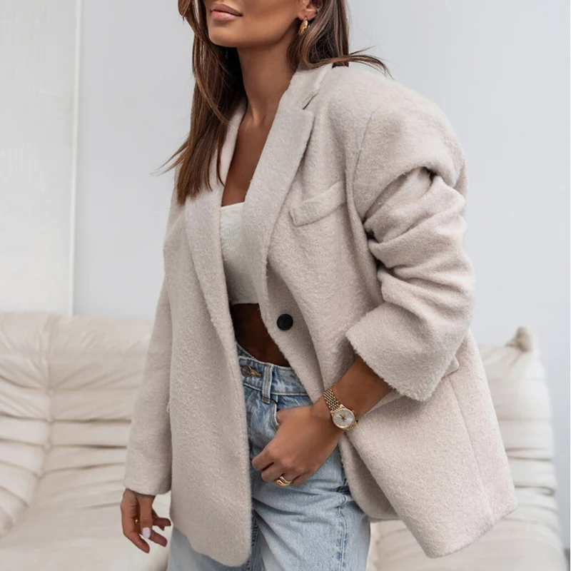MQTIME - Office Ladies Lapel Button Blazer Coat Fashion Loose Pocket Solid Outwear Spring Casual High Street Long Sleeved Woolen Jacket