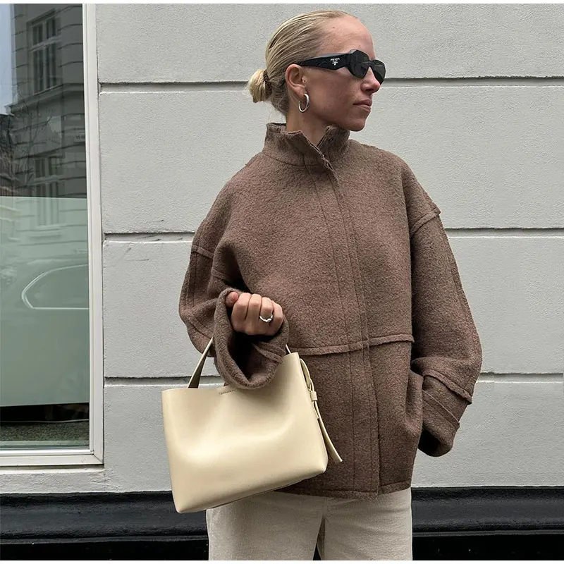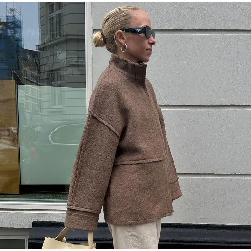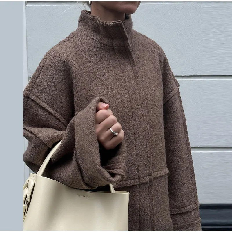 Mqtime Patchwork Woolen Jackets For Women Turtleneck Long Sleeve Zipper Oversized Overcoat Autumn Streetwear Lady Jacket