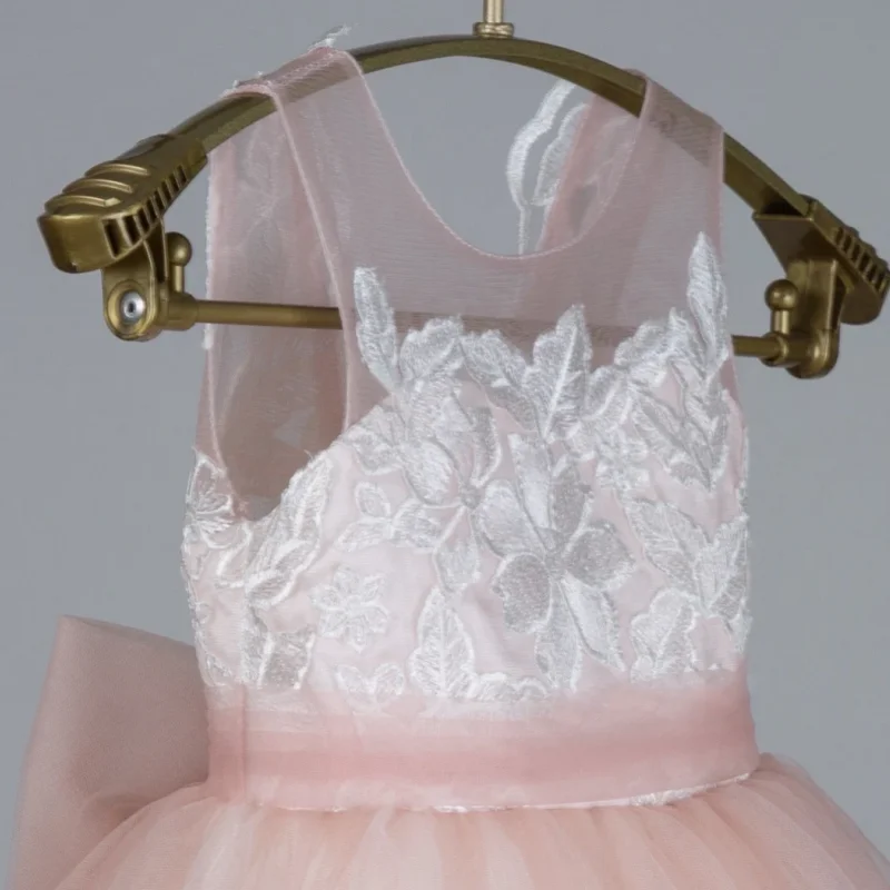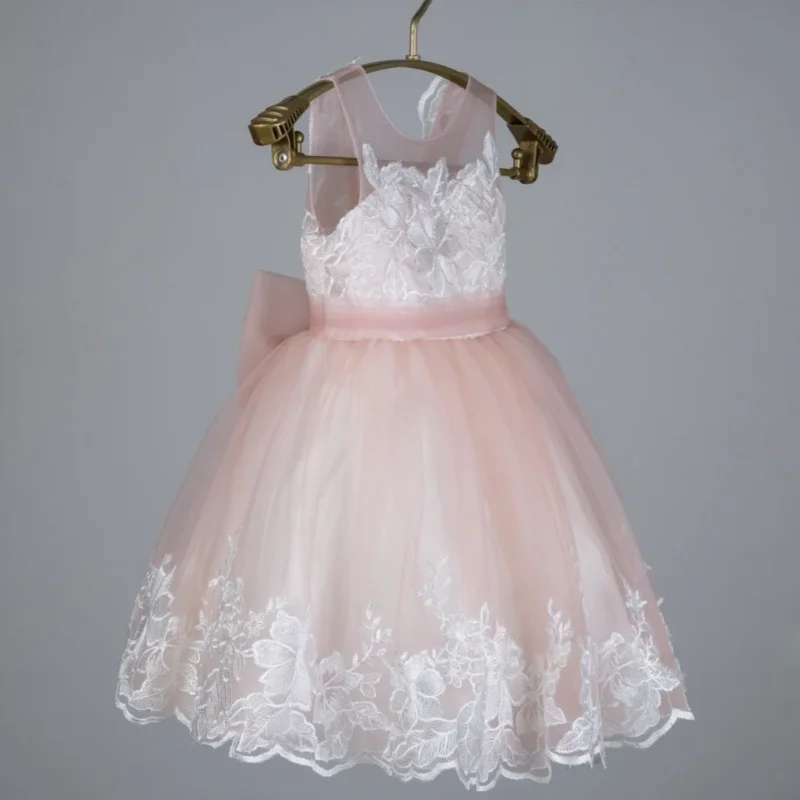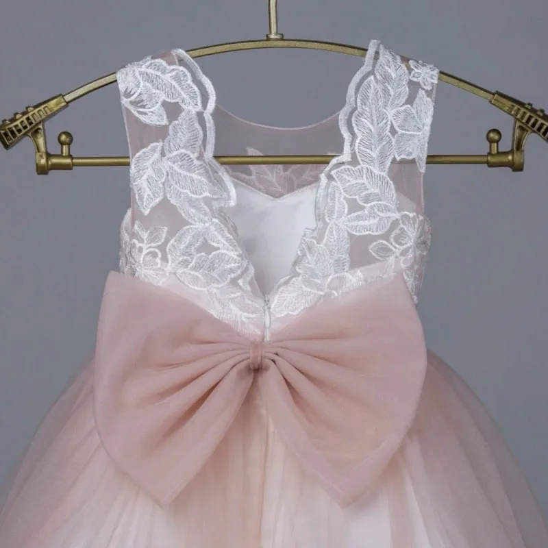 MQTIME - Pink Flower Girl Dress Tulle White Flory Appliques With Bow Sleeveless For Wedding Birthday Formal Prom Holy Communion Gowns