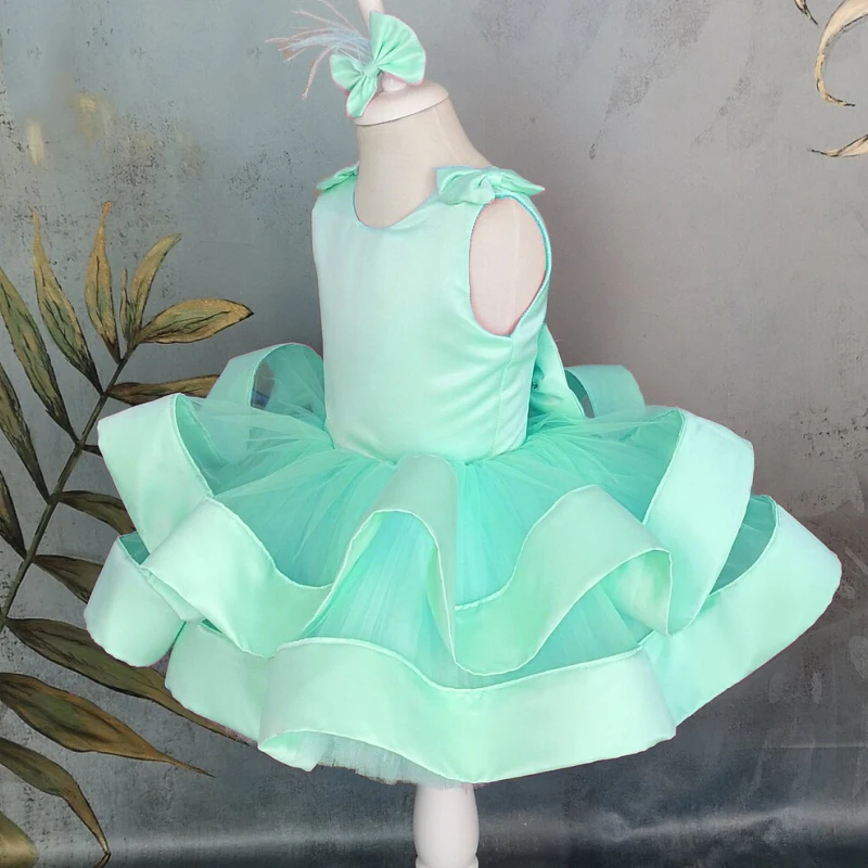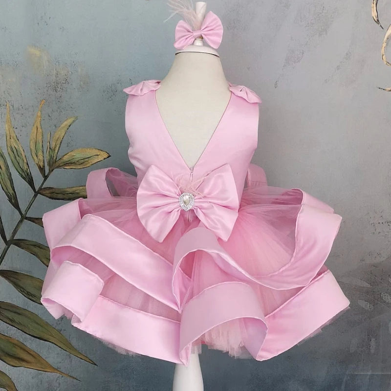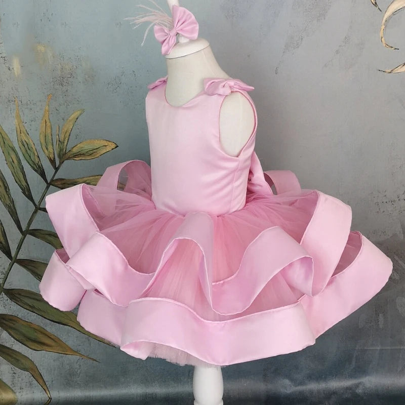 MQTIME Pink Flower Girl Dresses Satin Tulle Tiered With Bow Sleeveless For Wedding Birthday Party First Communion Gowns
