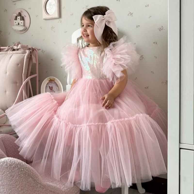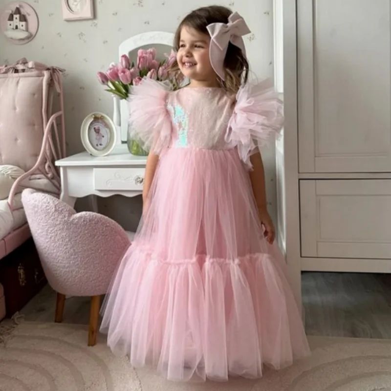 MQTIME - Pink Flower Girl Dresses Tulle Puffy Sequin Short Sleeve For Wedding Birthday Party Banquet Holy Communion Gowns