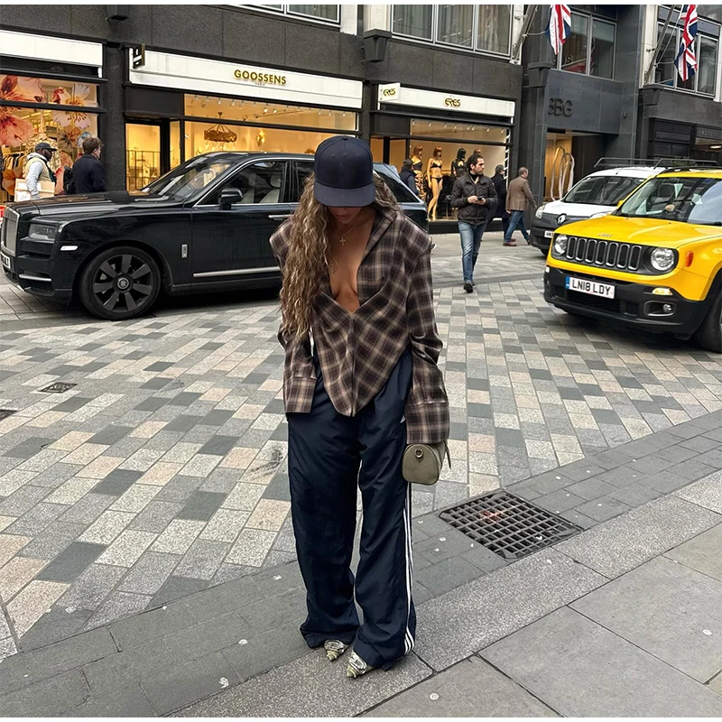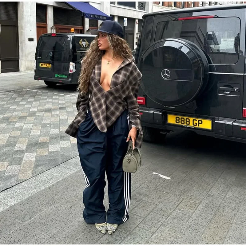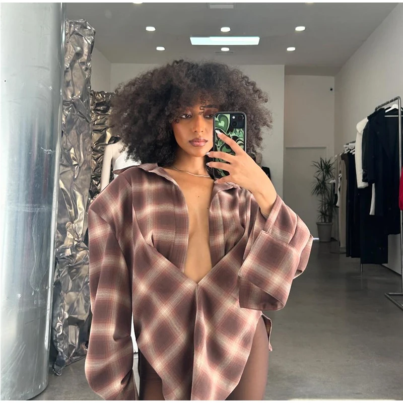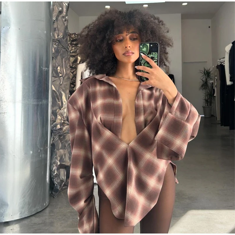 MQTIME - Plaid Contrast Collar Irregular Hem Jacket Women Split Single Breasted Shoulder Pads Long Sleeve Street Shirts 2025 Autumn Party