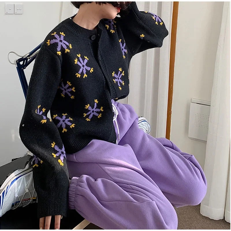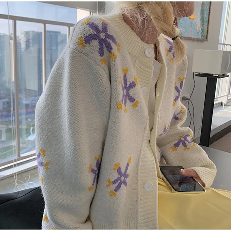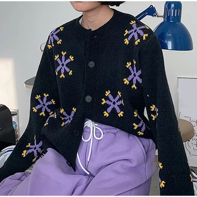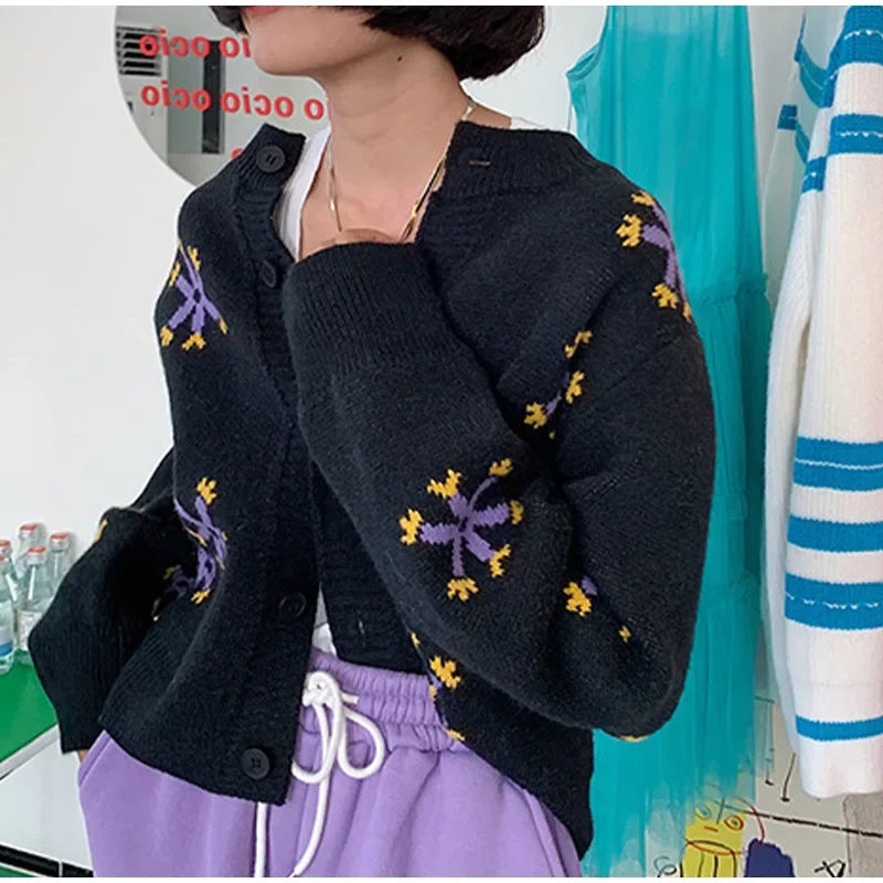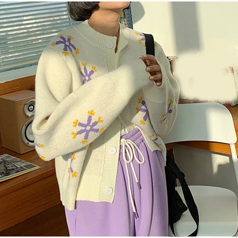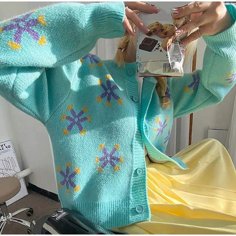 MQTIME - Preppy Style Flower Knit Cardigans Women Sweater V Neck Loose Elegant Femme Autumn Sweet Clothing Print Short Casual Coat Spring