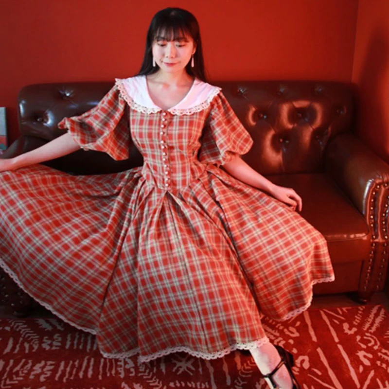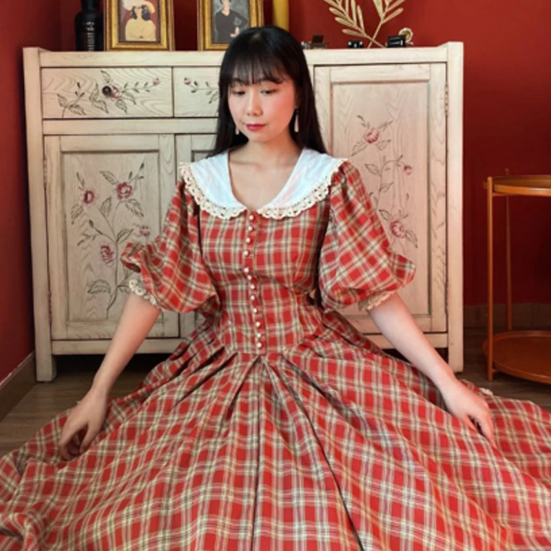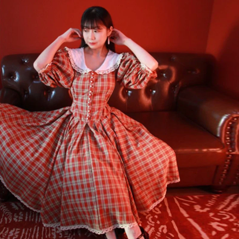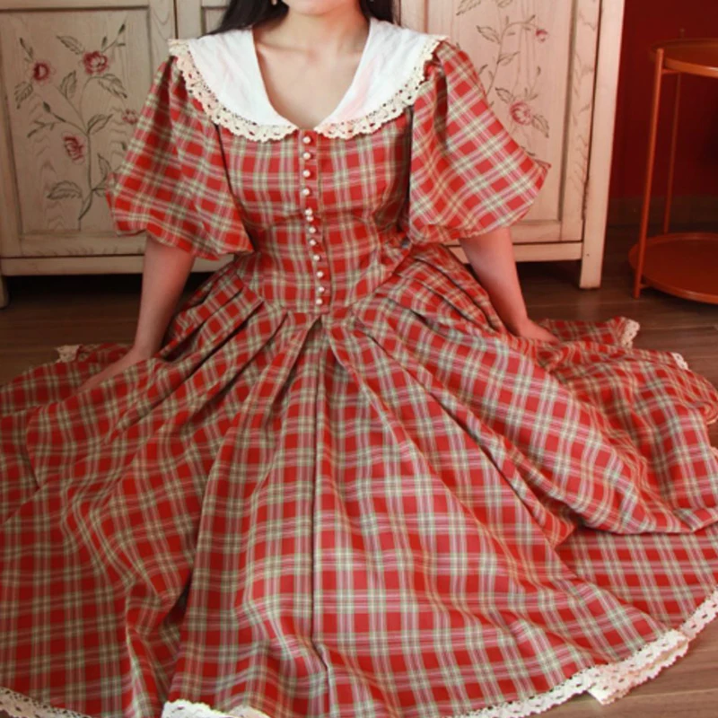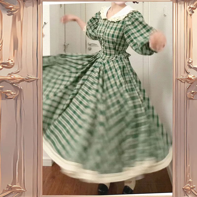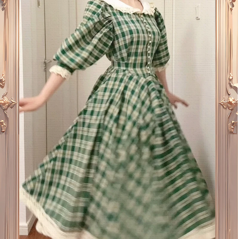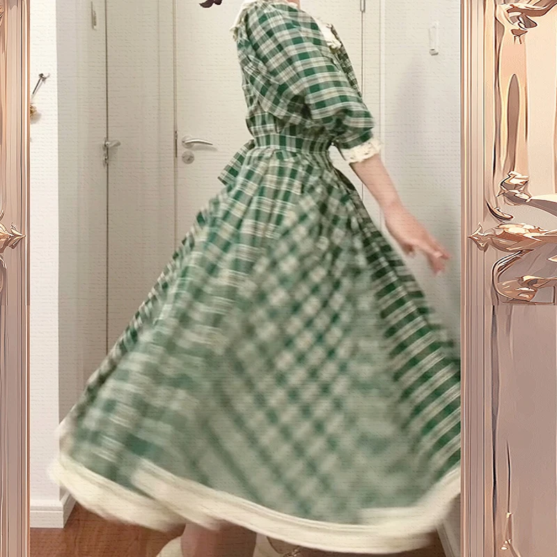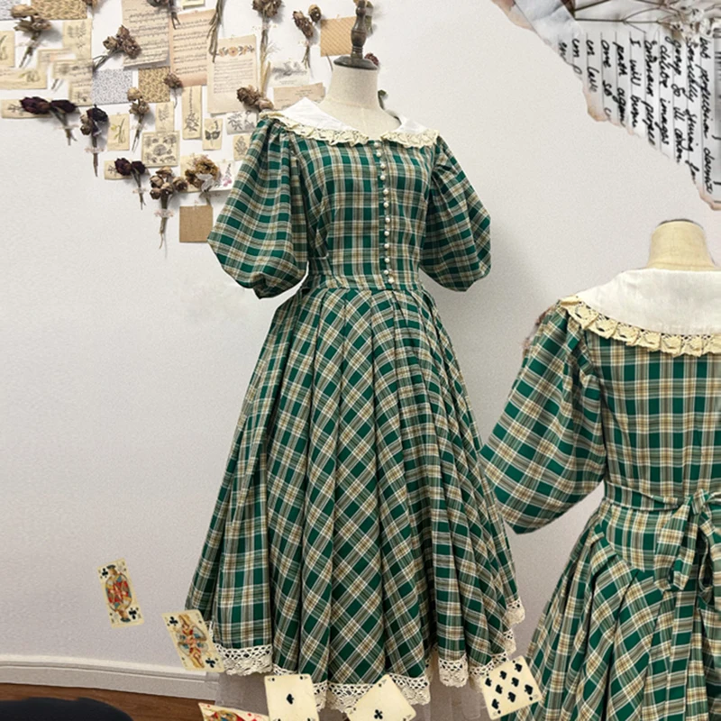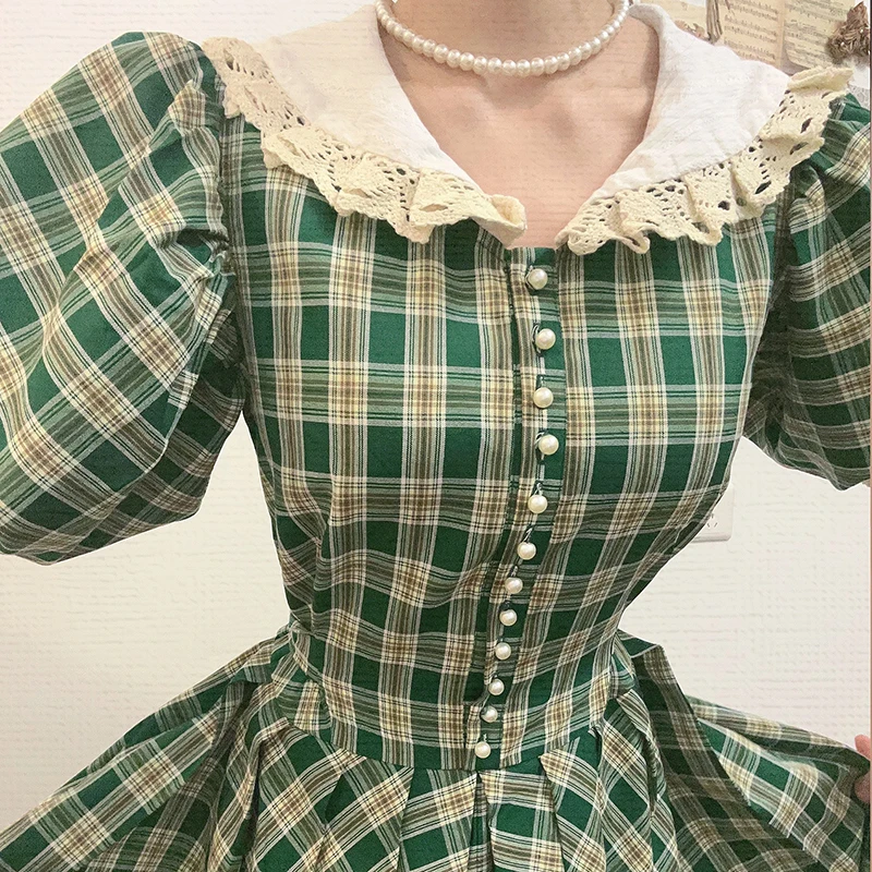 MQTIME - princess Retro French green check white flower lace v neck button short sleeve ruffles bow a line Antique evening dress