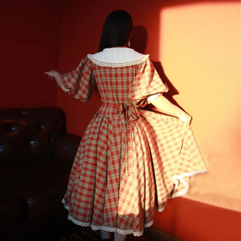 MQTIME - princess Retro French green check white flower lace v neck button short sleeve ruffles bow a line Antique evening dress24.6.6
